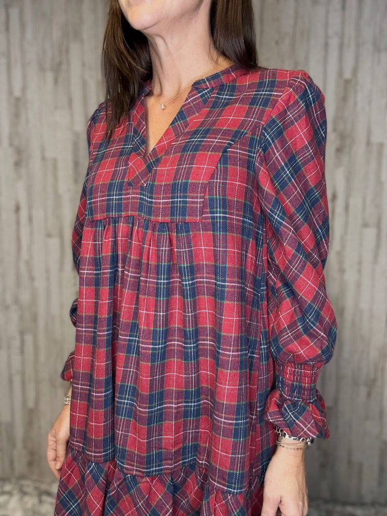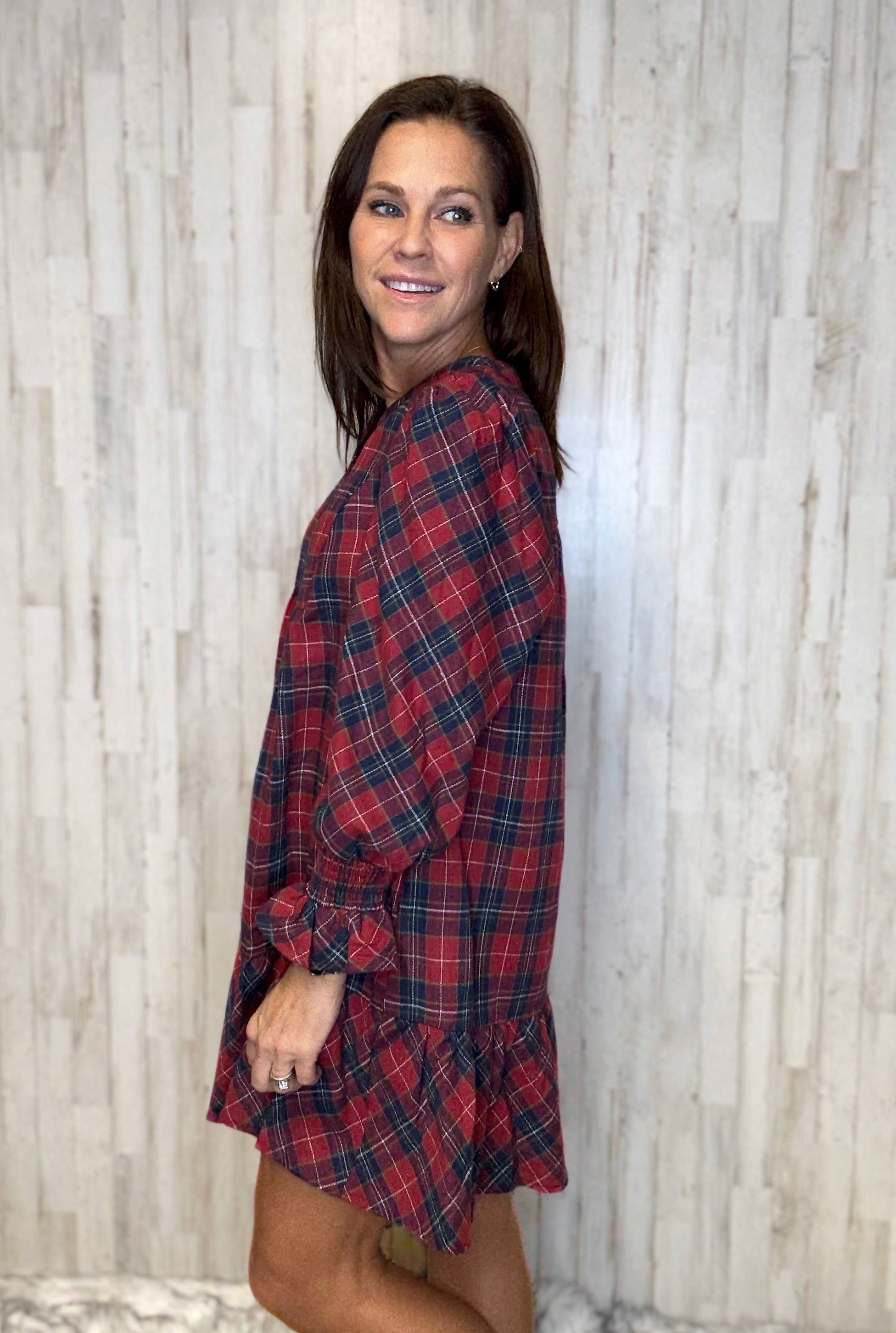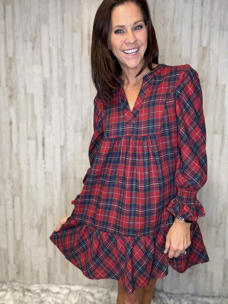 Step out in style with the Blair Plaid Mini Dress, featuring a flirty V-notch and a fun tiered silhouette that adds playful volume. The classic plaid print pairs perfectly with long sleeves finished with smocked cuffs, giving a comfy yet chic vibe. Fully lined for ease and coverage, this dress is your go-to for spirited days and lively nights.