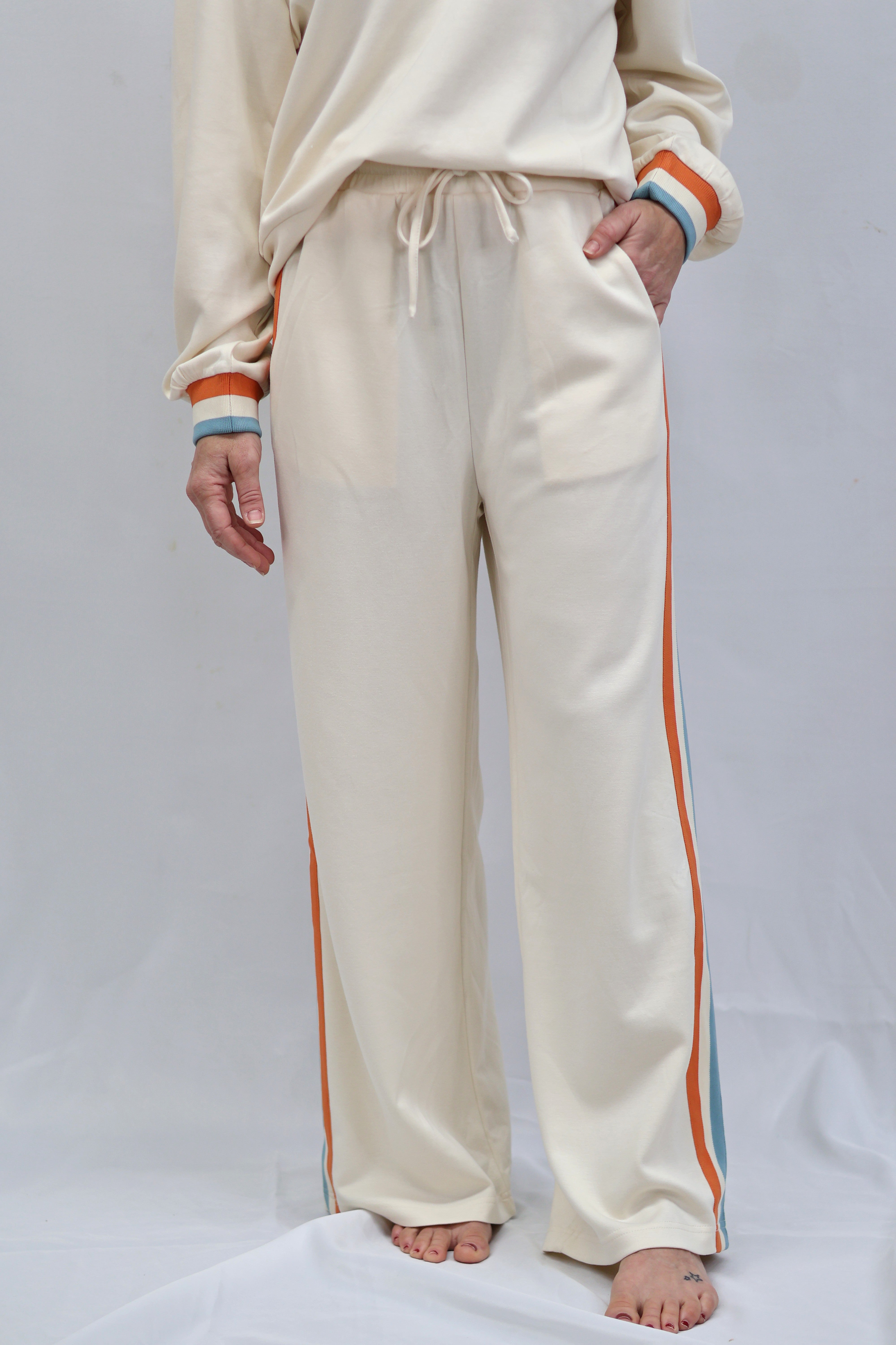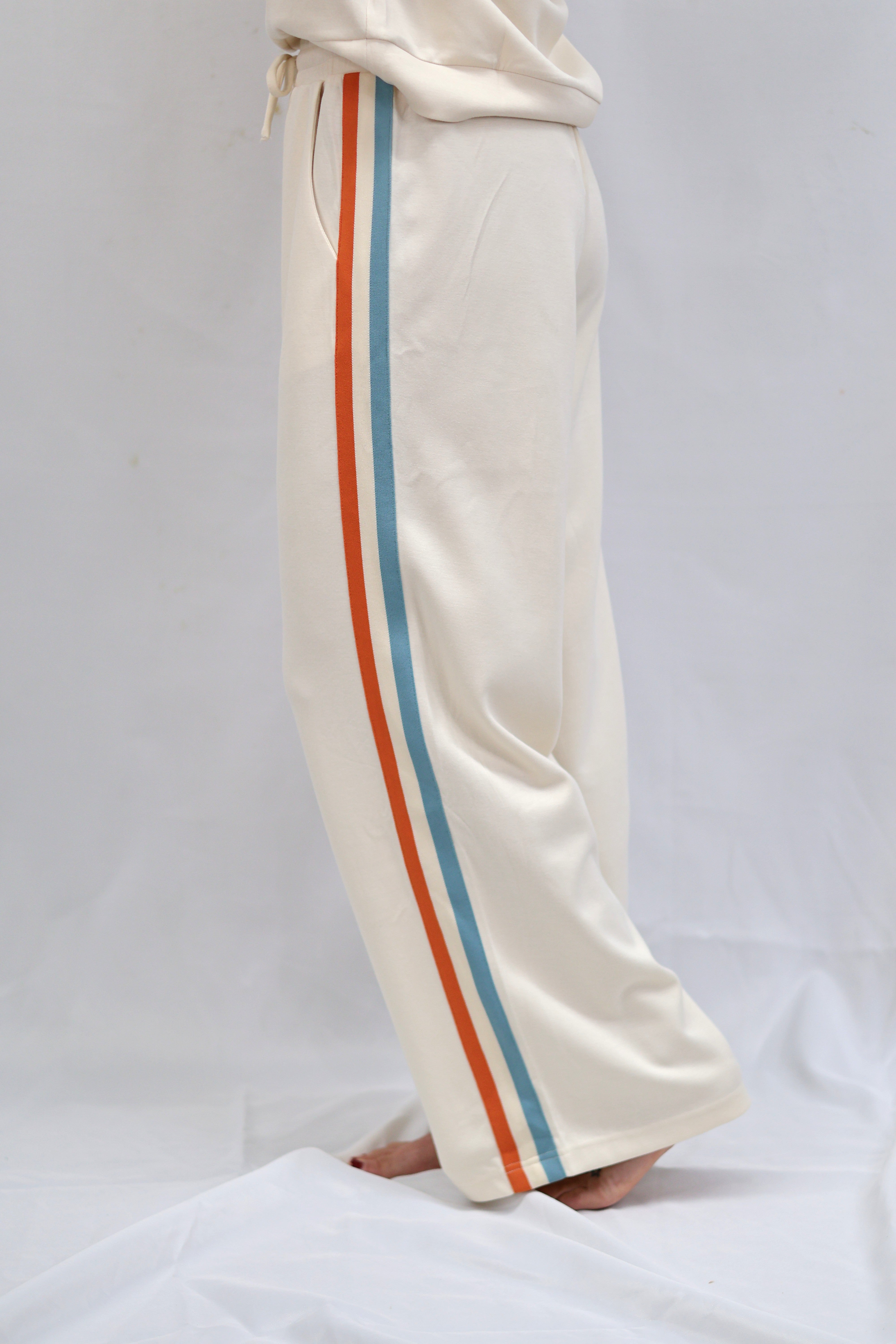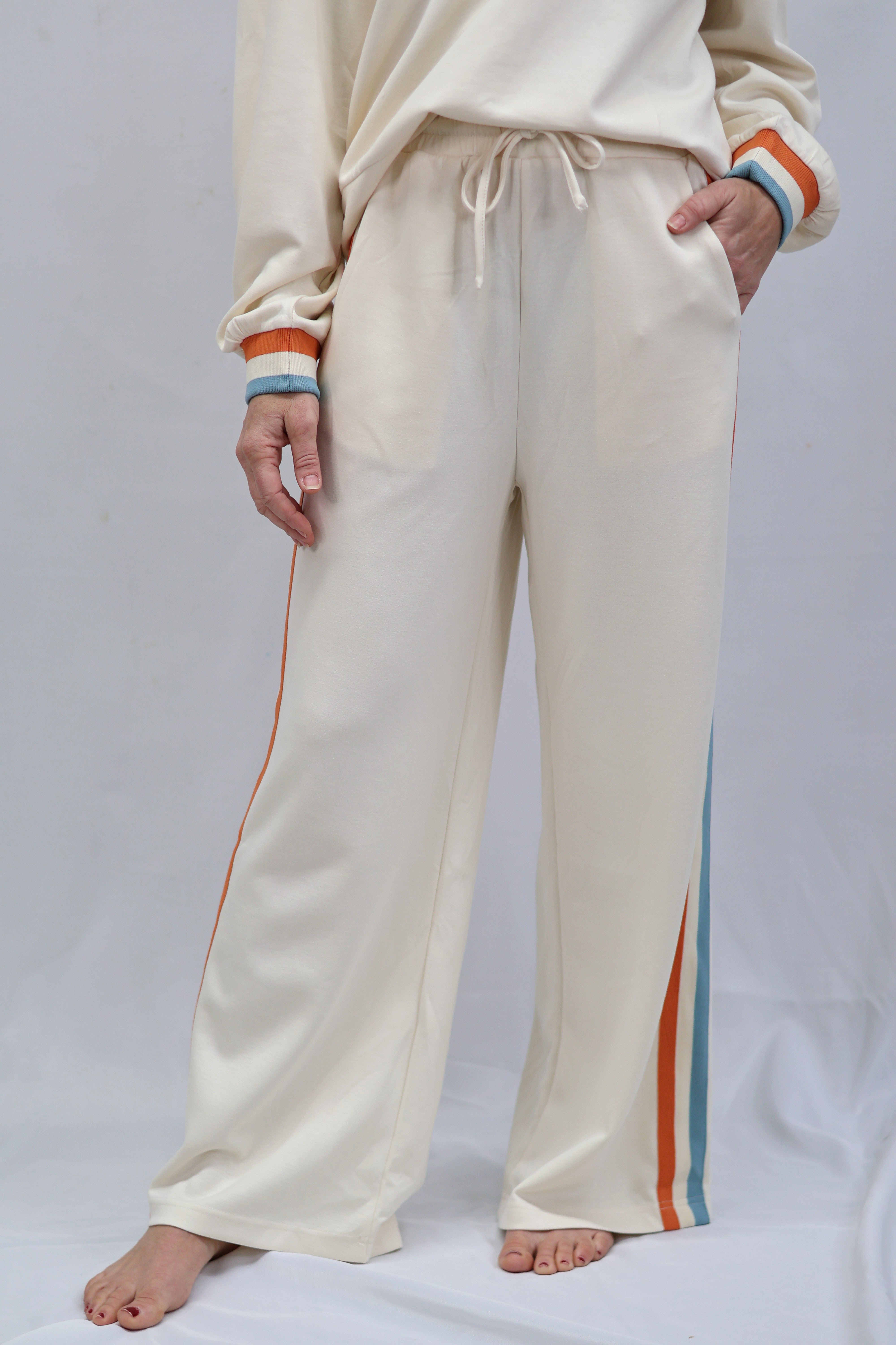 Elevate your casual wardrobe with these refined sweatpants, designed for effortless sophistication. Crafted in a soft cream tone, they feature a practical drawstring waist for a customizable fit and functional side pockets for everyday convenience. The striking side color block trim adds a contemporary edge, transforming loungewear into a polished statement piece. Perfect for transitioning from home to errands with understated elegance.