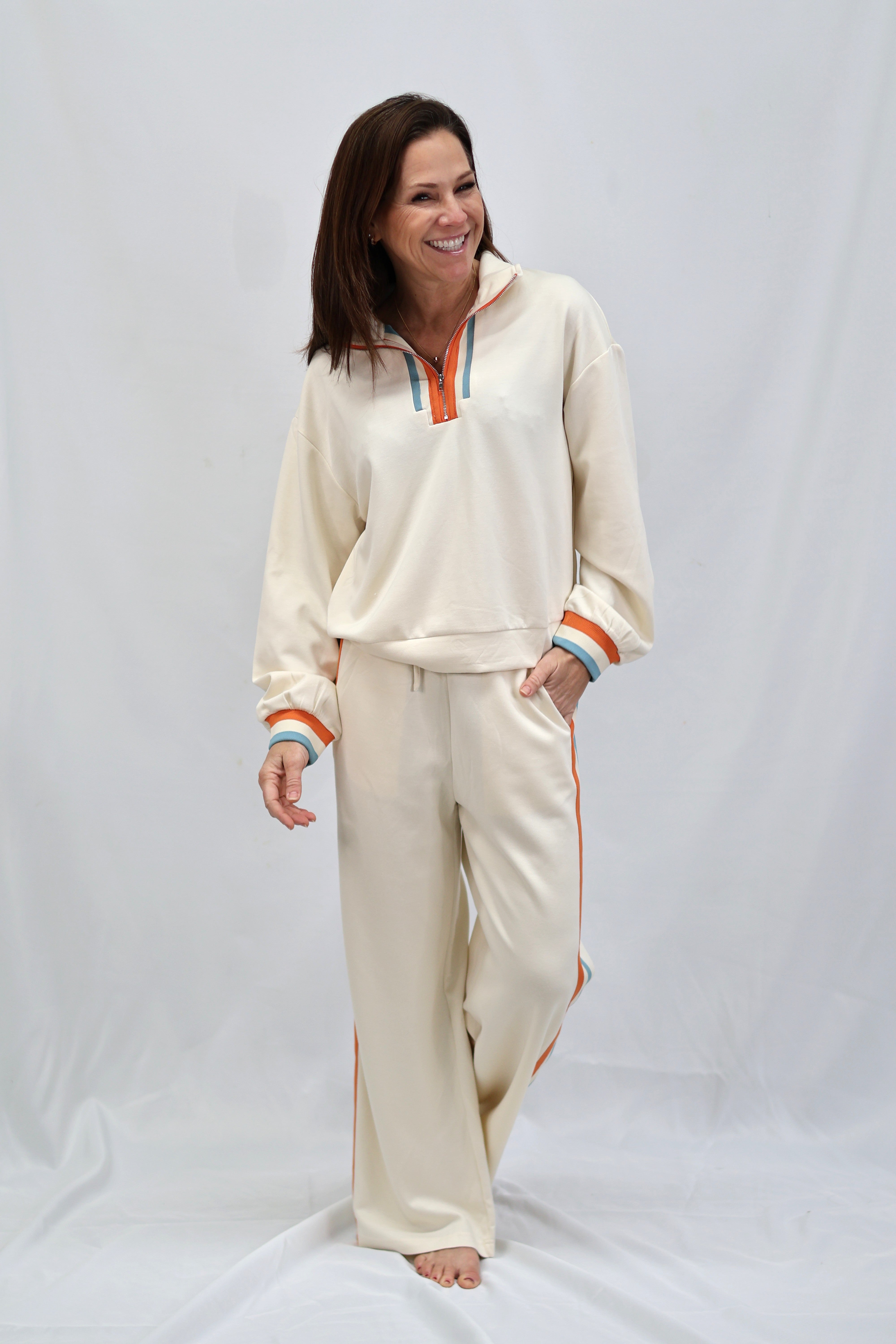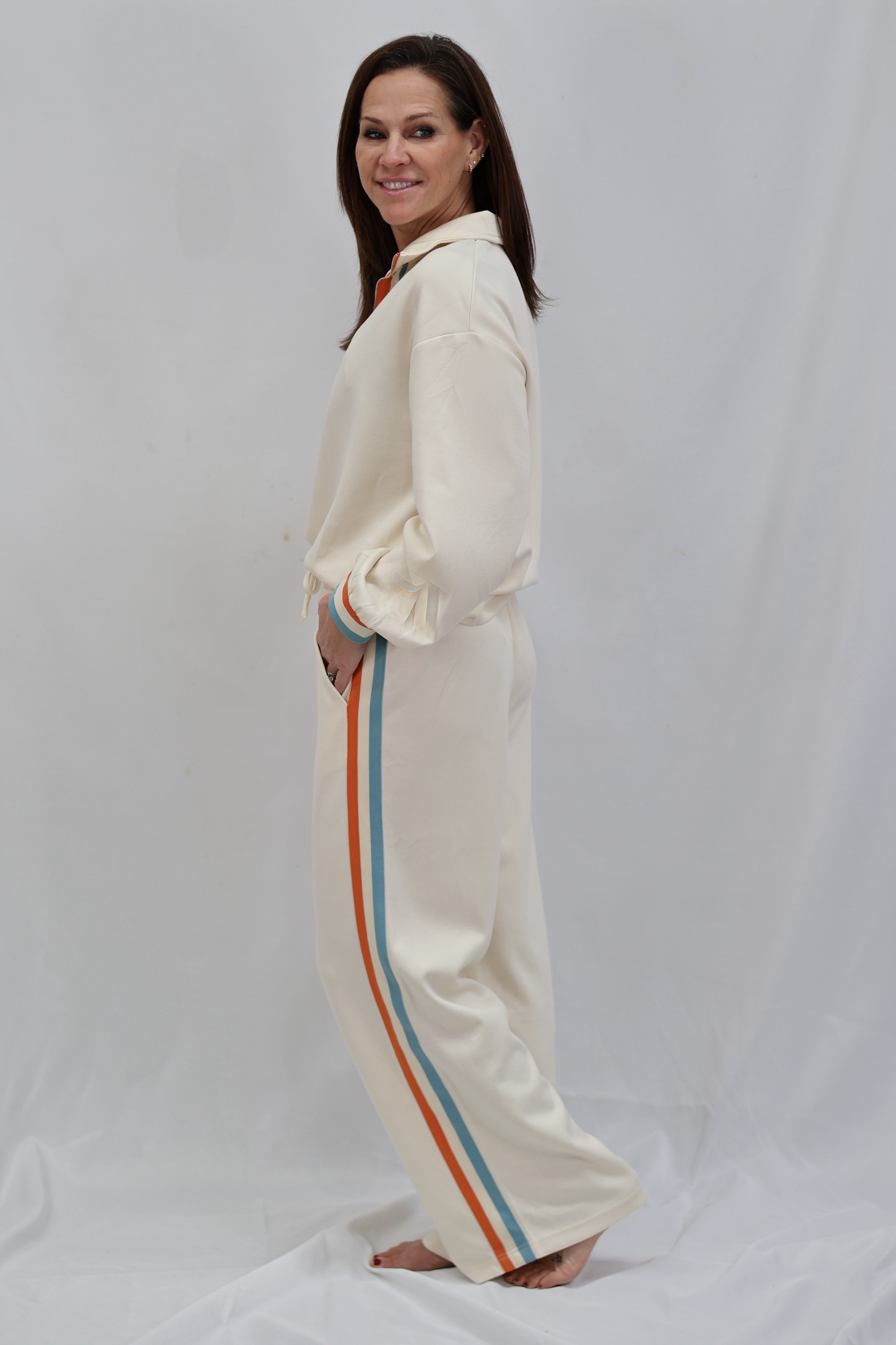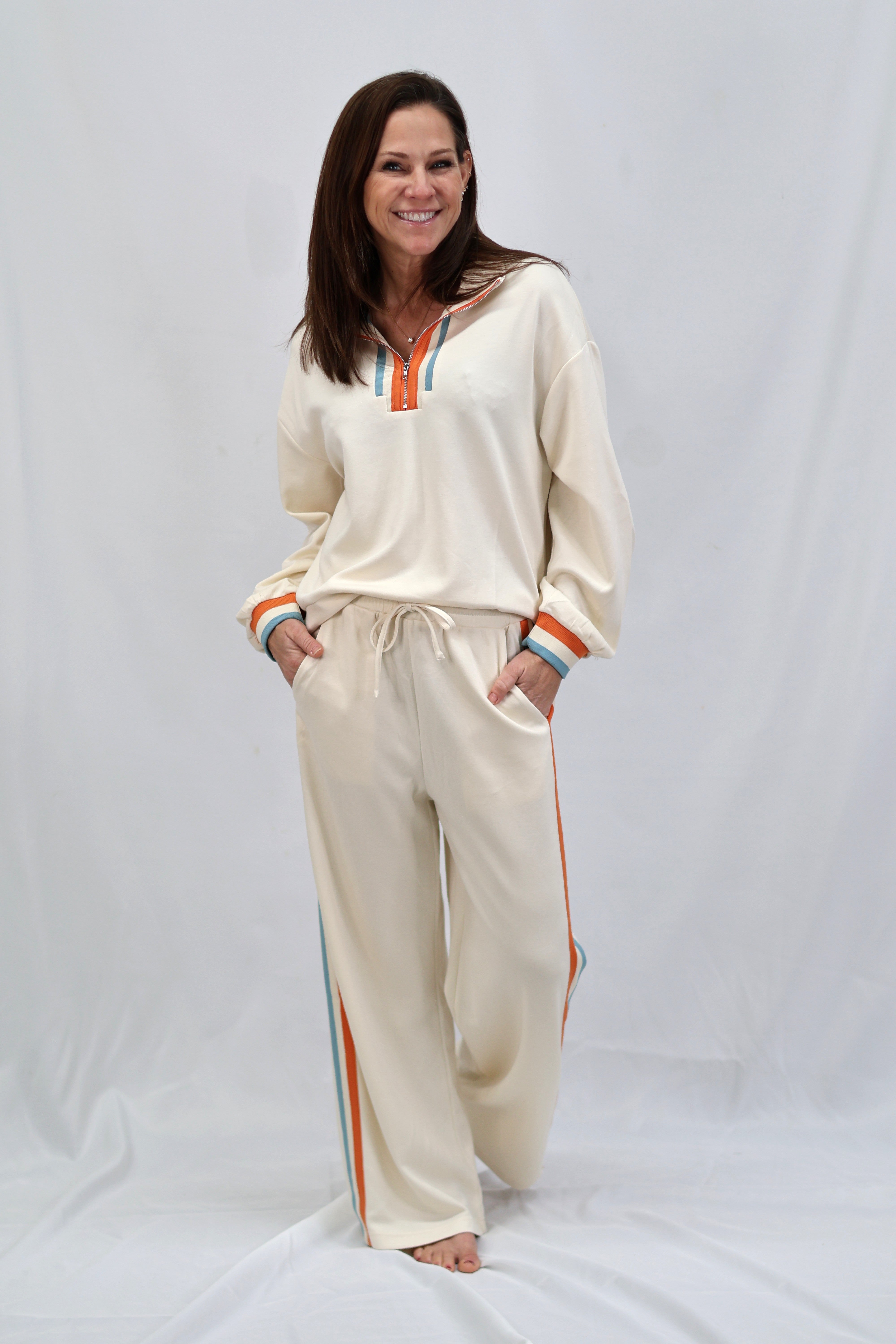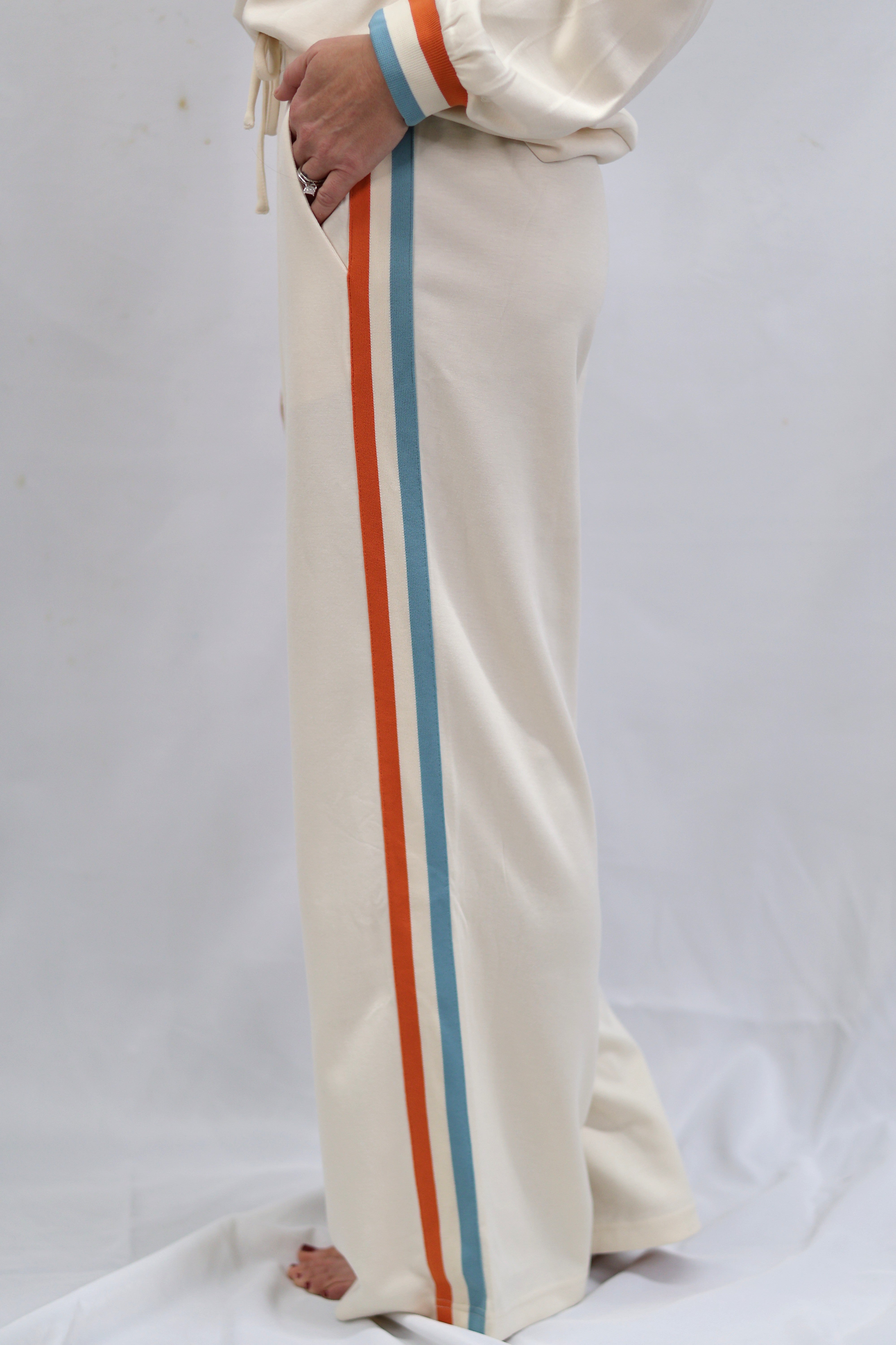 Elevate your casual wardrobe with these refined sweatpants, designed for effortless sophistication. Crafted in a soft cream tone, they feature a practical drawstring waist for a customizable fit and functional side pockets for everyday convenience. The striking side color block trim adds a contemporary edge, transforming loungewear into a polished statement piece. Perfect for transitioning from home to errands with understated elegance.
