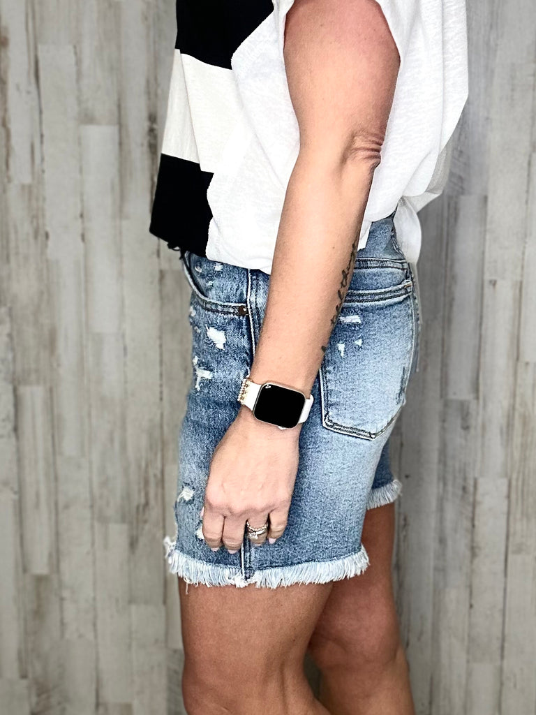 Crafted for those who appreciate style and comfort, our Key Largo Cut Off Shorts are a must-have for any fashion-forward wardrobe. The high waisted design, with rigid front and stretch back with button fly provide a flattering fit, while the "magic destroy" adds an edgy touch. Perfect for any summer outing, these shorts are a versatile addition to your collection.