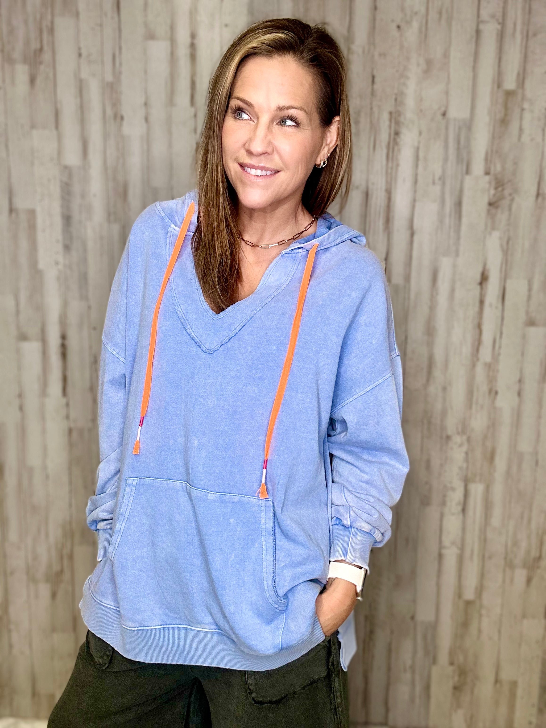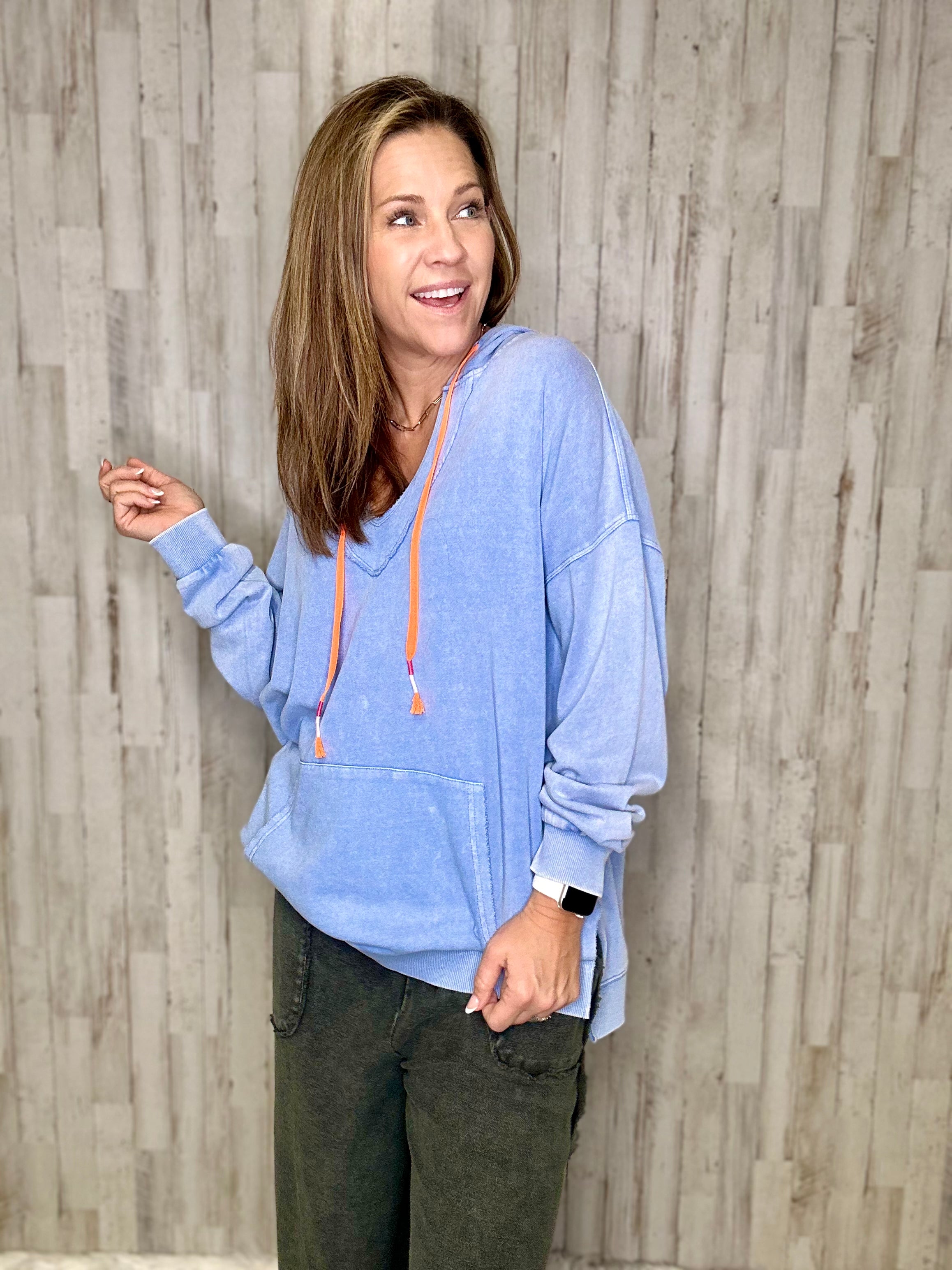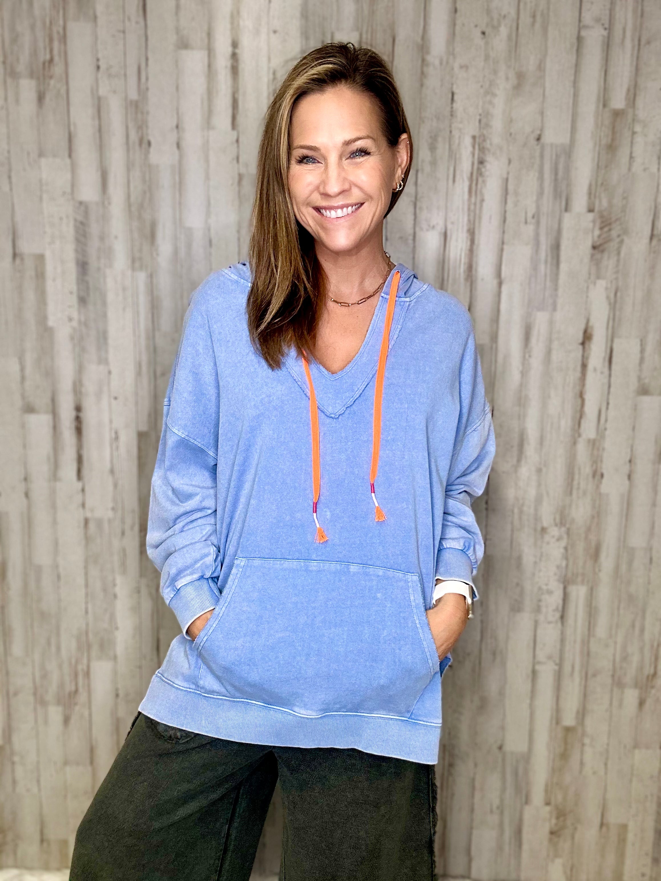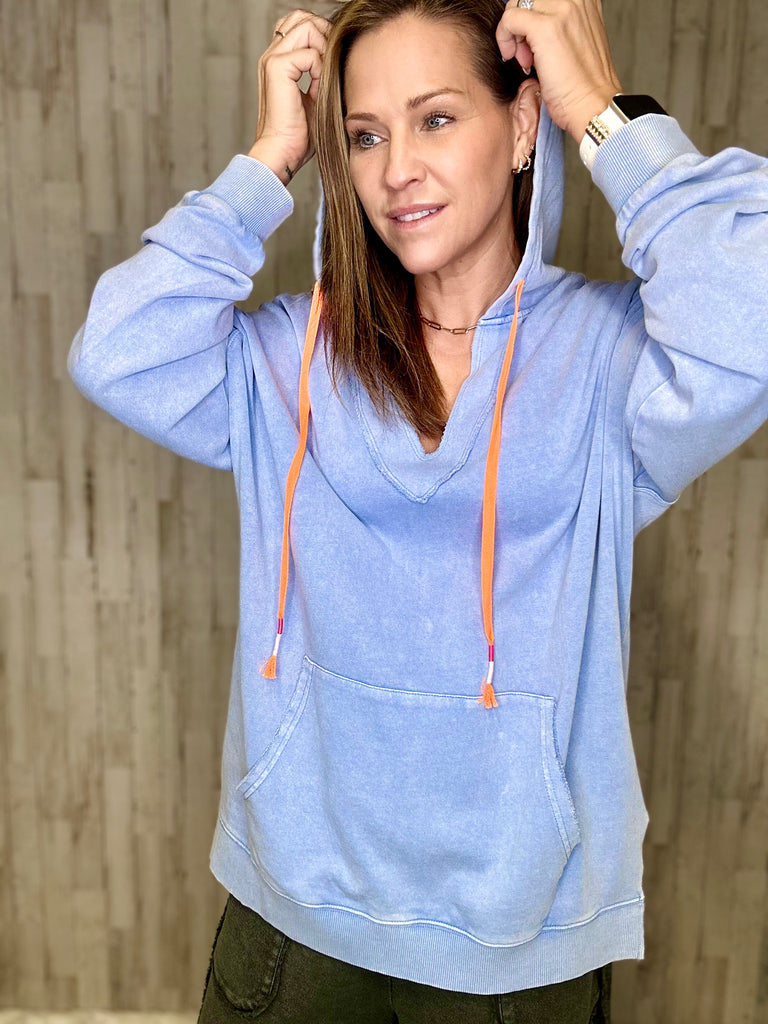 Step into style with the Oakridge Mineral Washed Terry Hoodie Pullover. This lightweight, colorblocked hoodie features a thick panel V neckline and adjustable drawstrings for a unique look. The dropped shoulders and kangaroo pockets add functionality while the ribbed bottom hem and cuffs provide a comfortable fit. Stay cool and stylish with the loose and relaxed fit.