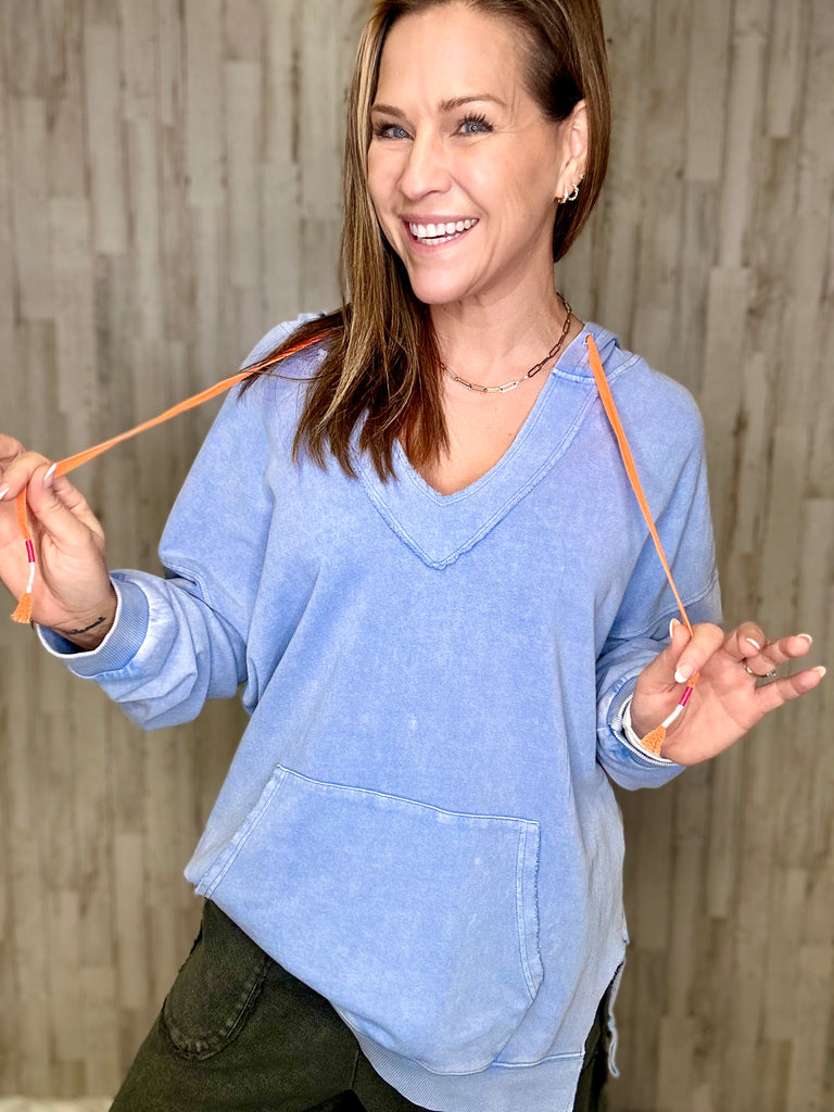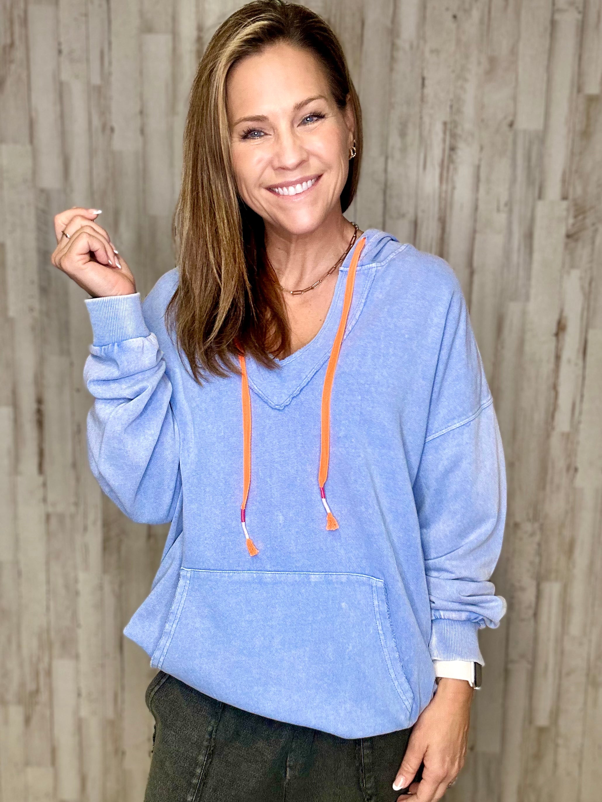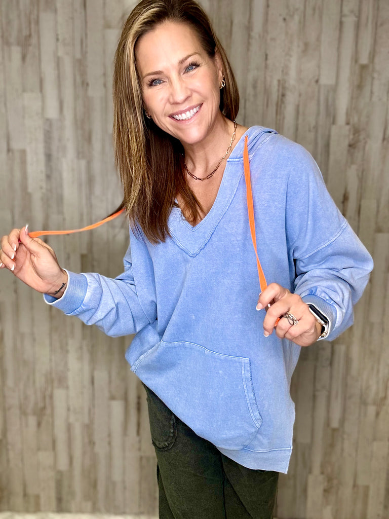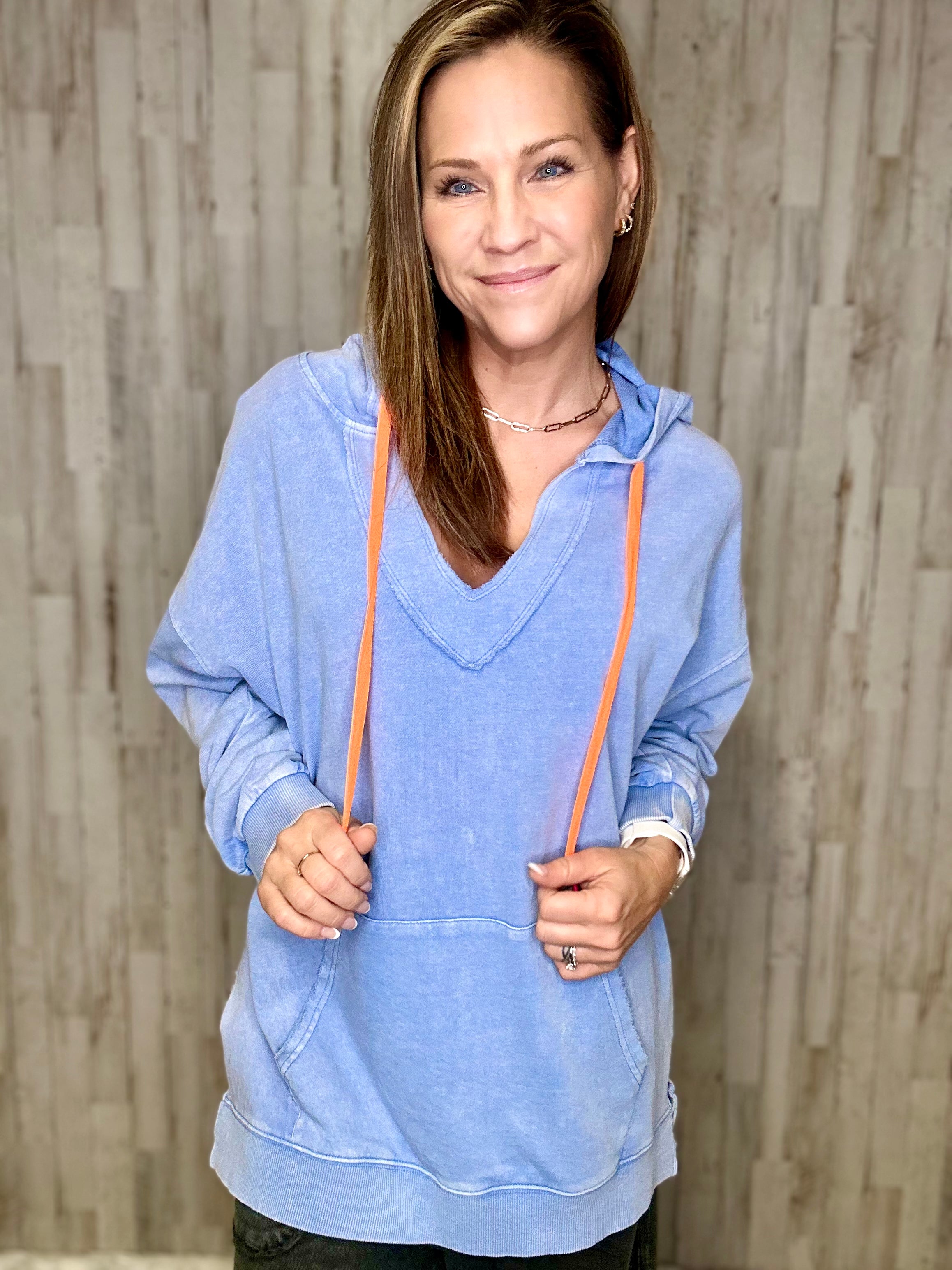Step into style with the Oakridge Mineral Washed Terry Hoodie Pullover. This lightweight, colorblocked hoodie features a thick panel V neckline and adjustable drawstrings for a unique look. The dropped shoulders and kangaroo pockets add functionality while the ribbed bottom hem and cuffs provide a comfortable fit. Stay cool and stylish with the loose and relaxed fit.