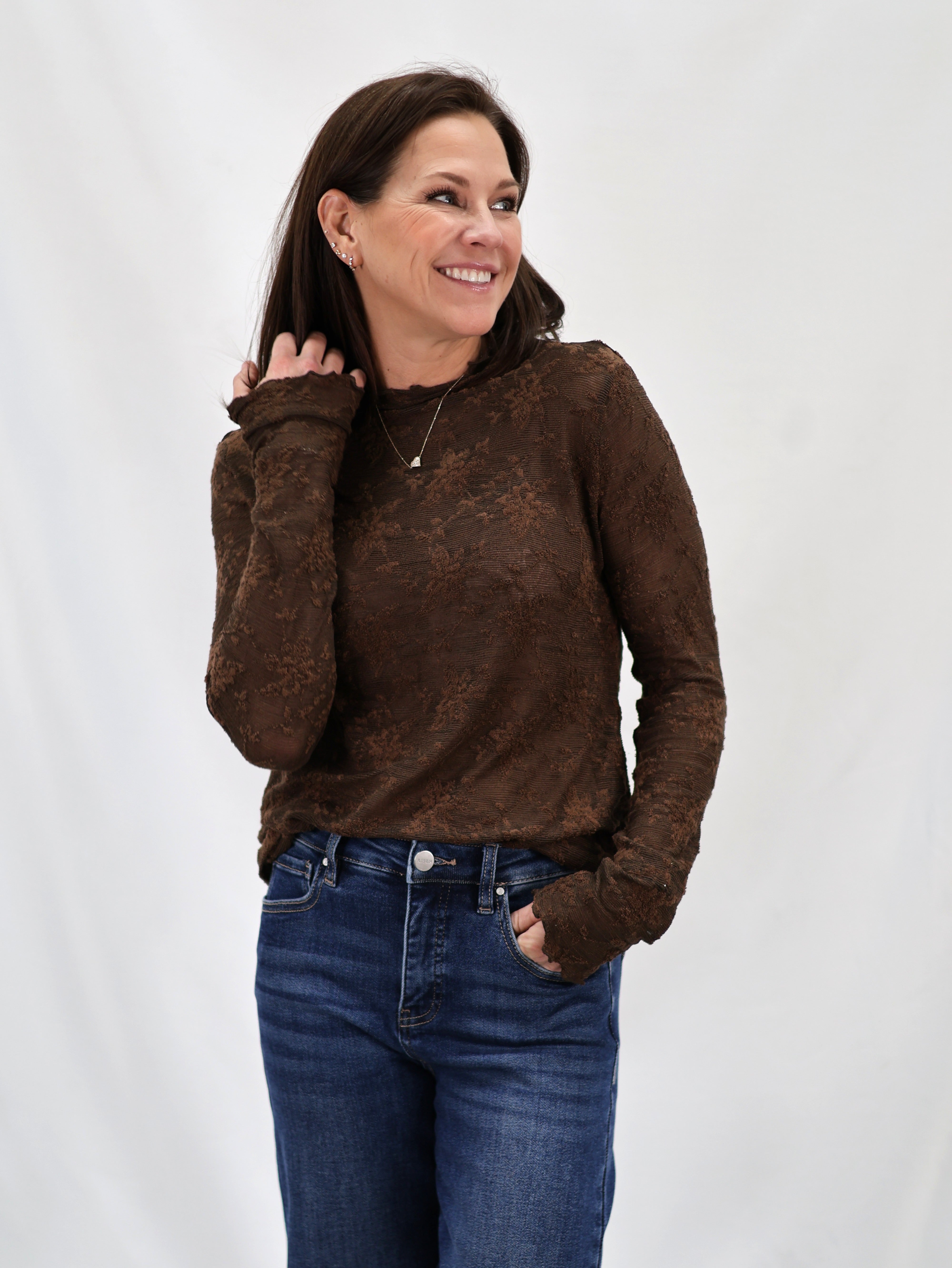 Slip into effortless elegance with the Cocoa Bay Top, where sheer lace meets timeless style. This long-sleeve beauty features delicate lace detailing that catches the light just right, perfect for layering or wearing solo for that flirty, sophisticated vibe. The rich brown hue works with everything in your closet, making it your new go-to for date nights, brunch dates, or whenever you want to feel a little extra fabulous. Comfortable enough for all-day wear, stunning enough to turn heads.