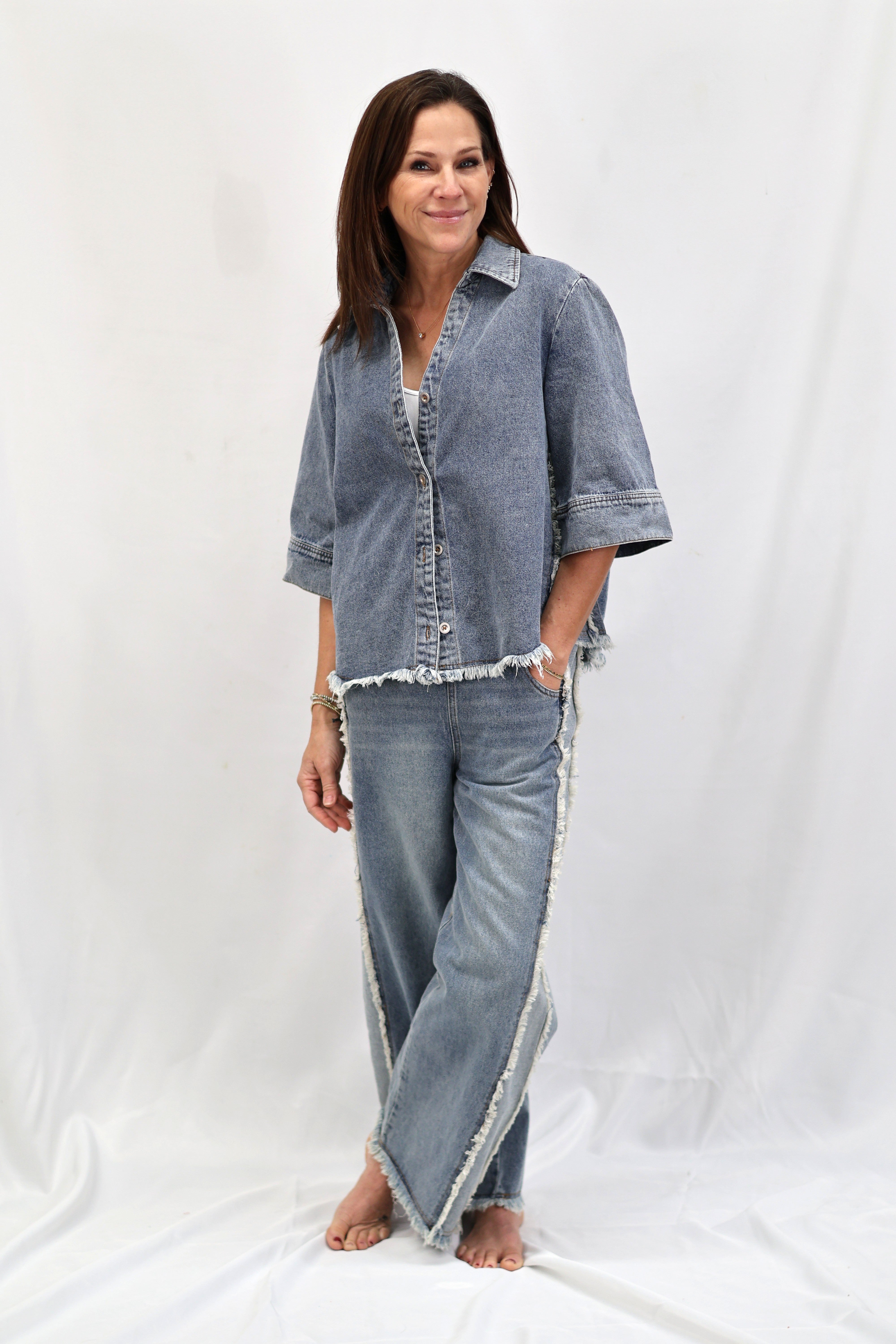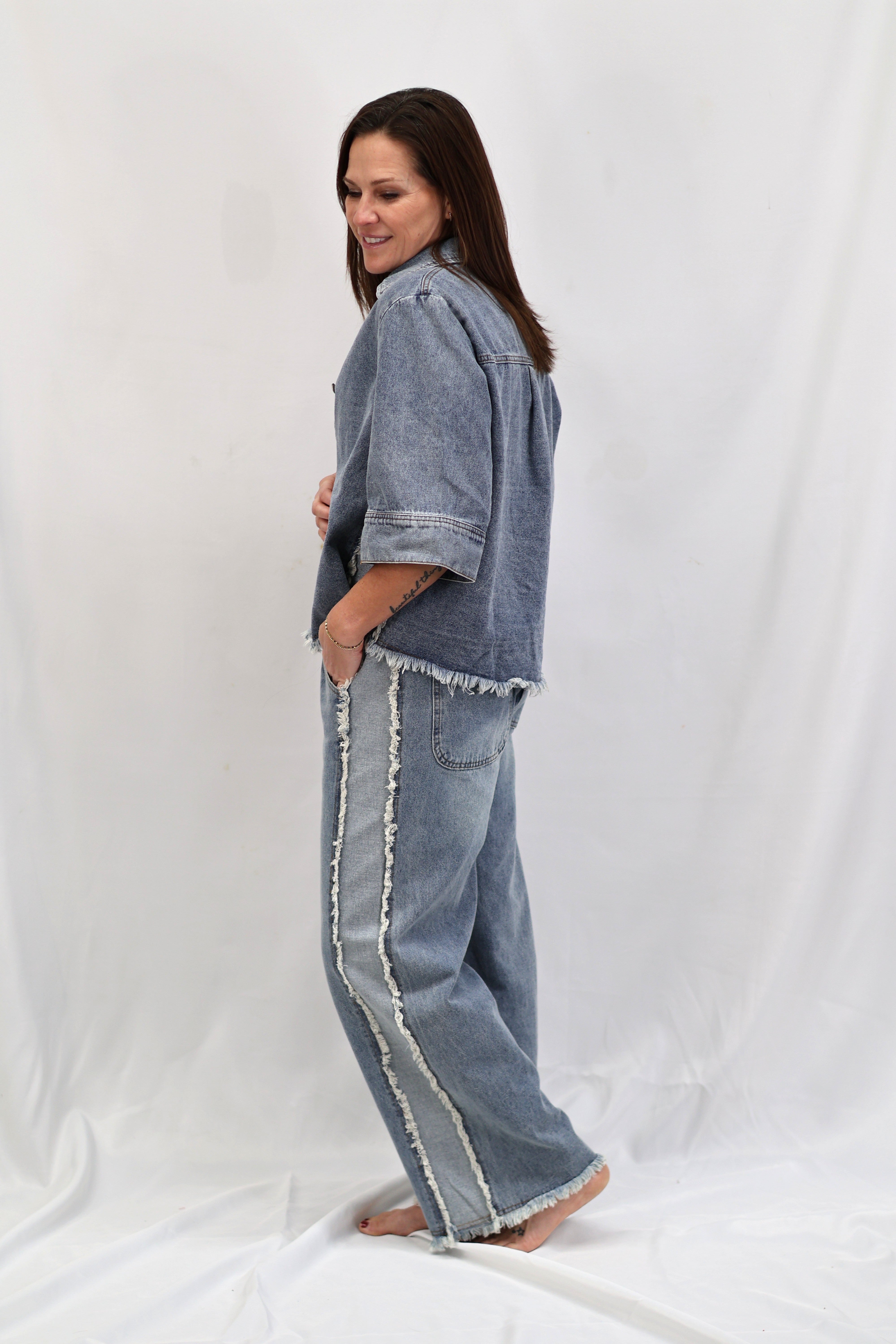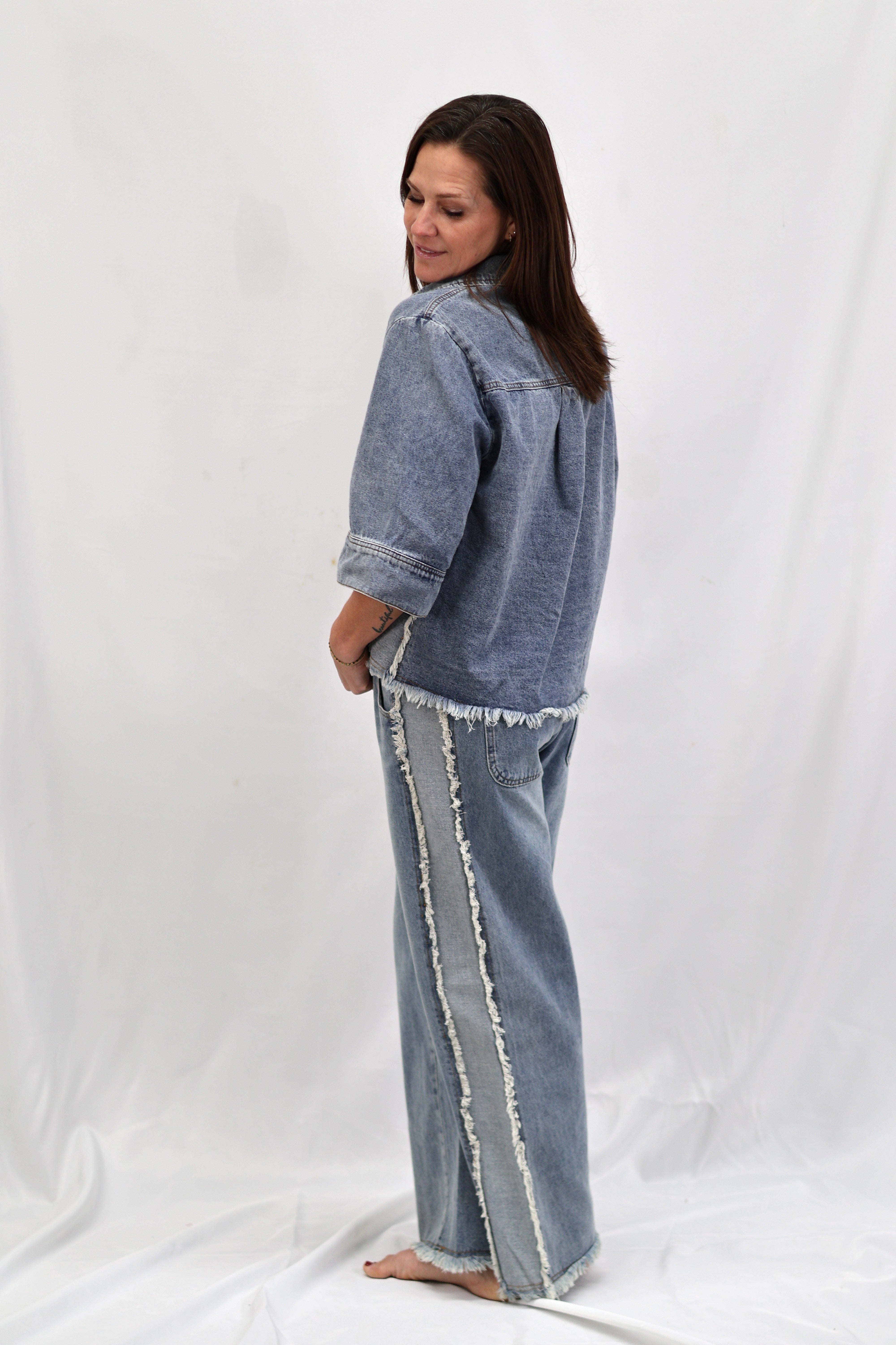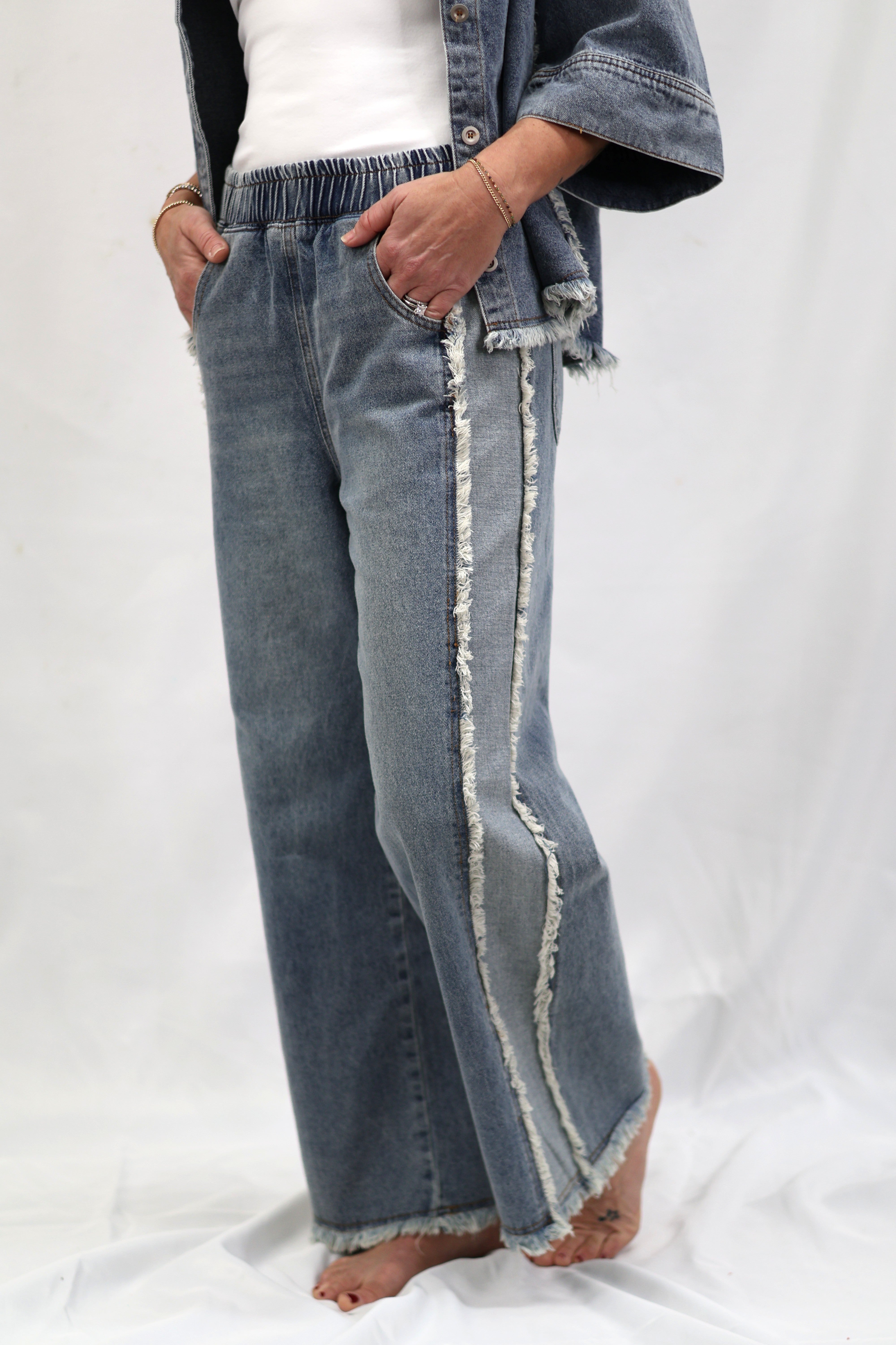 Meet the Devin Denim Pant—your new go-to for laid-back style that actually feels as good as it looks. These wide-leg beauties feature an elastic waistband for zero-fuss pull-on comfort, plus functional side pockets because practicality is always in fashion. The star of the show? Exposed knit detailing running down the legs paired with subtly frayed seams and hem for that effortlessly cool, lived-in vibe. Crafted from soft washed denim, they move with you all day long and play nicely with everything from oversized tees to chunky knits. Casual comfort has never been this chic.