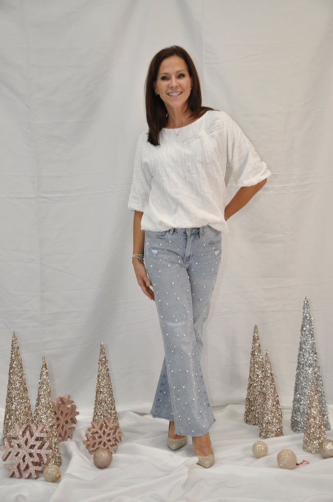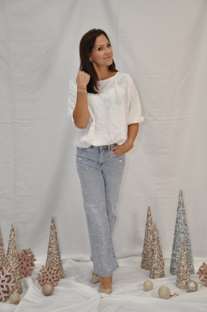 The Beverly Hills High Rise Jean elevates everyday denim with refined details. This high-rise silhouette flatters the figure while distressed elements add contemporary edge. Delicate pearl and stone embellishments cascade down the leg, creating an eye-catching statement that transitions seamlessly from casual to elevated occasions. Perfect for those who appreciate understated luxury with a modern twist.