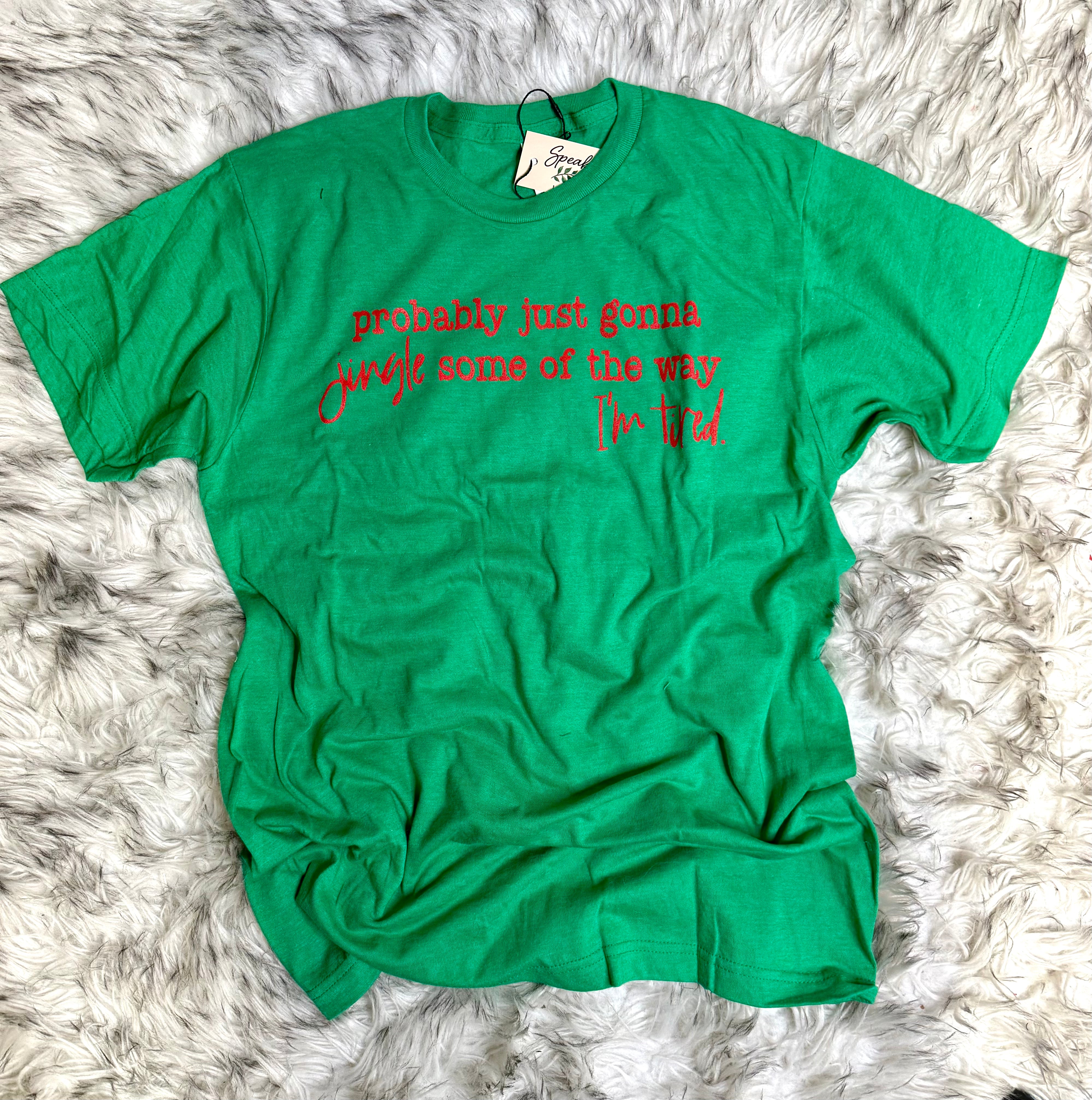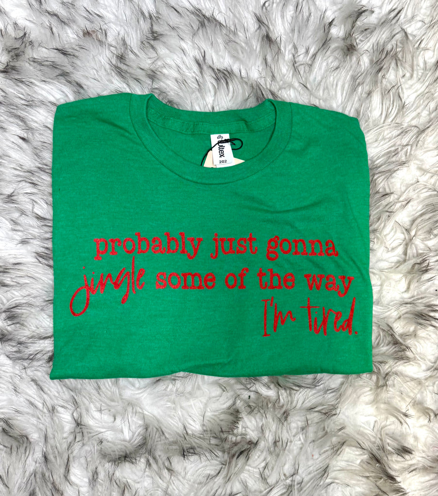 Embrace understated humor with this sophisticated graphic tee featuring a witty take on holiday sentiment. The "Probably just gonna Jingle some of the way I'm tired" design captures that perfectly relatable moment between festive cheer and genuine exhaustion. Crafted in a calming green hue, this tee balances playful irreverence with refined style, making it an ideal choice for those who appreciate clever wit without sacrificing elegance. Perfect for casual gatherings or as a thoughtful gift for the discerning person who values authenticity over conventional holiday messaging.