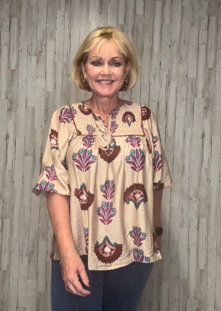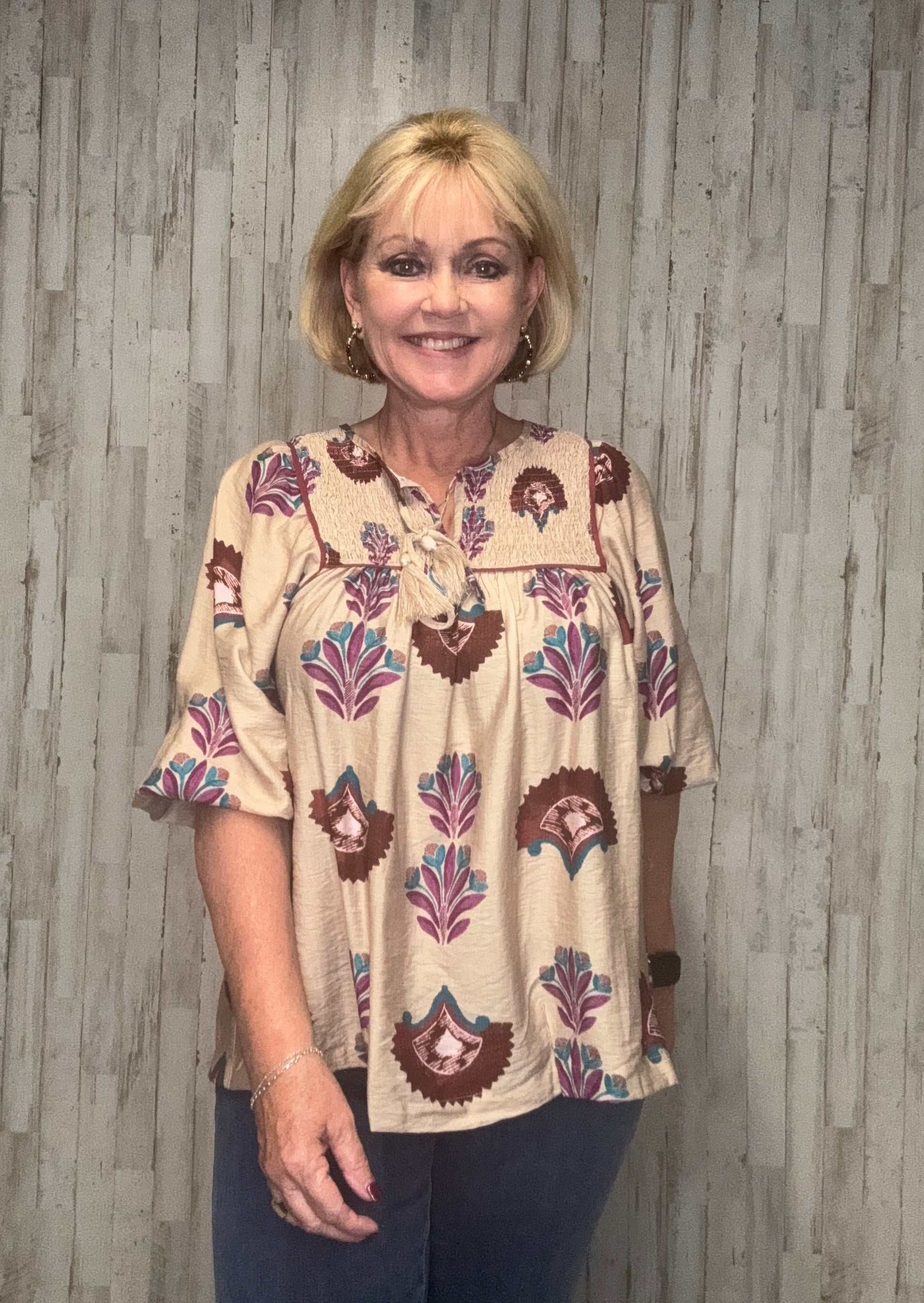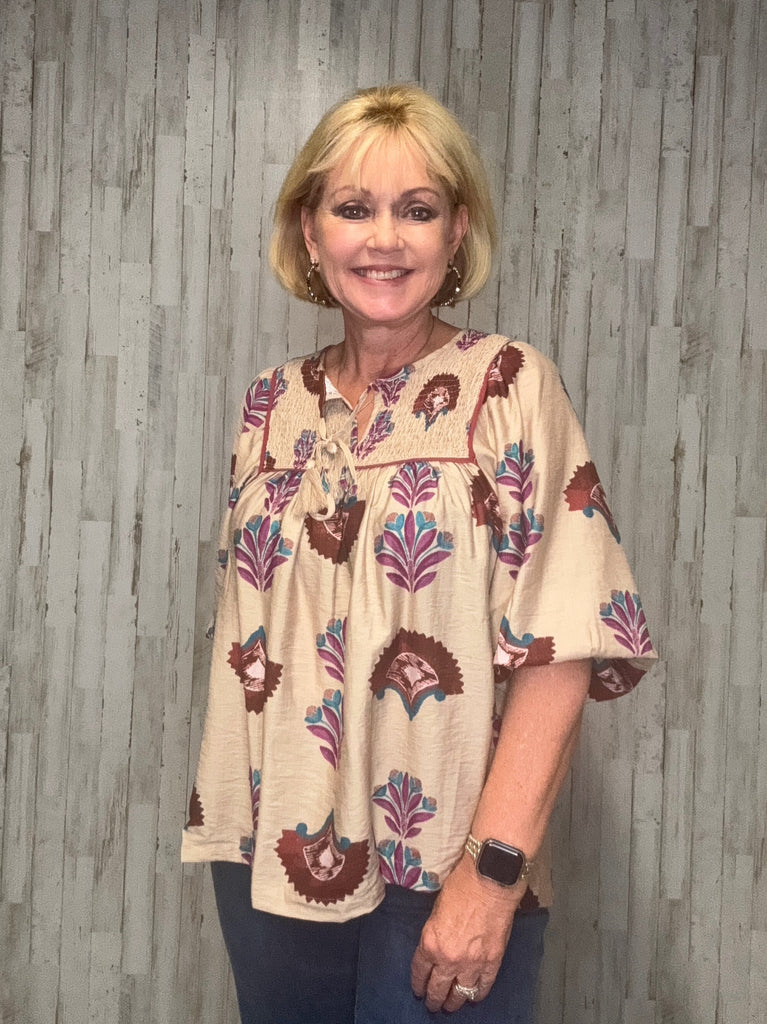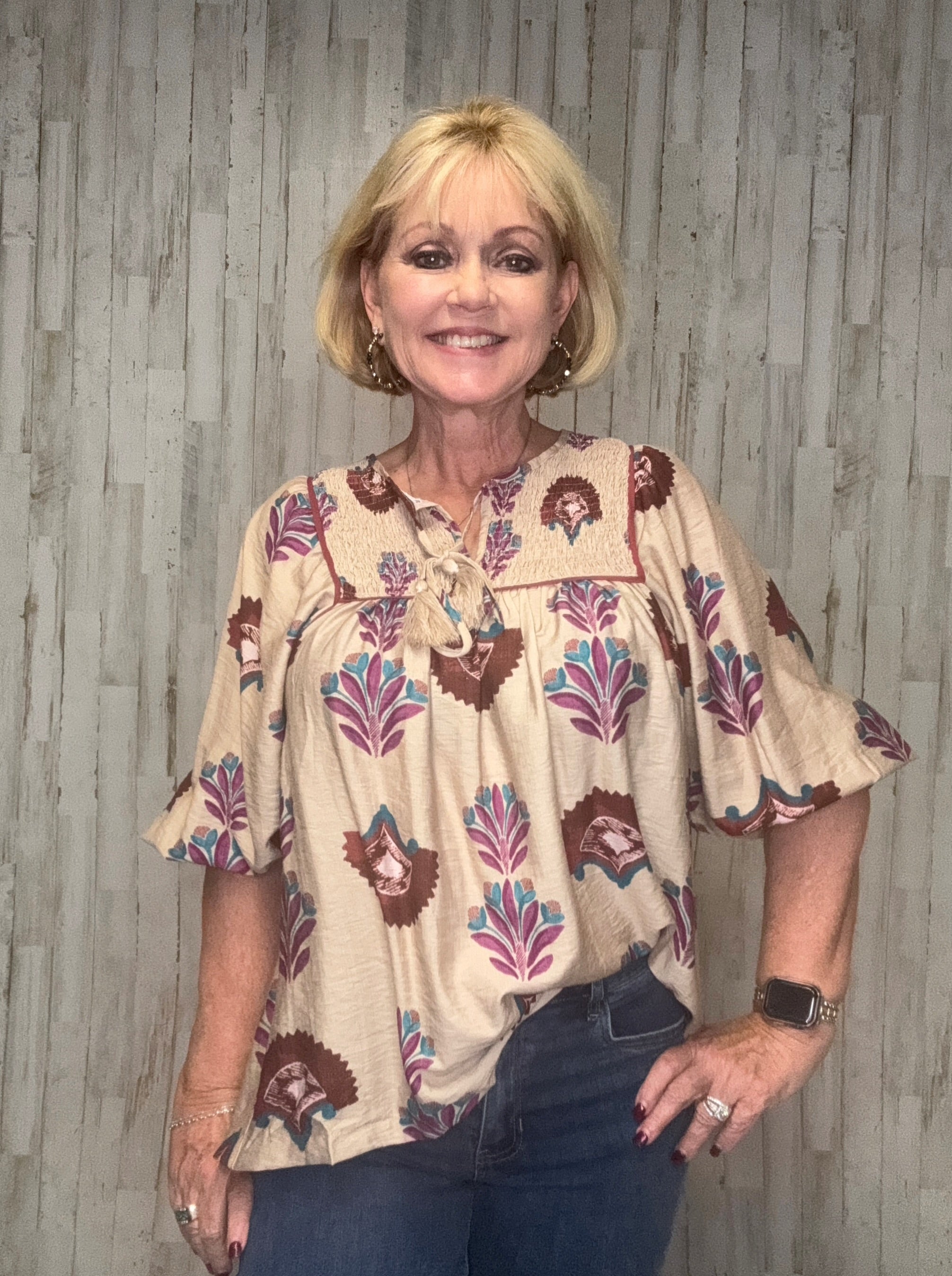 The San Pedro Abstract Top brings effortless elegance to your autumn wardrobe. This sophisticated piece features an eye-catching abstract print in a warm latte blend, complemented by a smocked yoke that adds subtle texture and dimension. Contrast piping traces the neckline and sleeves for a refined finishing touch. Designed without lining, it offers breathable comfort while maintaining its structured silhouette. Perfect for layering or wearing solo, this versatile top transitions seamlessly from season to season.
