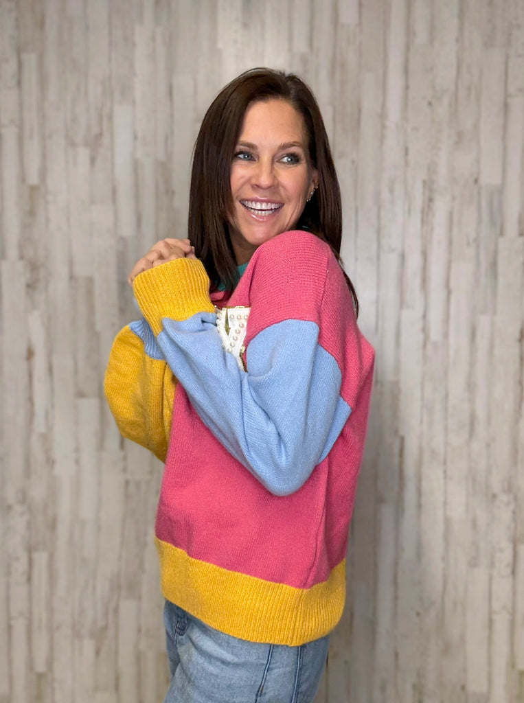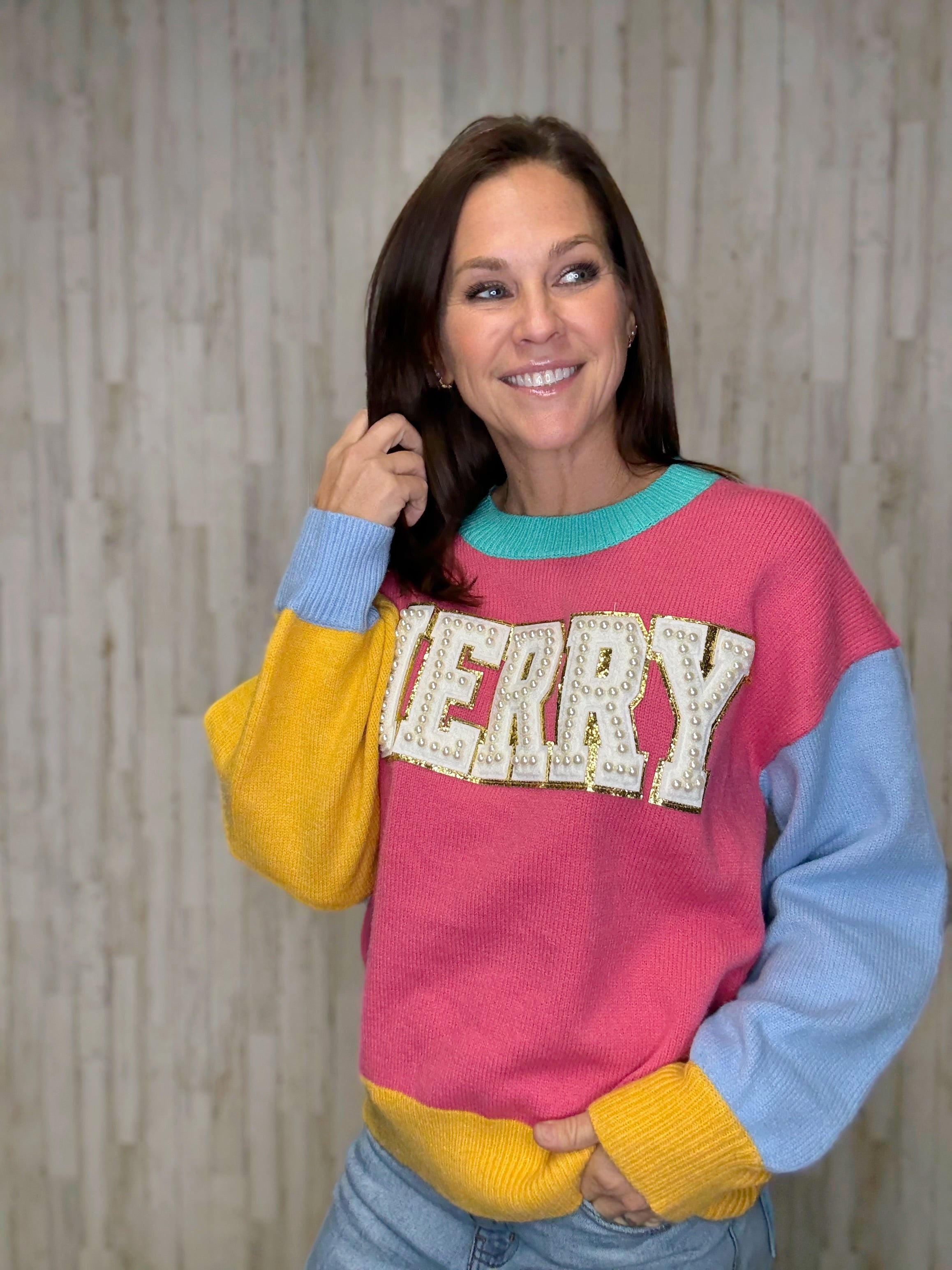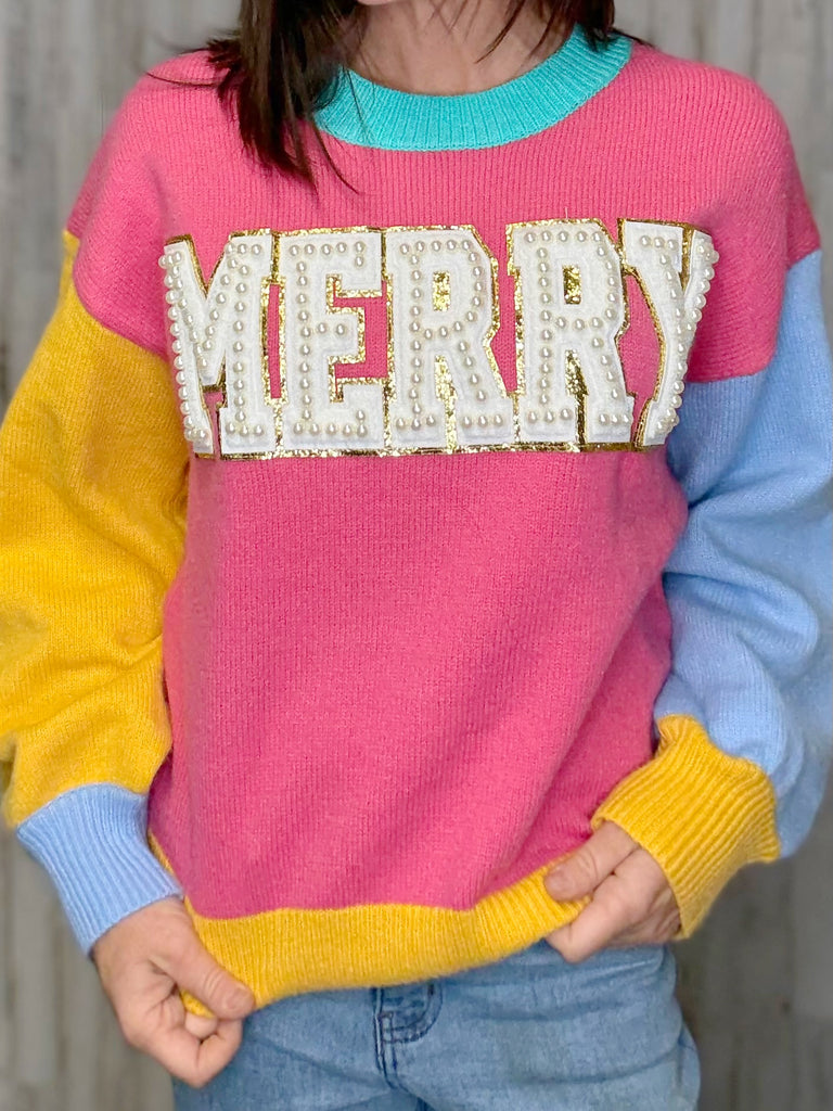 Elevate your seasonal wardrobe with this refined drop shoulder sweater top, featuring a striking color block design that balances modern aesthetics with timeless appeal. The standout "Merry" pearl accent block letters add a touch of understated elegance, making it perfect for festive gatherings or casual sophistication. The relaxed drop shoulder silhouette offers comfortable movement while maintaining a polished appearance, ideal for layering or wearing solo during cooler months.
