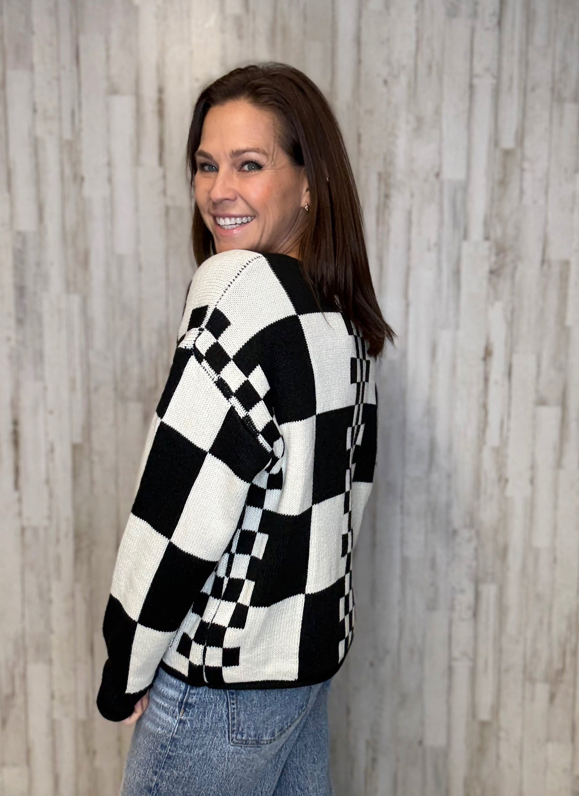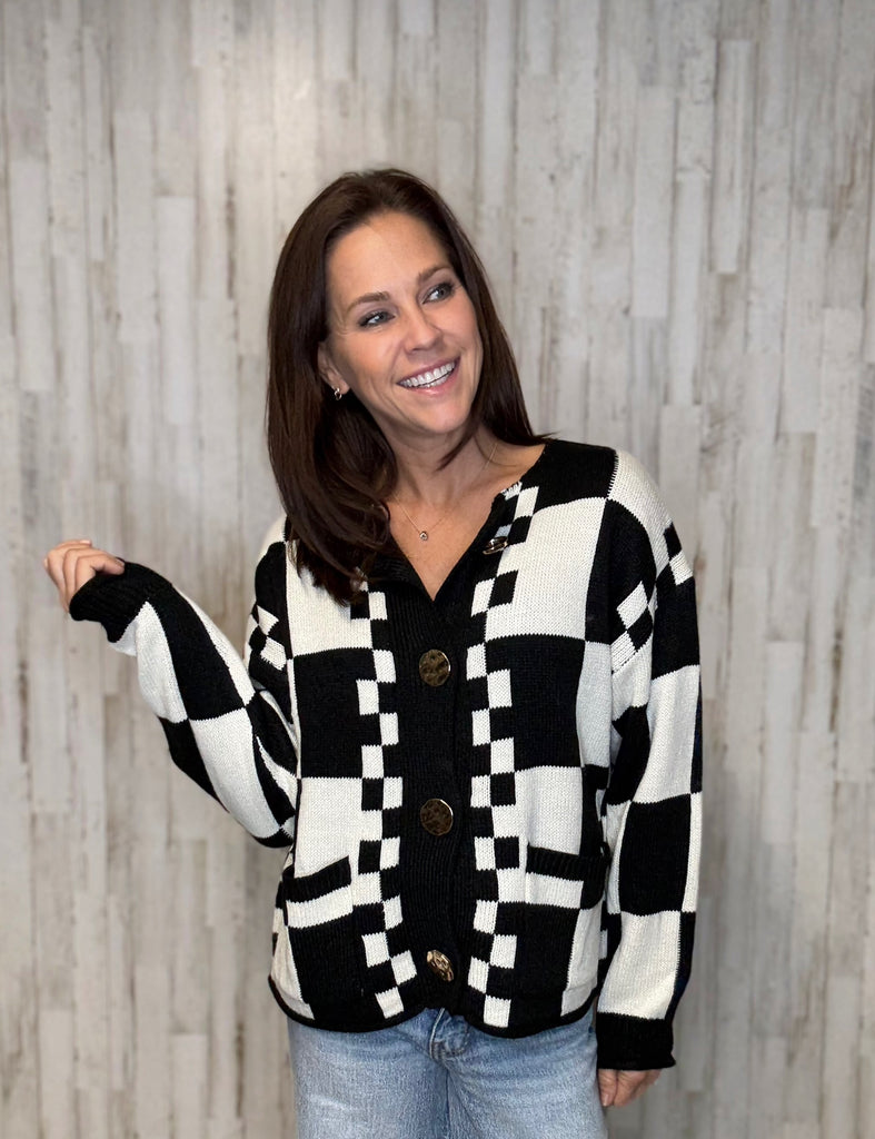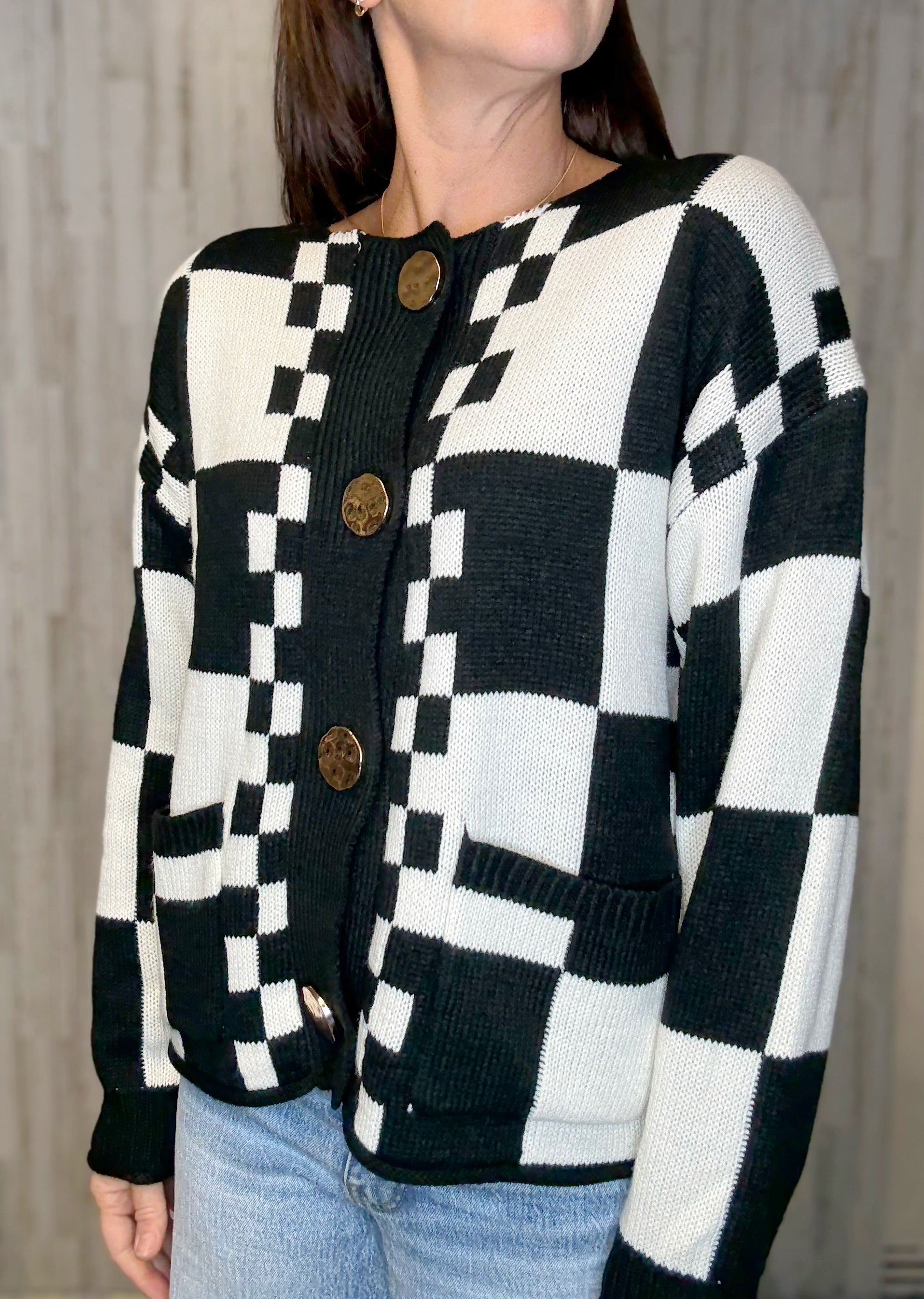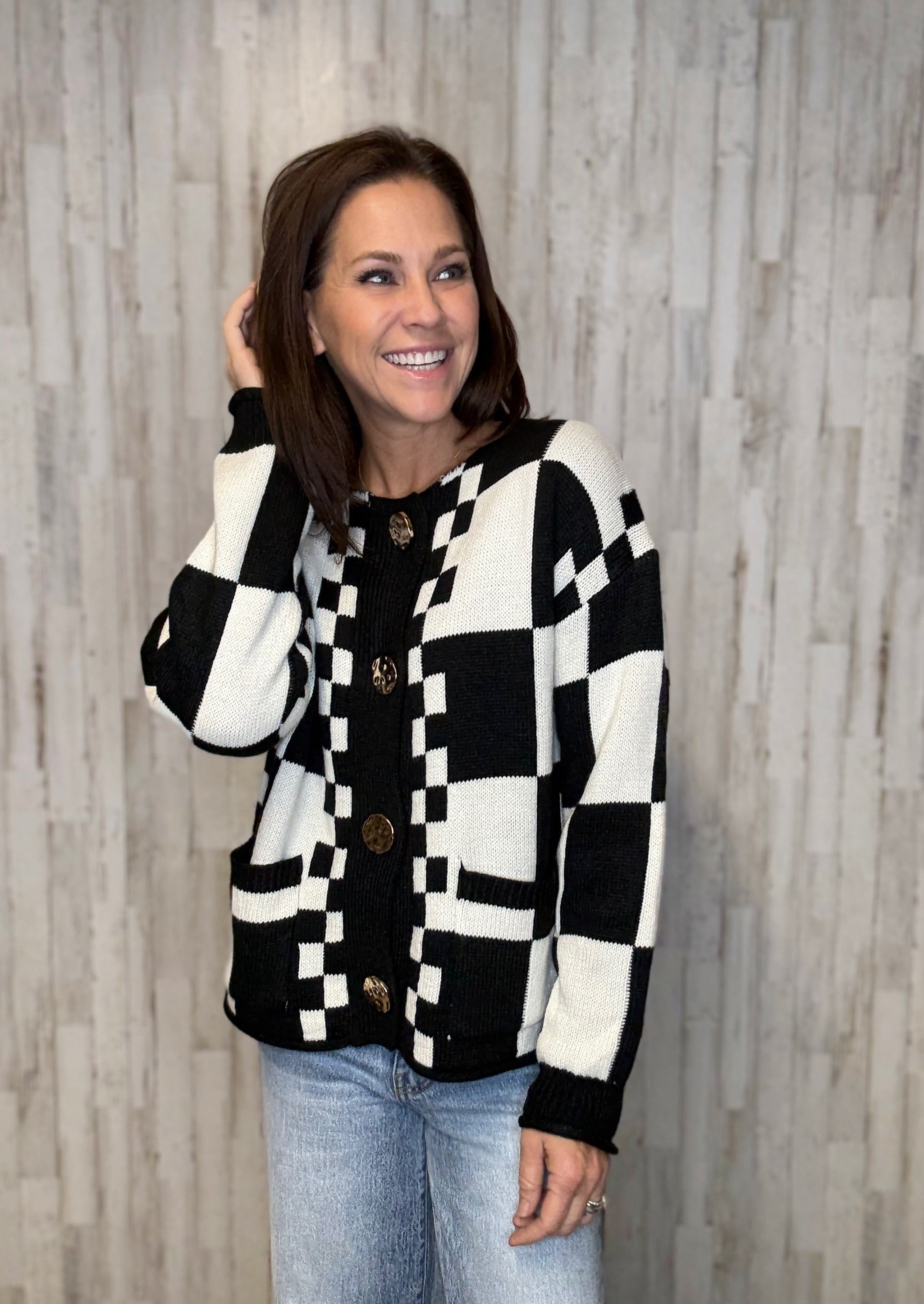 The Veronica Checkered Sweater combines timeless style with everyday practicality. This sophisticated button-down cardigan features a classic black and white checker pattern that effortlessly transitions from casual to polished looks. Long sleeves provide warmth and coverage, while functional pockets add convenience to your wardrobe. The structured fit and refined design make it an essential layering piece for any season, perfect for pairing with dresses, jeans, or tailored trousers.