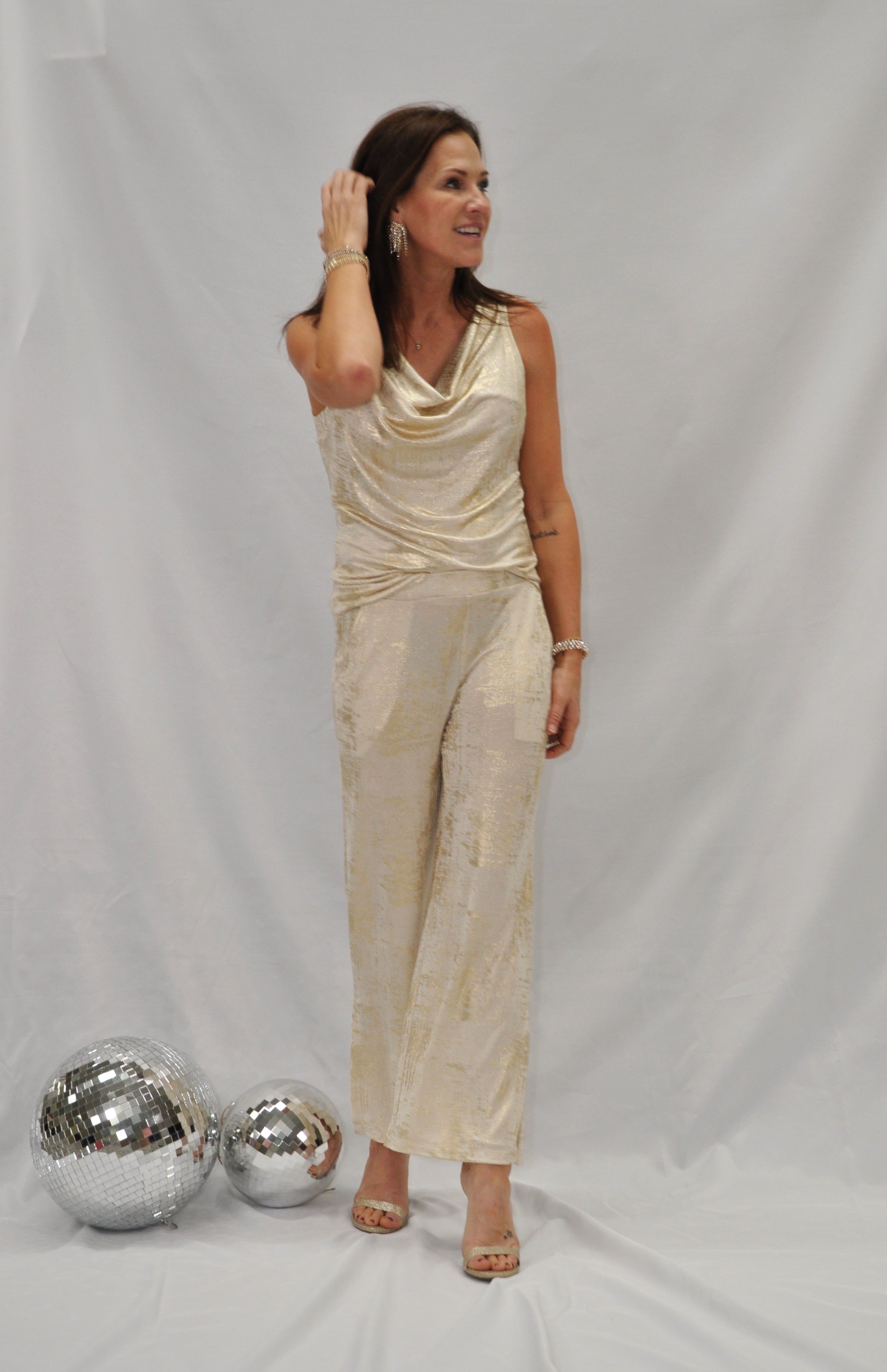 Pop the bubbly and celebrate any occasion in style in our Foil Sheen Cowl Neck Draped Tank! Featuring a flowing cowl neckline, a bra-friendly silhouette, and a beautifully draped bodice with a straight hemline.