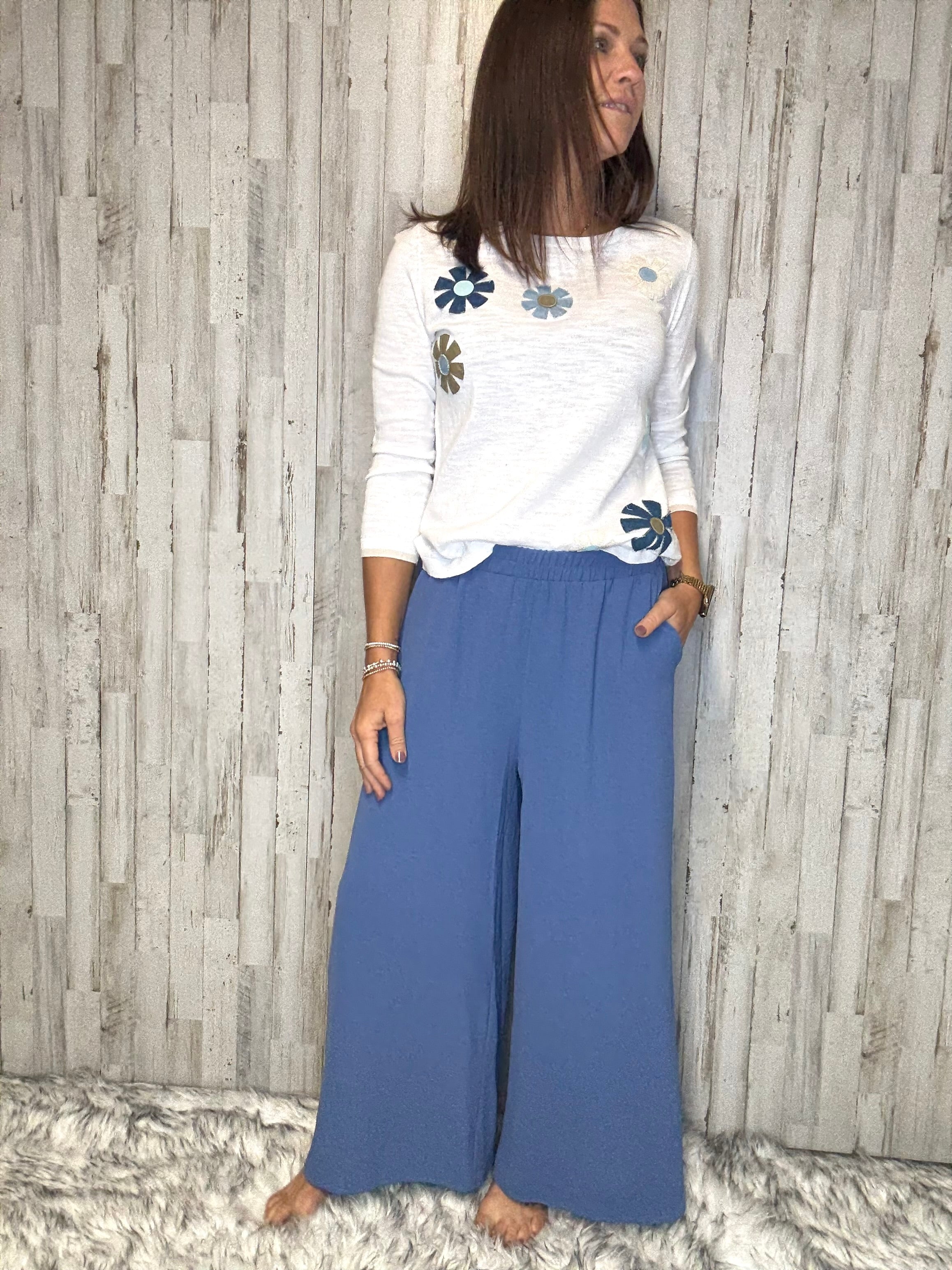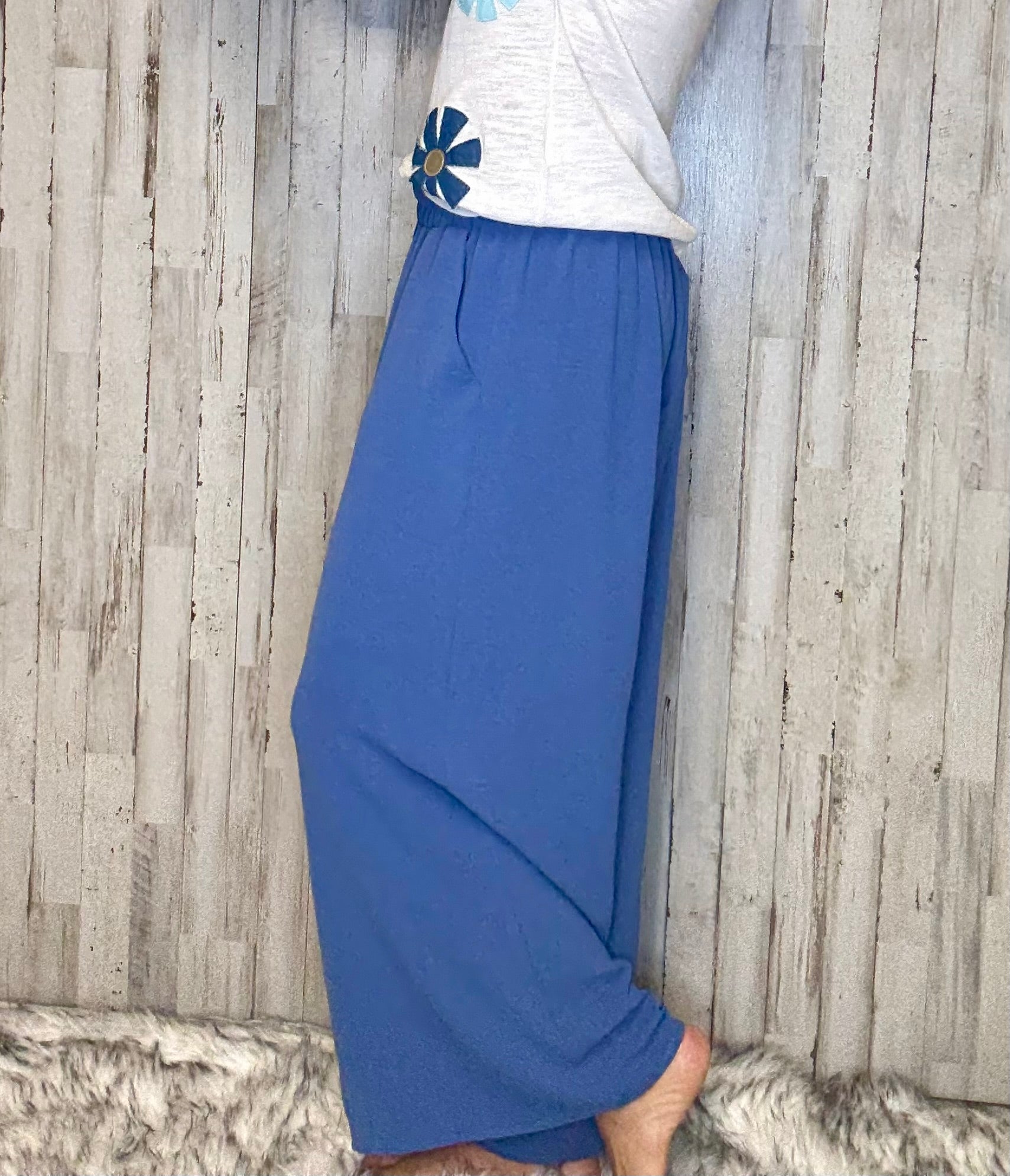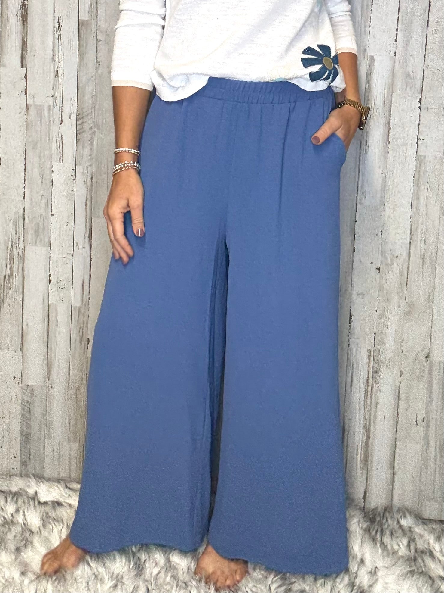 Indulge in effortless style and comfort with the Daphney Wide Leg Pant. With its denim color and wide leg design, this pant exudes a relaxed sophistication. The elastic waist and pockets add convenience, making it the perfect choice for any occasion. Elevate your wardrobe with this luxurious and versatile piece.
