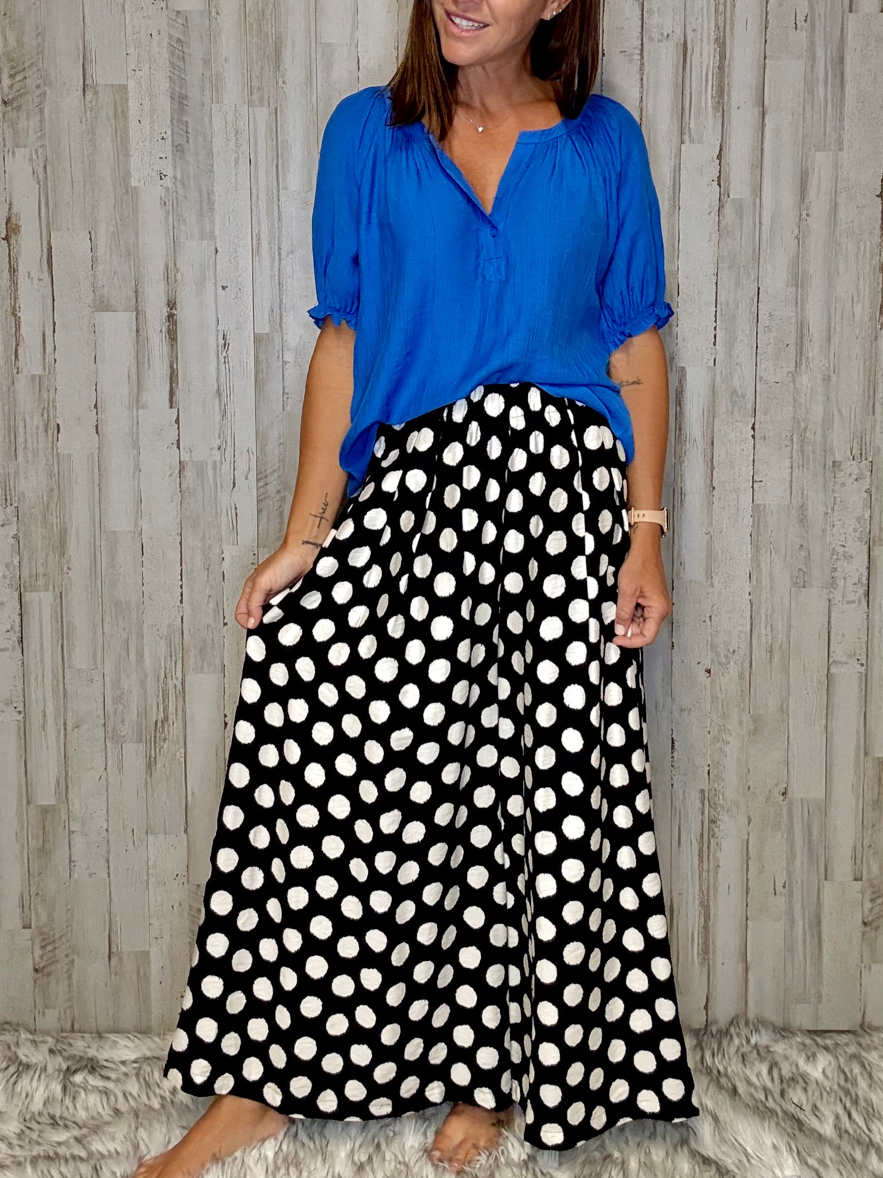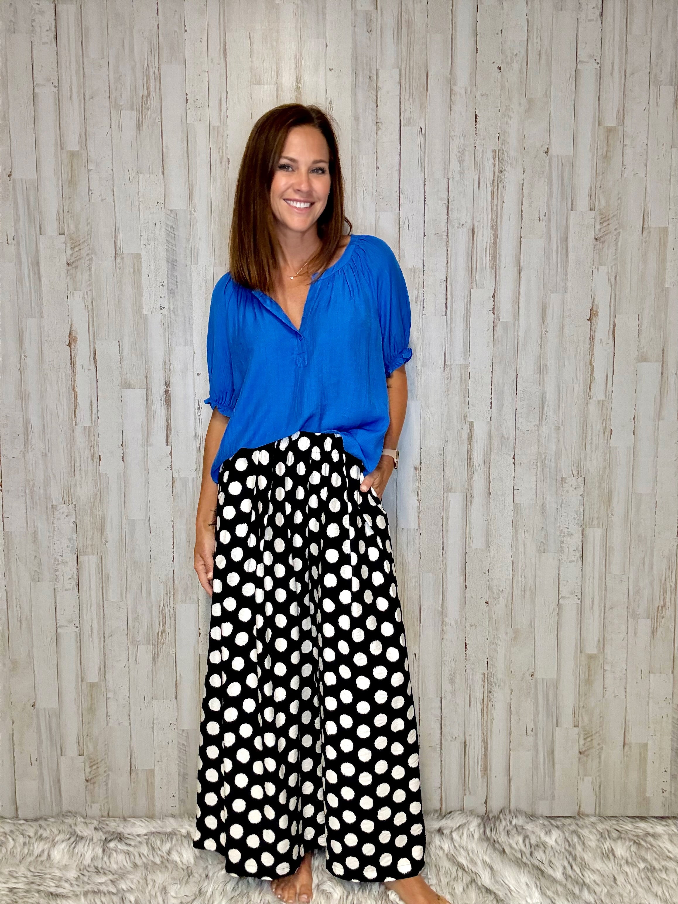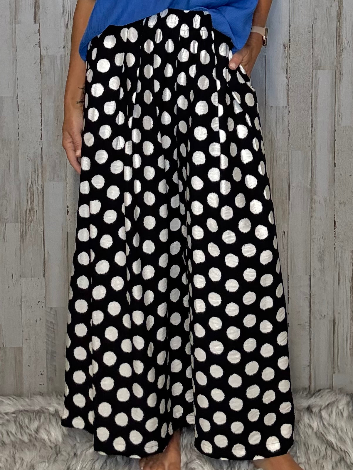 Discover the perfect balance of fun and sophistication with our Perry Dot Flare Pants. Featuring a playful polka dot print and wide leg cut, these pants are sure to make a statement. The elastic waistband and side pockets add convenience, while the shorts lining ensures both comfort and coverage. Elevate your wardrobe with these stylish and versatile pants.