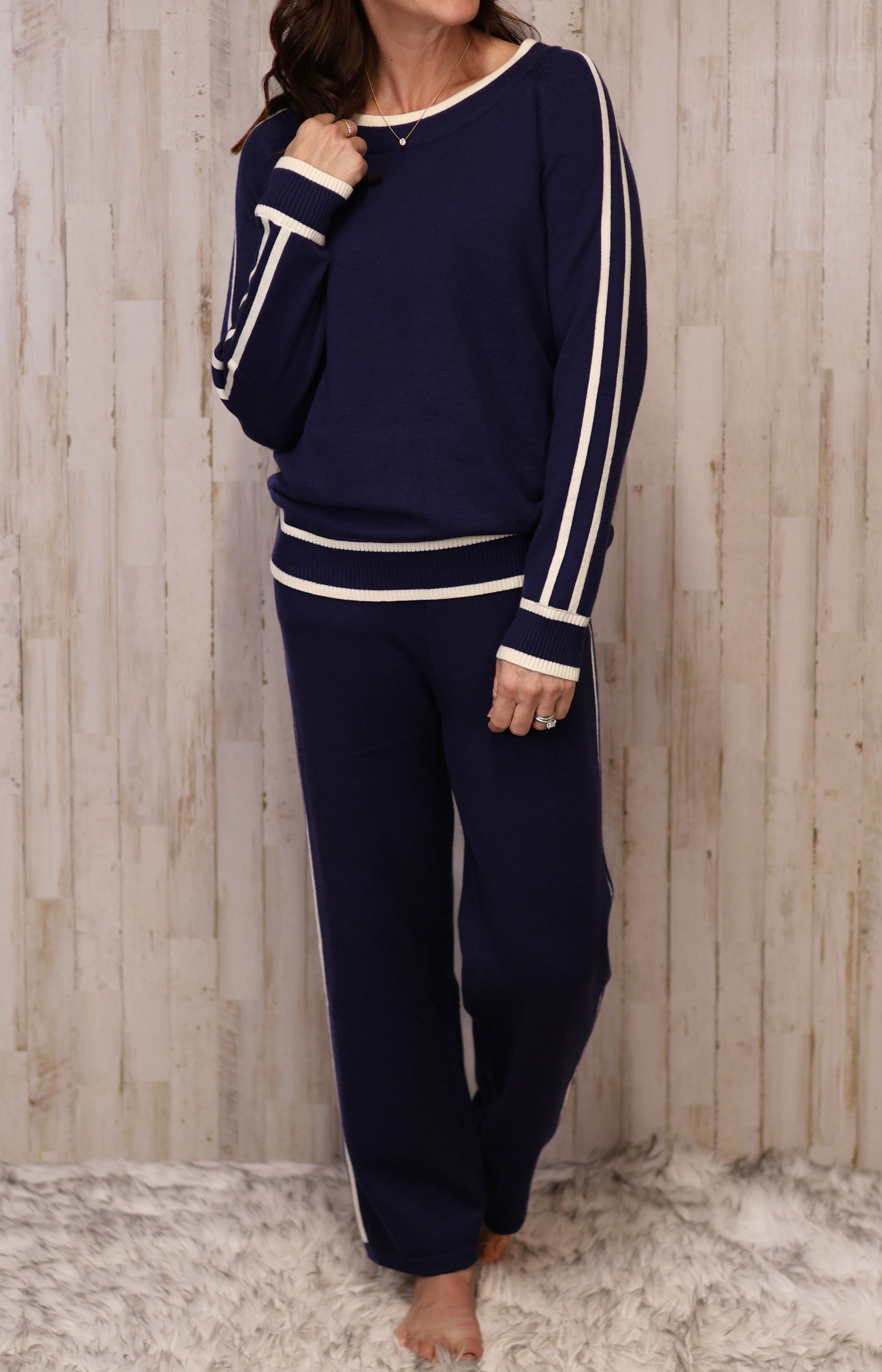 The Salina Navy Top. A casual and comfy sweater made with high quality stretch knit. Long sleeve lightweight sweater. Contrast piping on arms, neckline, and hem. Perfect lounging set. Style this top with the matching Sabine Pant.