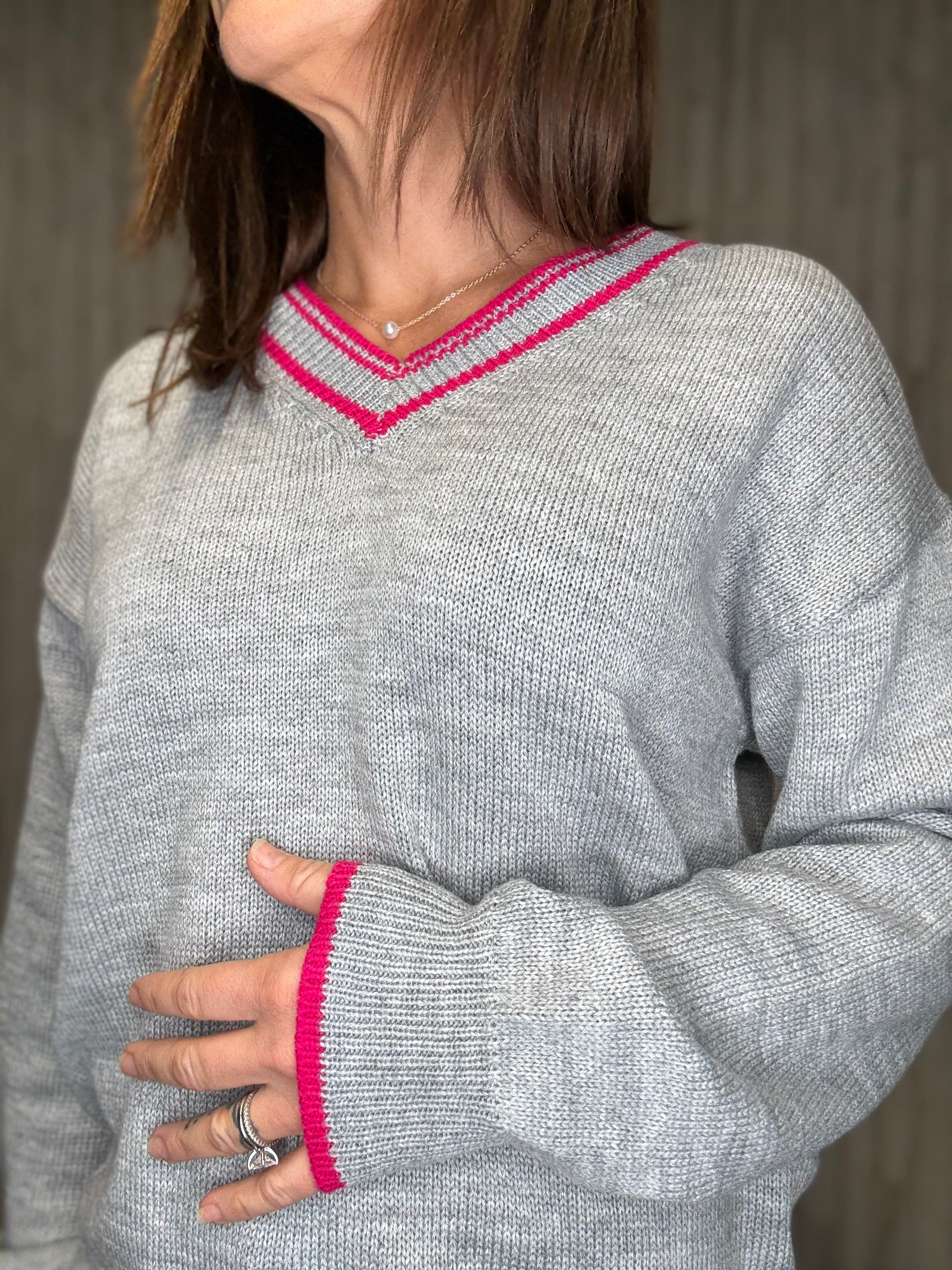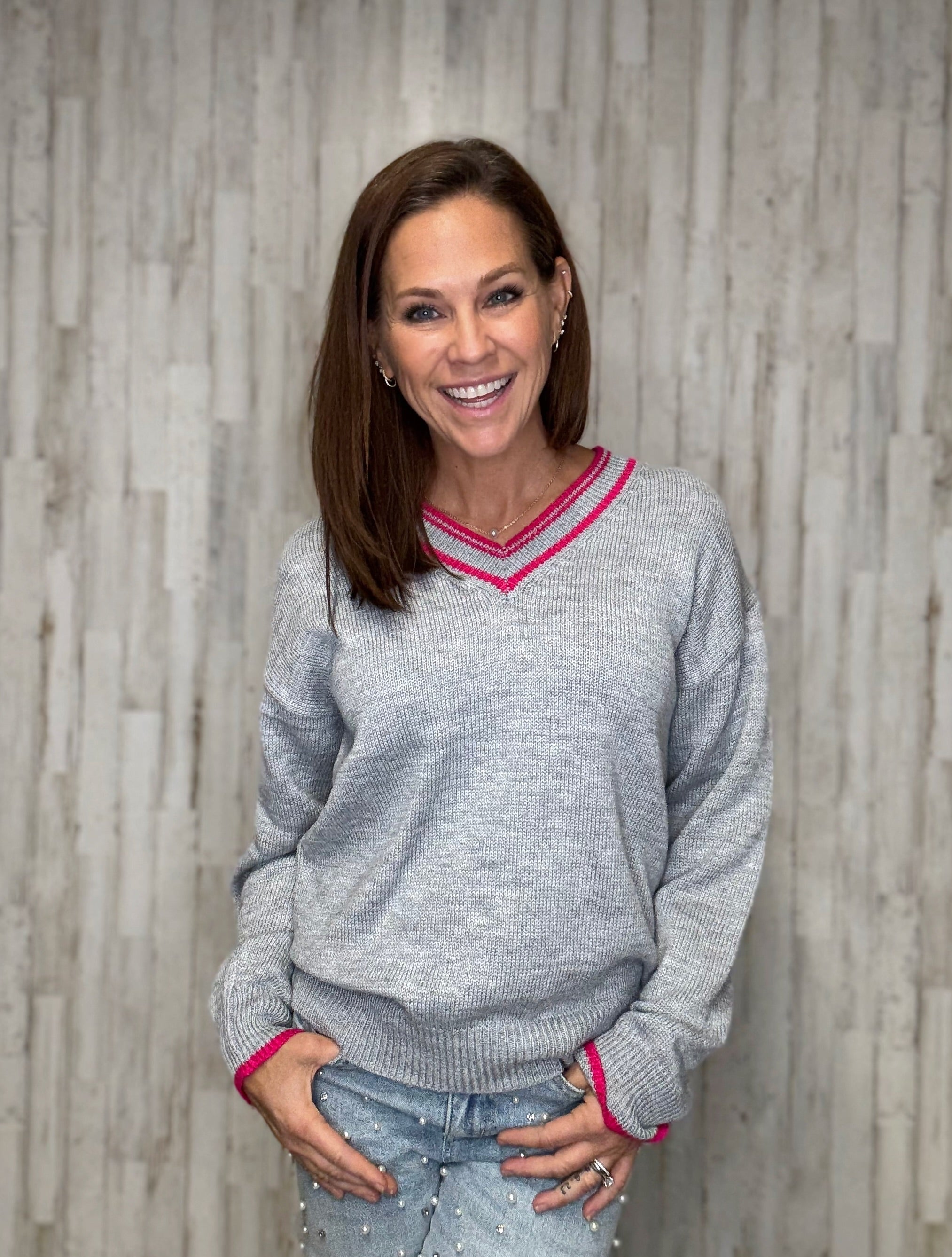 Experience effortless elegance with the Stone Hill Sweater Top. Featuring a relaxed drop shoulder design and a flattering V-neckline, this cozy sweater is elevated by subtle color accents along the neckline and cuffs. Perfect for layering or wearing on its own, it offers a refined yet comfortable look ideal for any occasion.