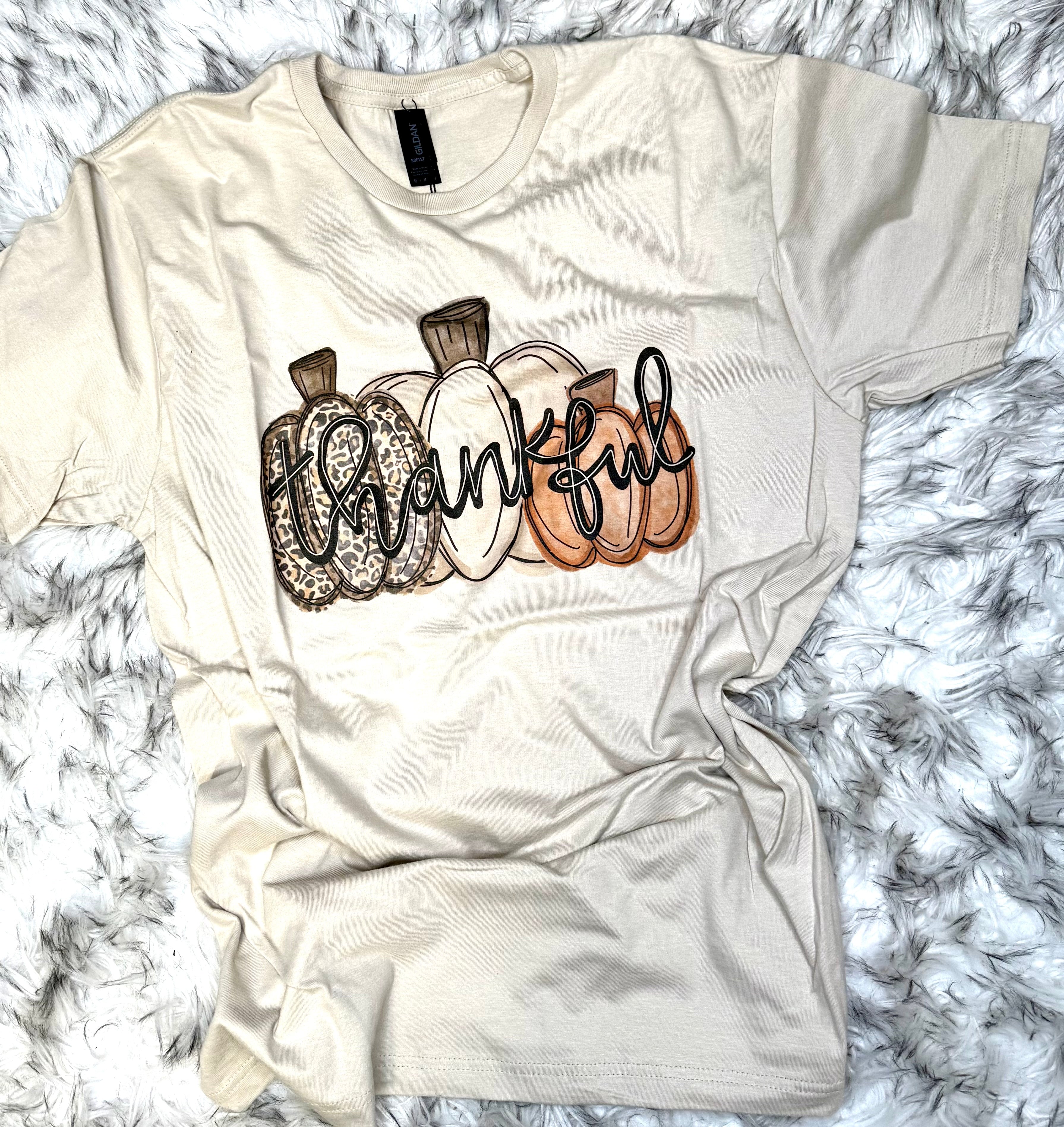 Express your gratitude in style with our Thankful Graphic Tee. Featuring short sleeves and a playful pumpkin graphic, this shirt is the perfect way to show your appreciation with a touch of humor. Perfect for any casual occasion. (Thank you, pumpkin!)