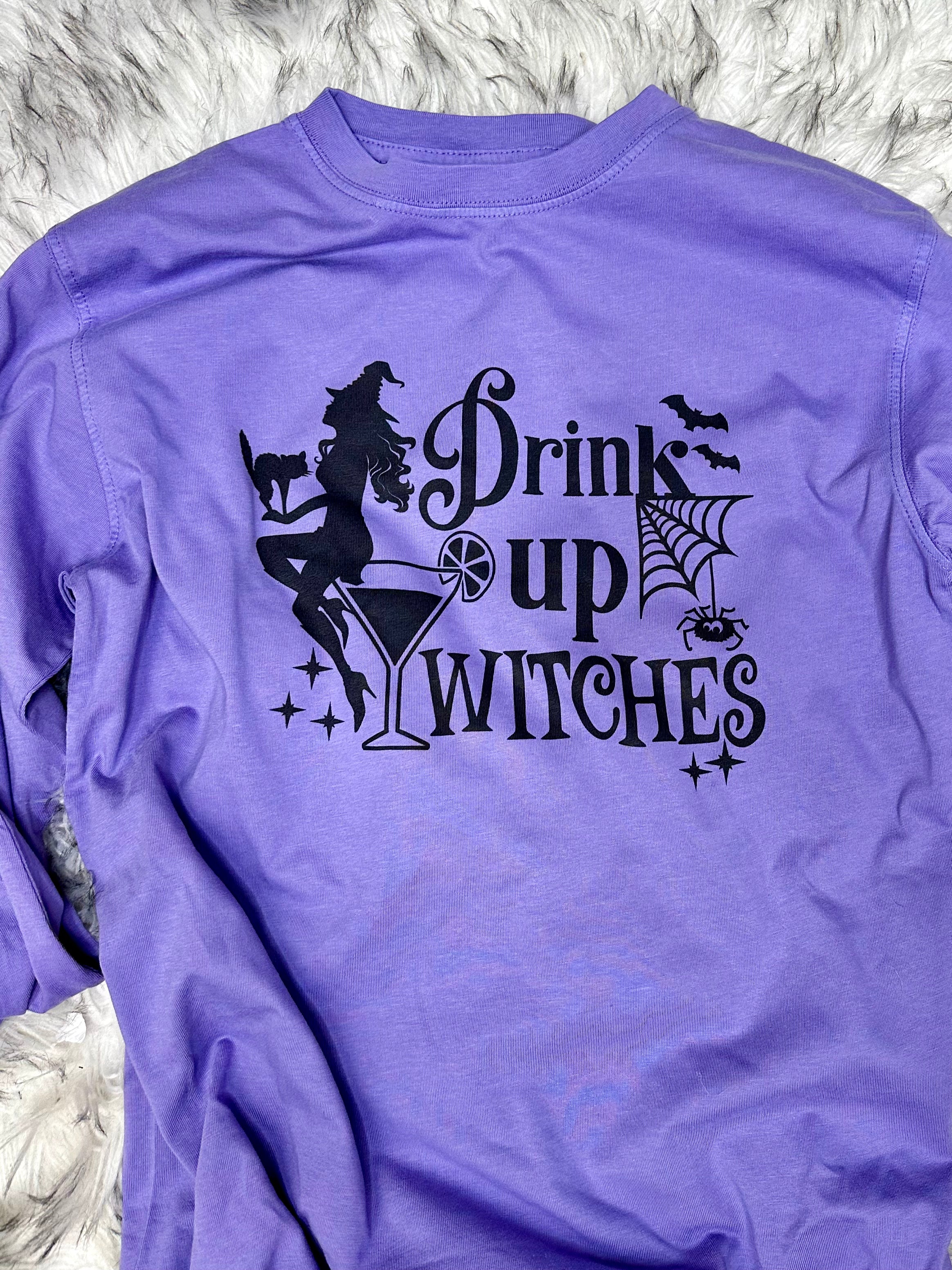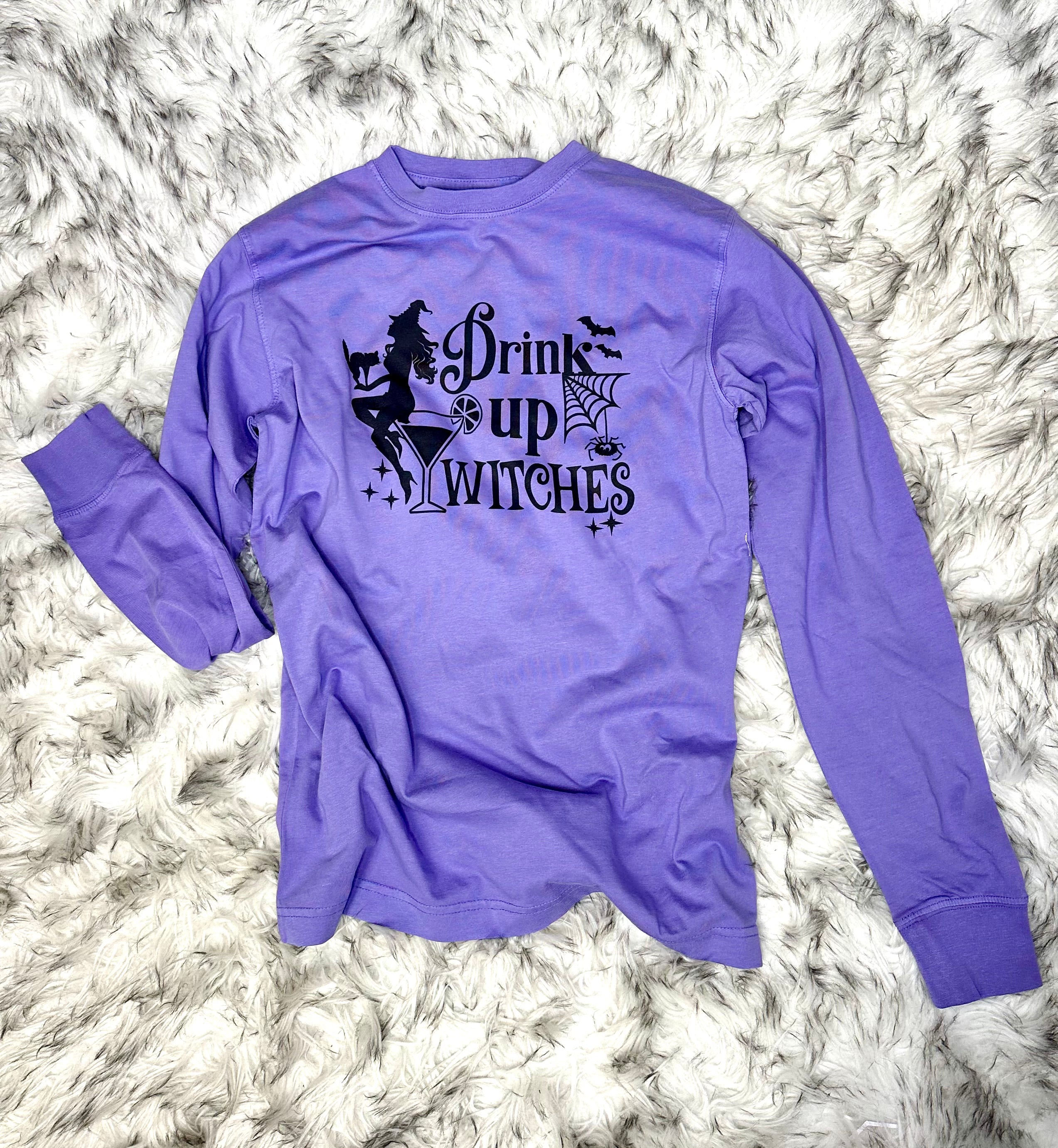 Get ready to brew up some fun in this "Drink Up Witches" long sleeve graphic tee! Perfect for Halloween festivities, this tee in a wicked purple haze color will have you feeling spooky and stylish. Cheers to a ghoulishly good time with this quirky and playful tee!