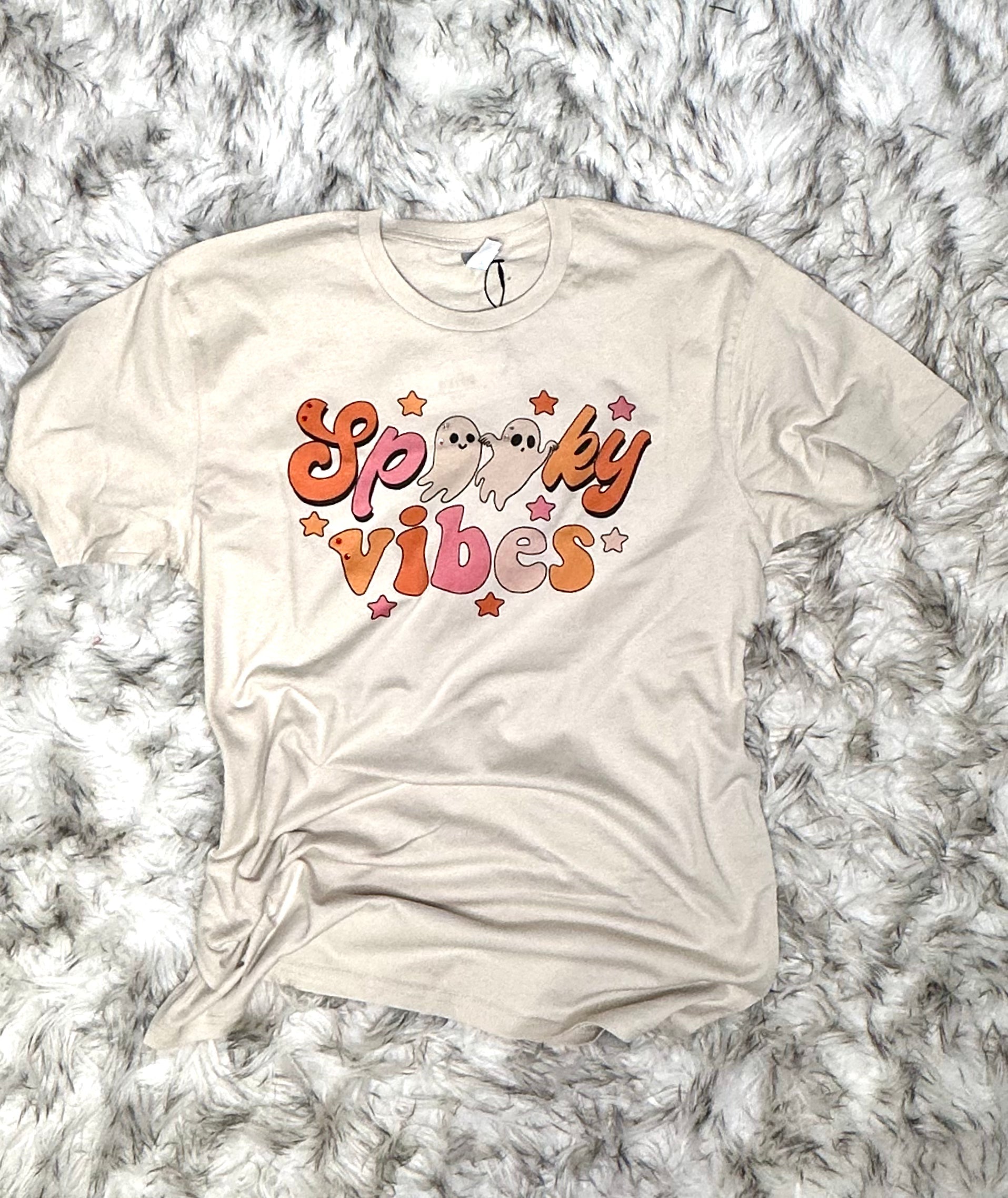 Get into the Halloween spirit with our Spooky Vibes graphic tee! This shirt features a fun design with bling and ghostly accents. Perfect for adding a touch of humor to your spooky season wardrobe. Get ready to rock some seriously chic and quirky vibes this Halloween!