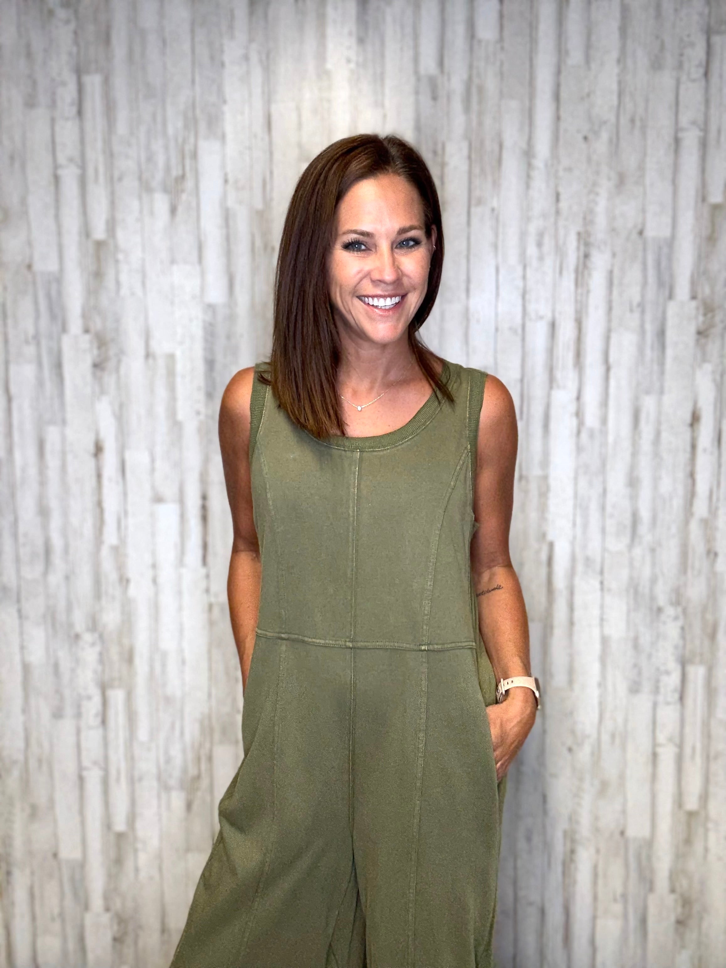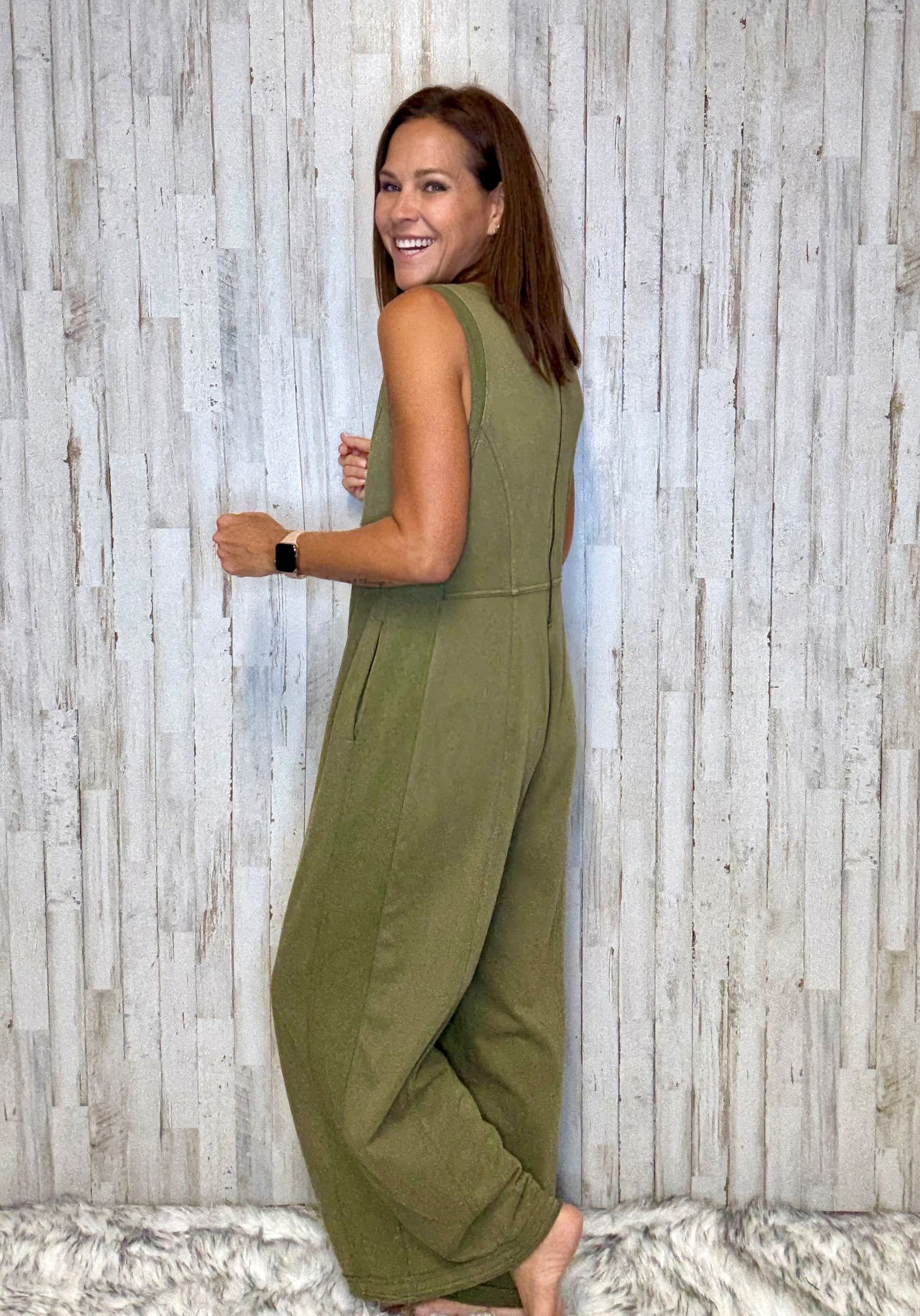 Step into this breezy and easy-wearing cotton jumpsuit featuring a wide-leg fit, back zipper closure, and sleeveless design. Perfectly finished with visible seam detailing and convenient side pockets.