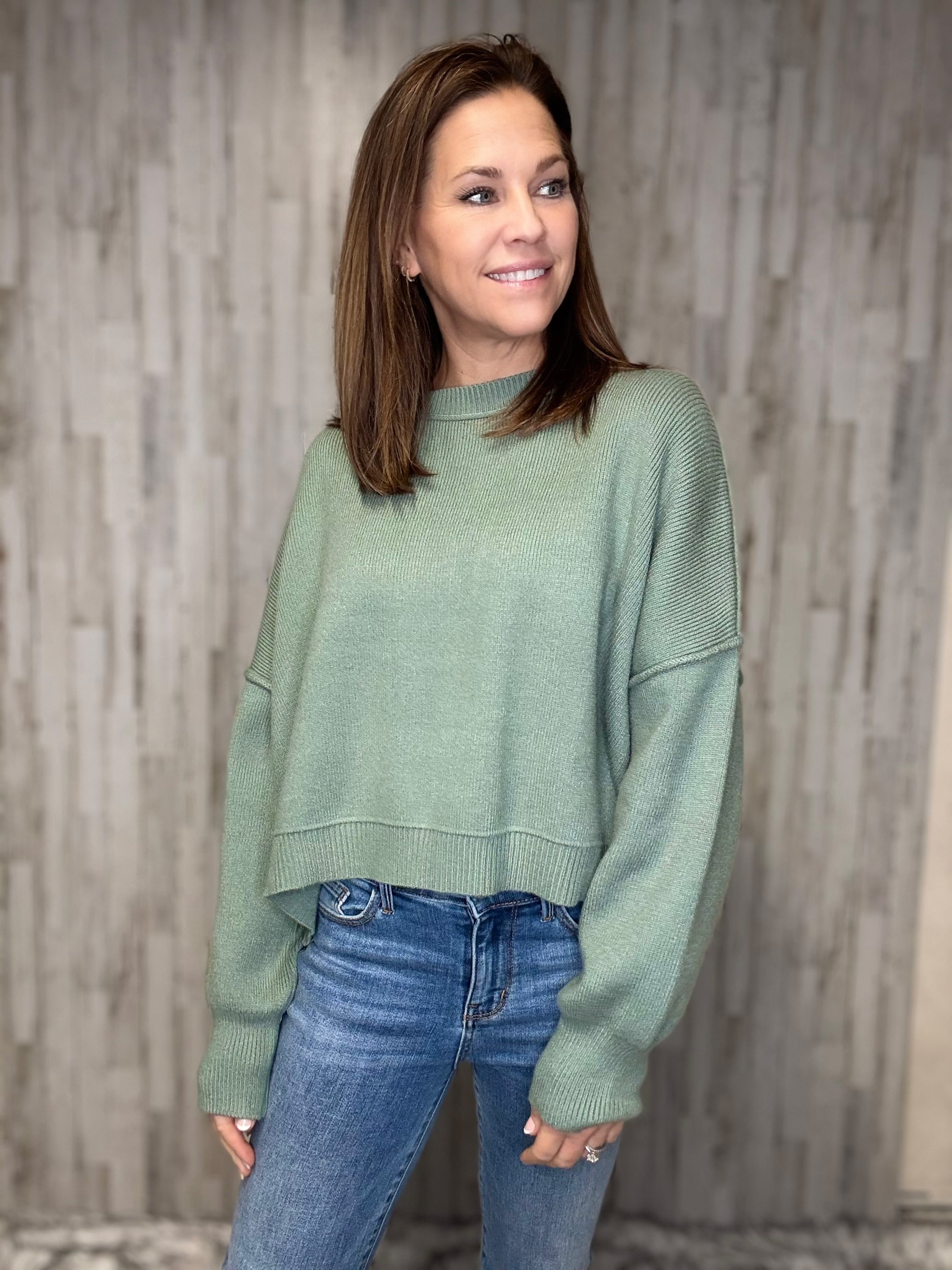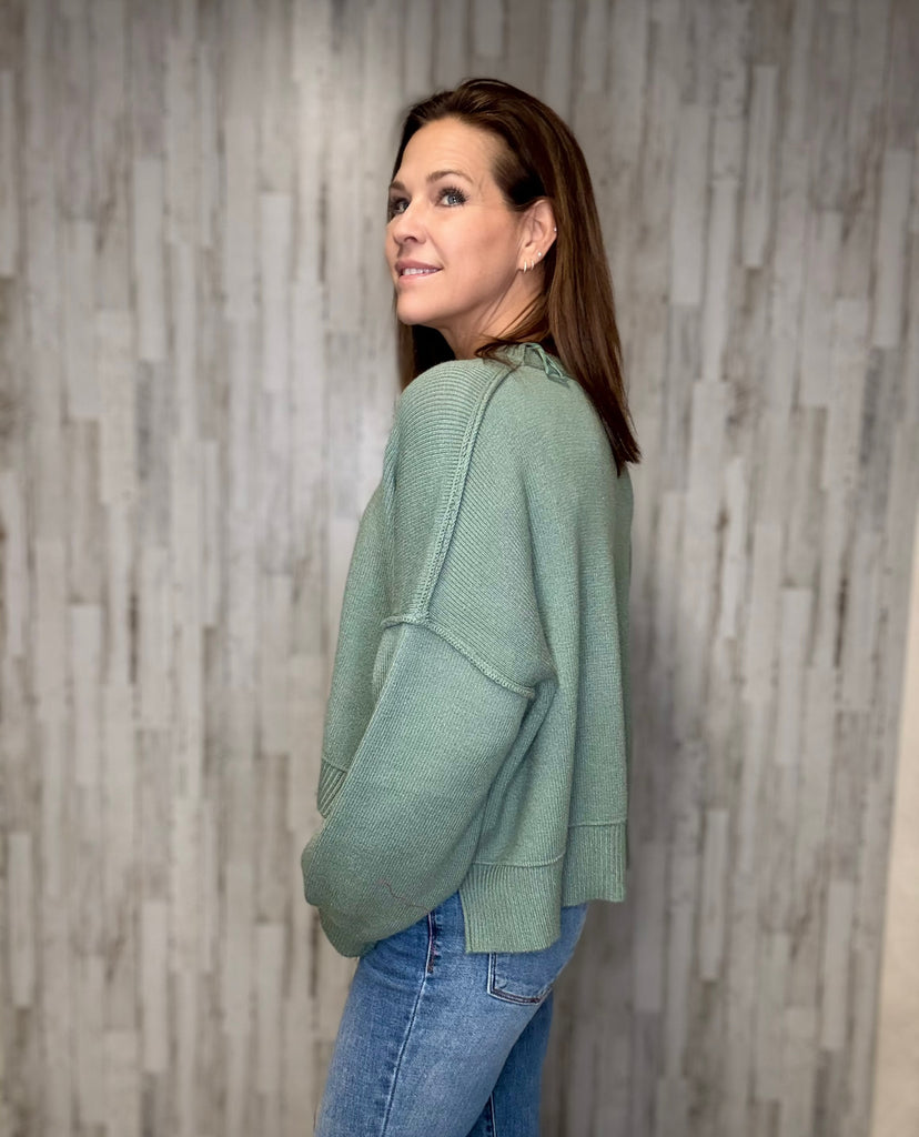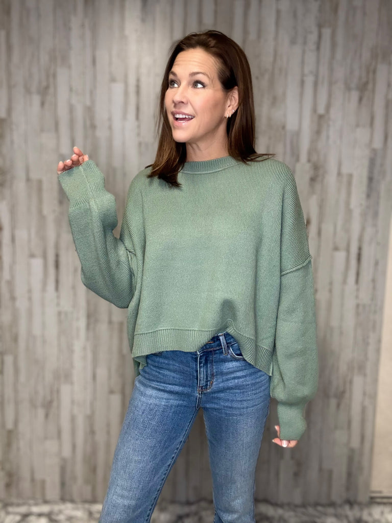 Get ready to chill in style with the Aurora relaxed crop sweater! In a refreshing pistachio color, this sweater features side slits for added comfort and a playful, laid-back vibe. Perfect for lounging or running errands, this sweater is a must-have for your wardrobe. (Sweatpants and slippers not included!)