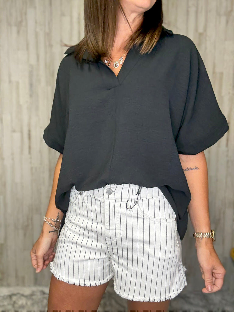 Introducing Avery, the perfect blend of style and comfort. With a solid top and open collared neck, this piece offers a chic look. Short dolman sleeves and band cuffs add a unique touch, while the vented hemline provides breathability. Non-sheer and lightweight, this black top is a must-have for any wardrobe.