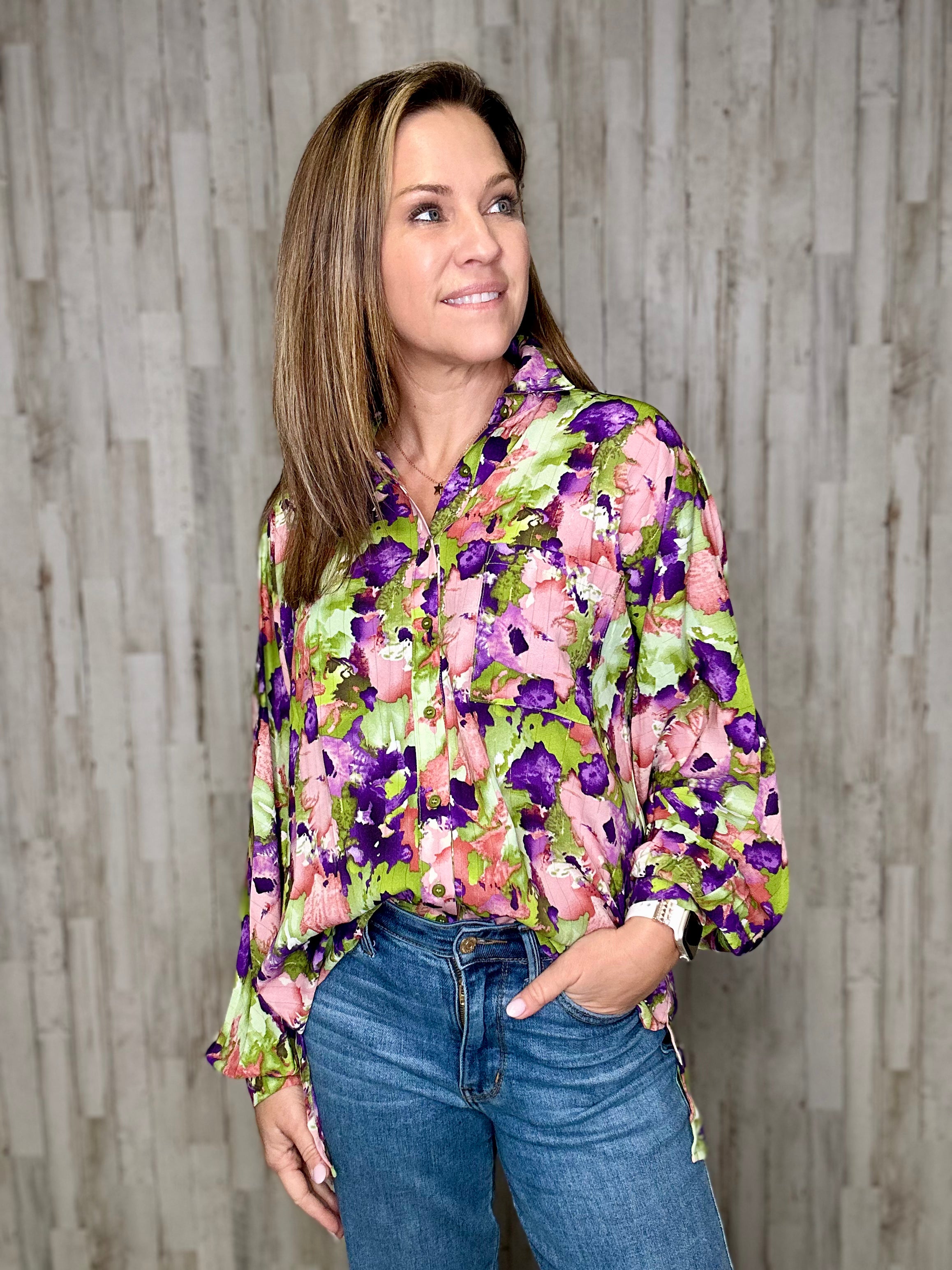 A timeless wardrobe essential, Bexley is a multicolor top crafted from a lightweight fabric. The unique purple floral print, collared neckline, and chest pocket adds an element of sophistication, while the back wrinkle detail, dolman sleeves, and band cuffs lend a hint of style. The high low hem and button-front design make this the perfect statement piece.