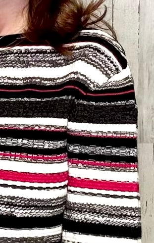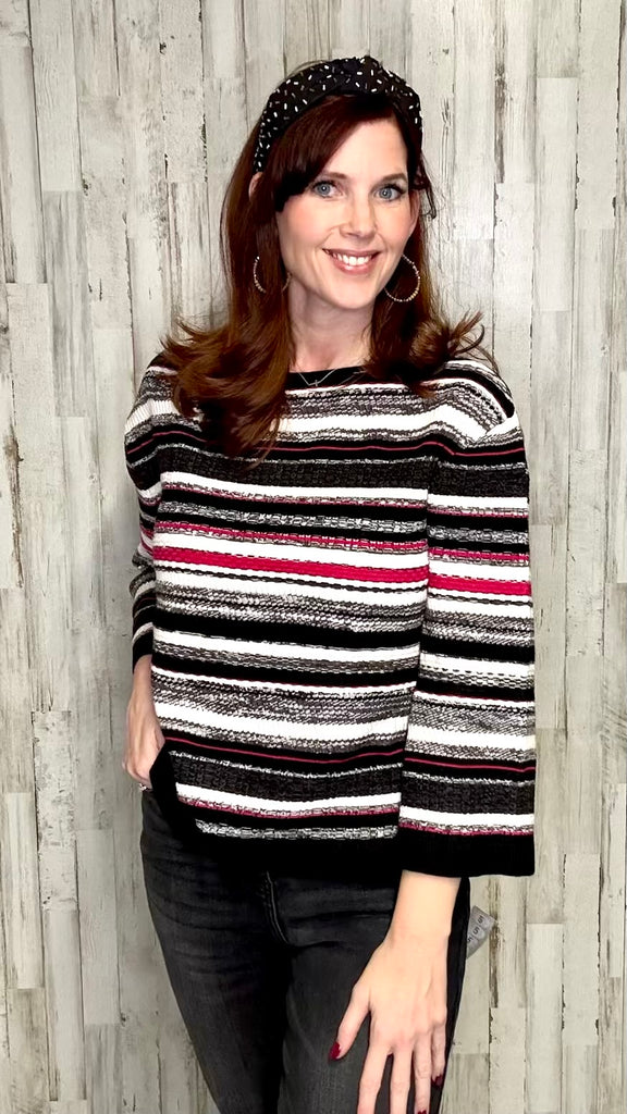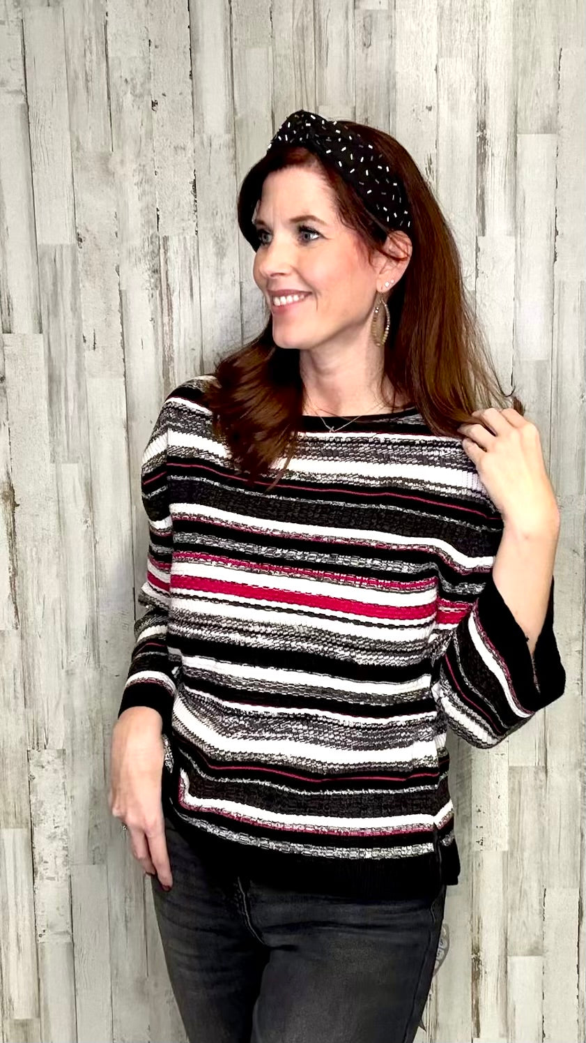 his sweater combines classic charm with contemporary style, featuring a boat neckline that accentuates the collarbone and elongates the neck. The mesmerizing stripe pattern and subtle hints of Ruby add a touch of sophistication, making it effortless for both casual outings and more refined occasions.