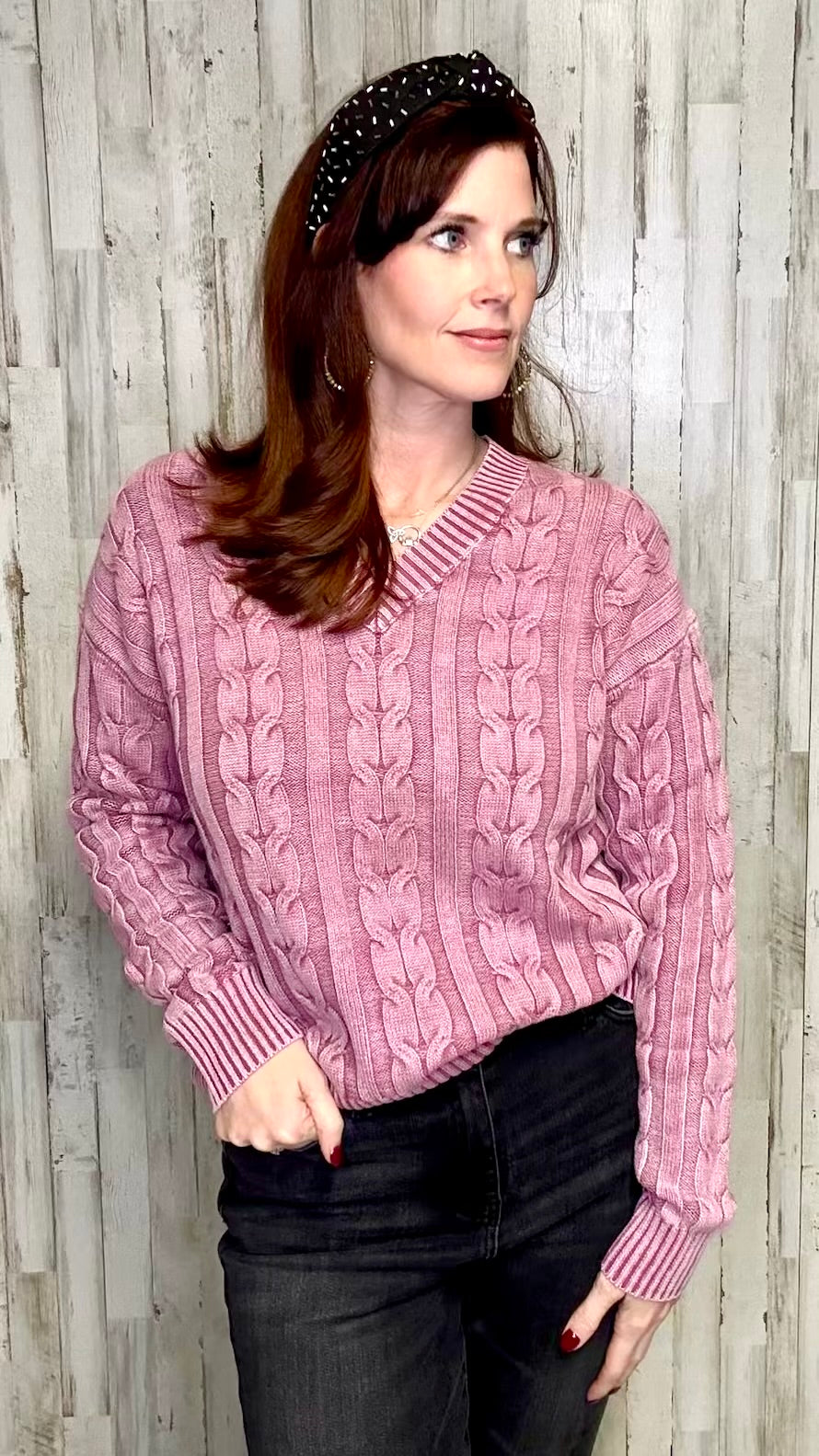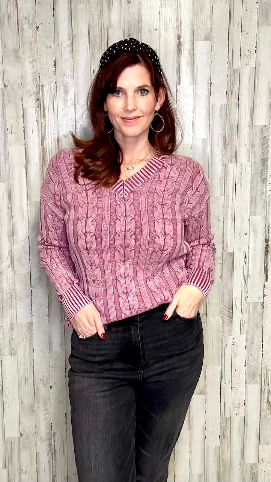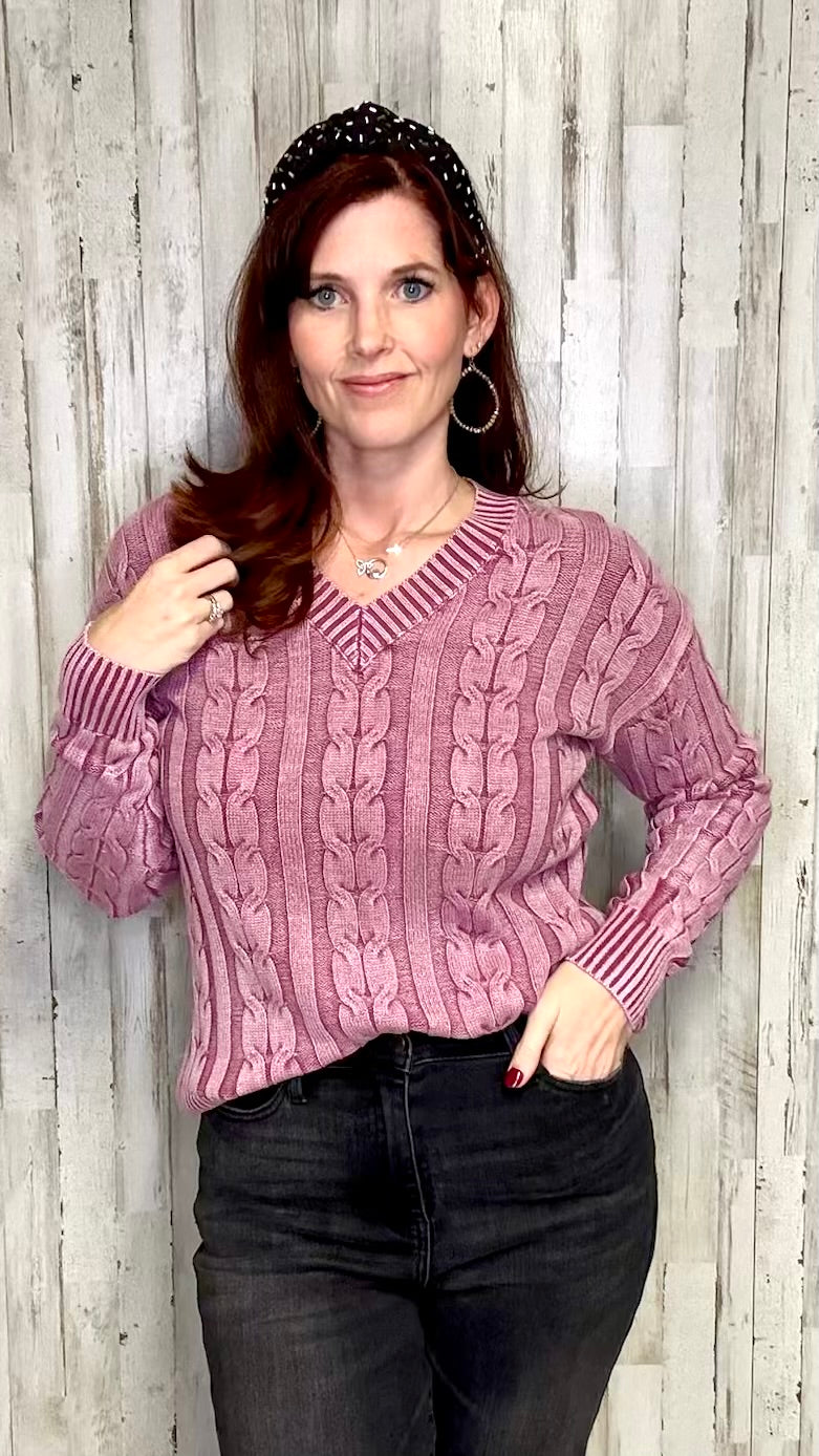 Experience luxurious comfort and style with our Brooke sweater. Made from high-quality Cold Dye Cable Knit fabric, it features a V-neck and long sleeves for a classic look. The rich cabernet color adds a touch of sophistication to any outfit. Stay warm and chic this season with Brooke.