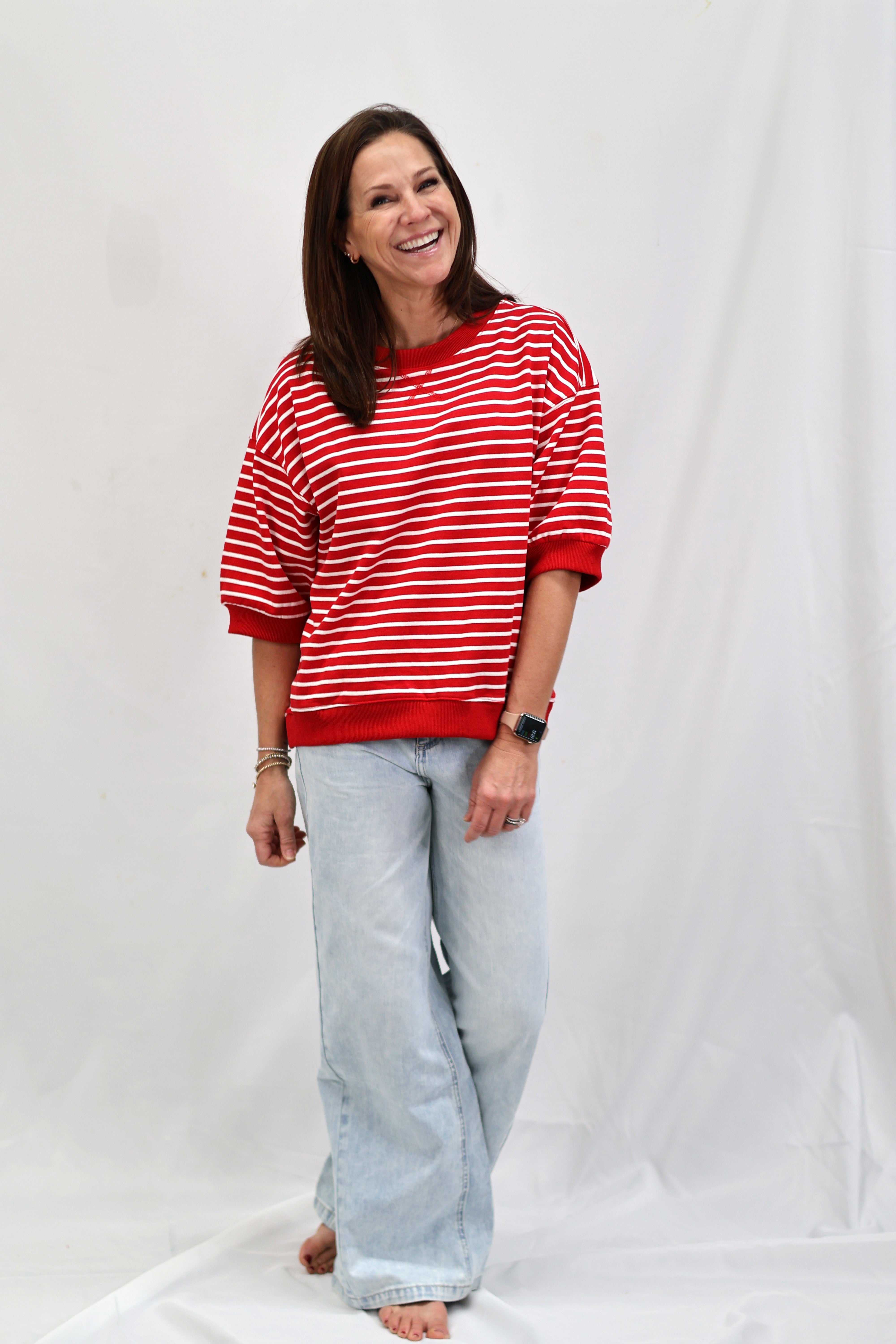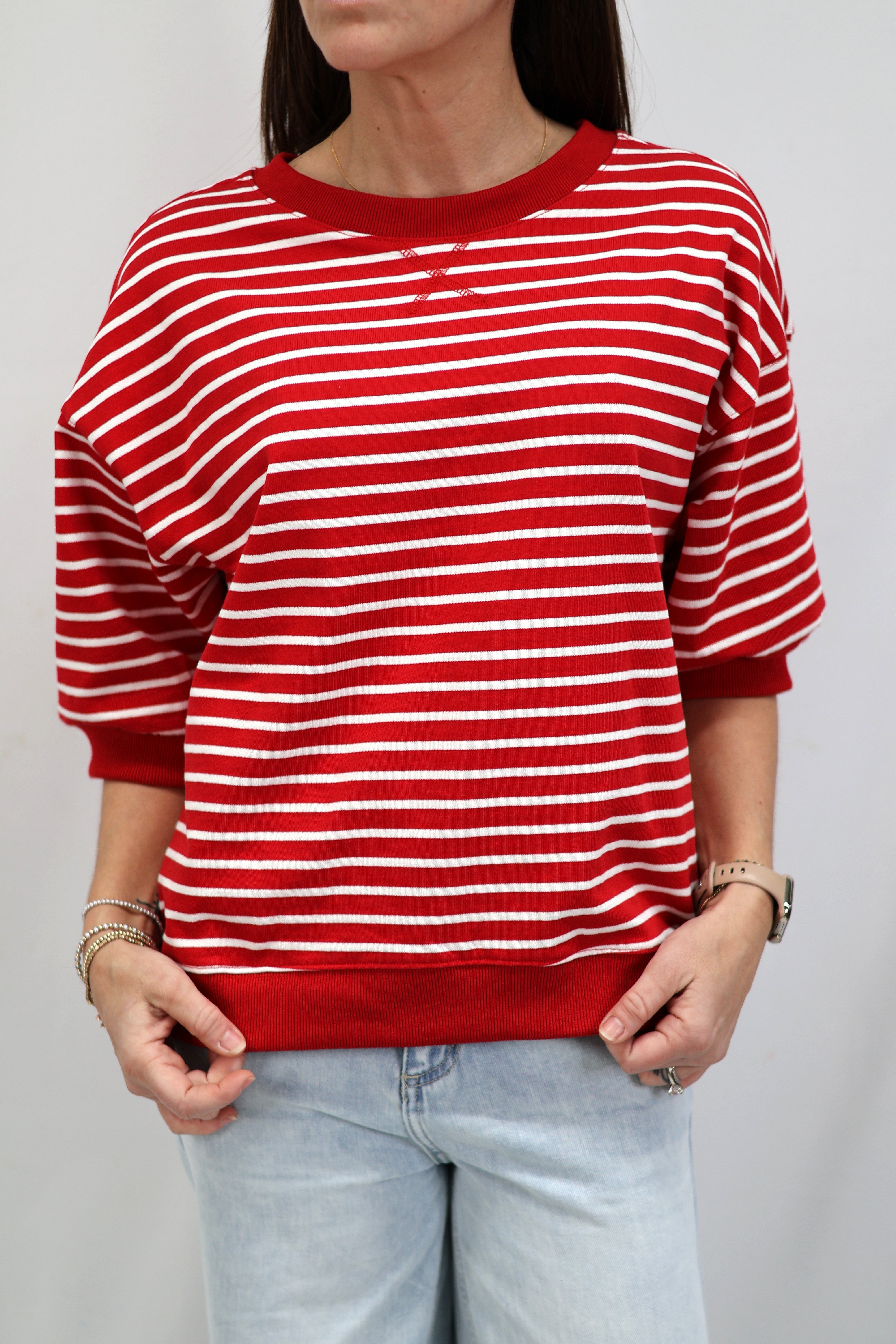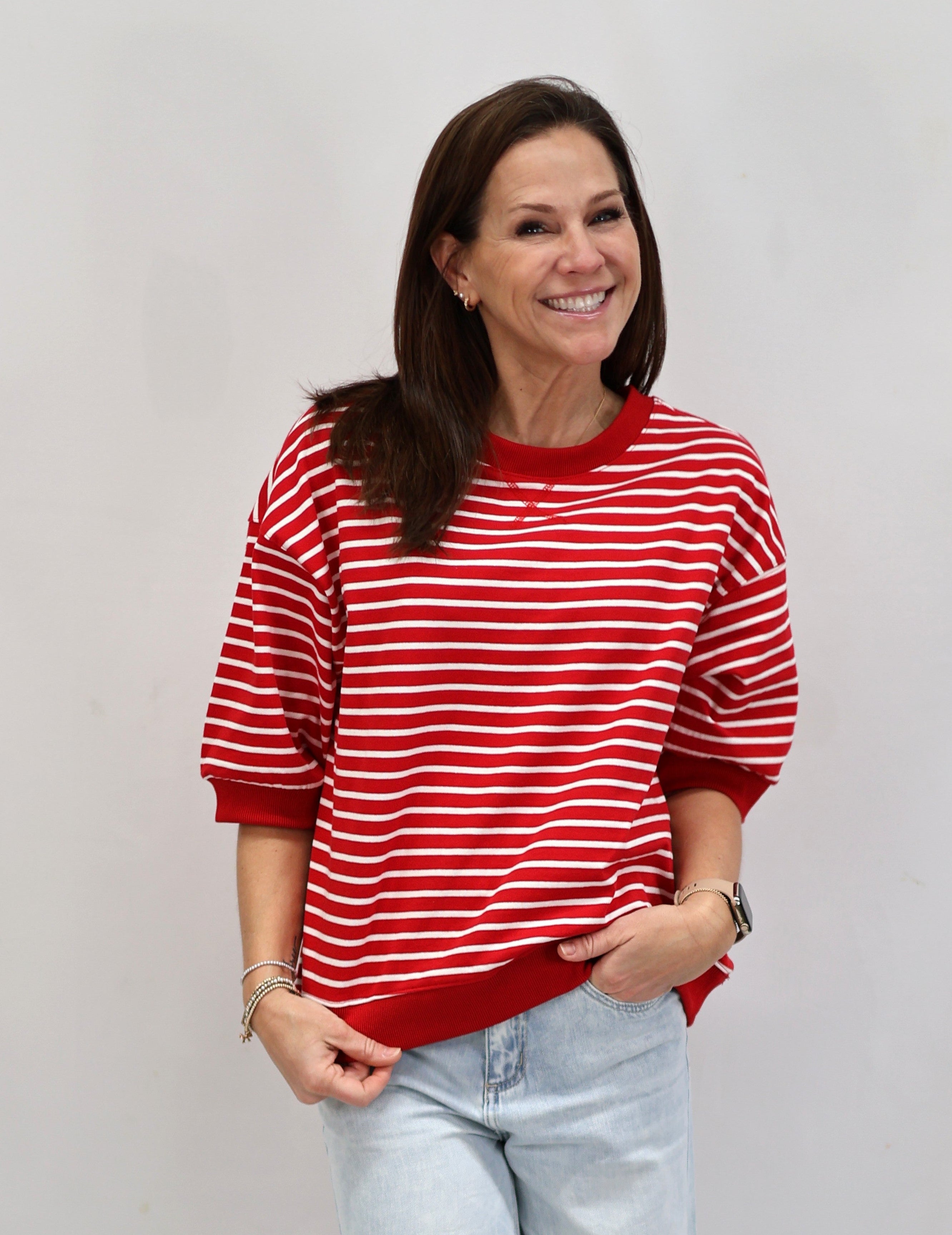 Stripes are having a moment, and this Cape Town Pullover Top is here to prove it. Featuring bold red and white knit stripes, this breezy short-sleeve number has all the charm of a classic with zero fuss. The relaxed round neckline and unlined construction keep things light and comfortable, making it perfect for layering or wearing solo. Whether you're channeling nautical vibes or just want a top that works as hard as you do, this striped essential delivers effortless style.