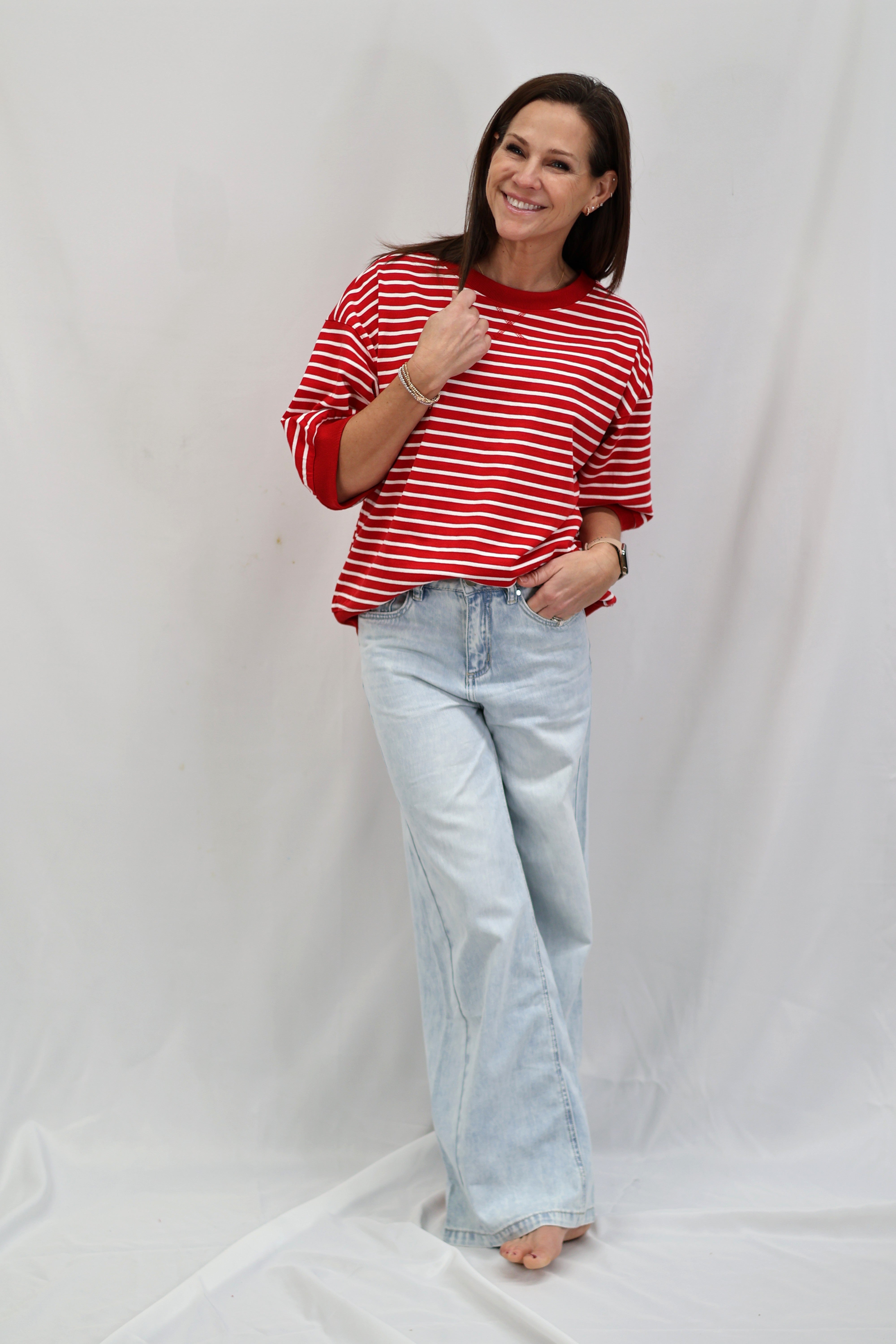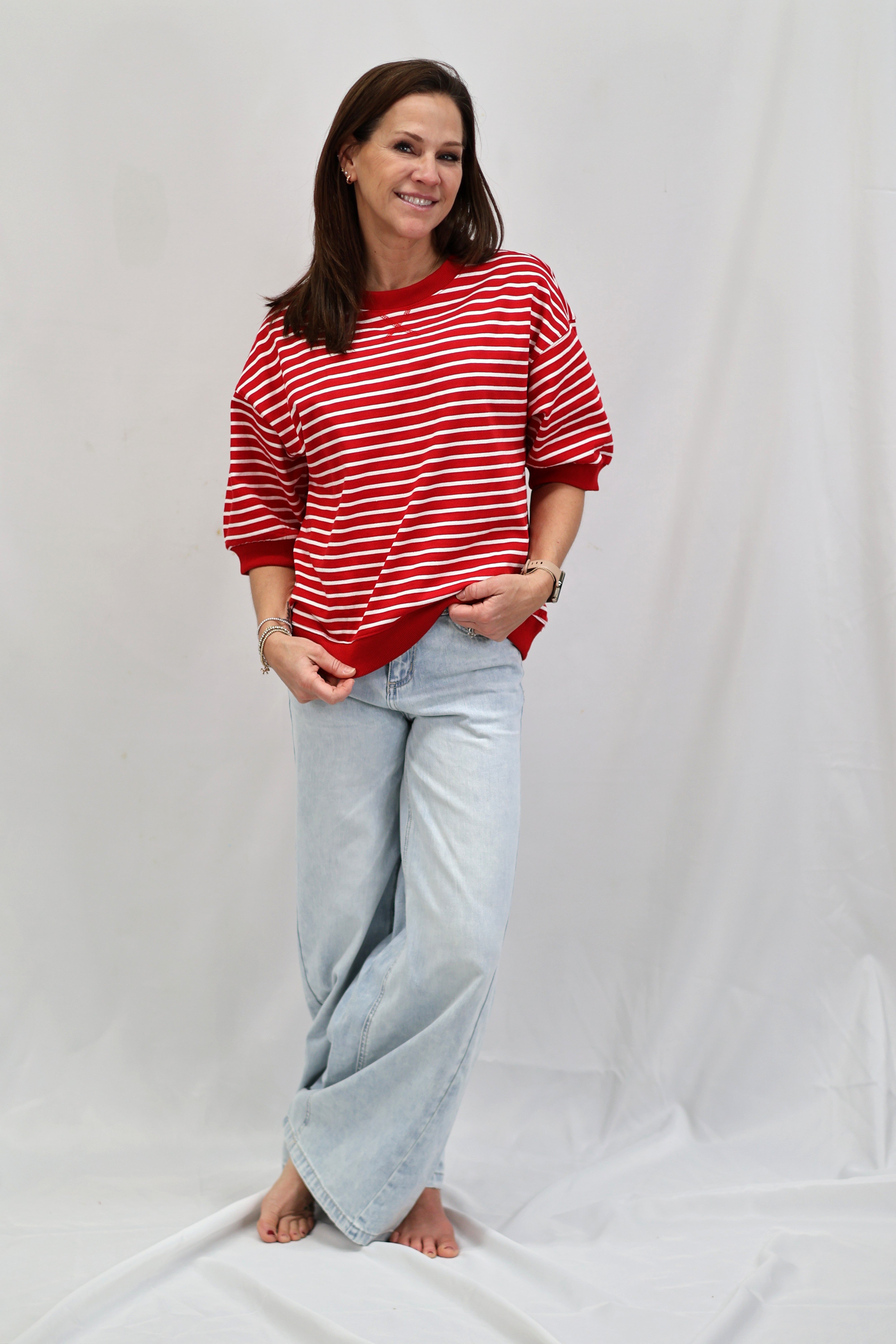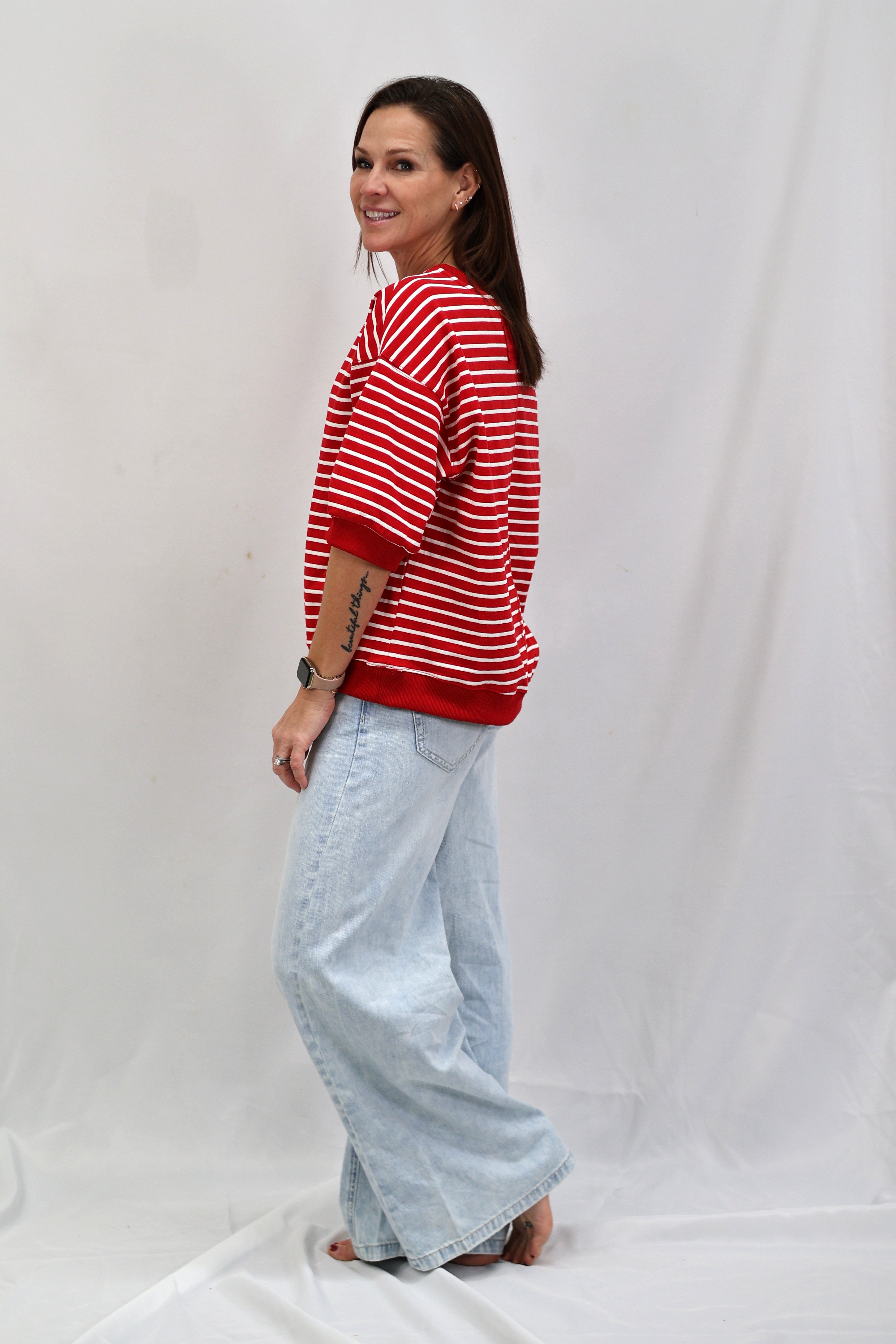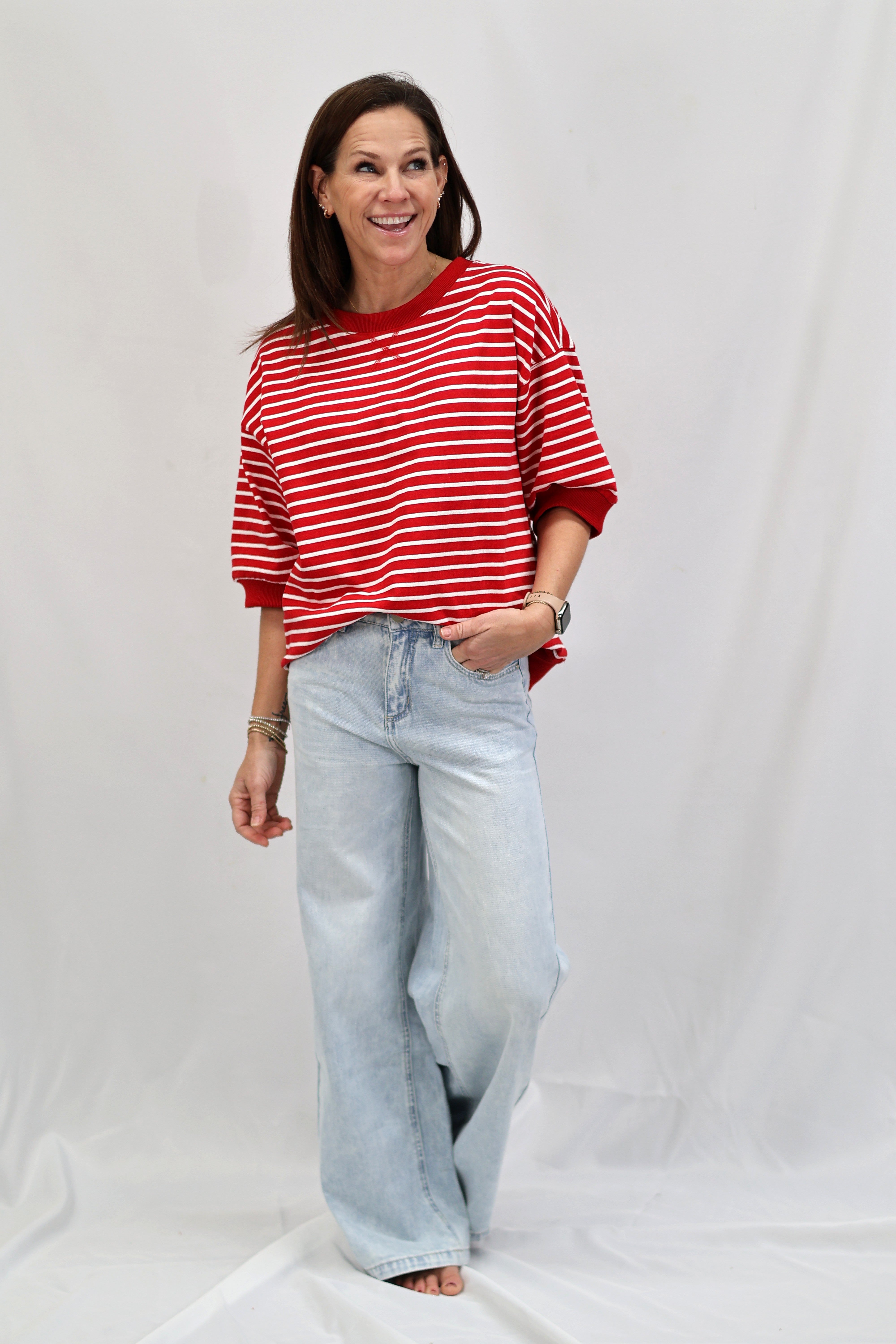 Stripes are having a moment, and this Cape Town Pullover Top is here to prove it. Featuring bold red and white knit stripes, this breezy short-sleeve number has all the charm of a classic with zero fuss. The relaxed round neckline and unlined construction keep things light and comfortable, making it perfect for layering or wearing solo. Whether you're channeling nautical vibes or just want a top that works as hard as you do, this striped essential delivers effortless style.