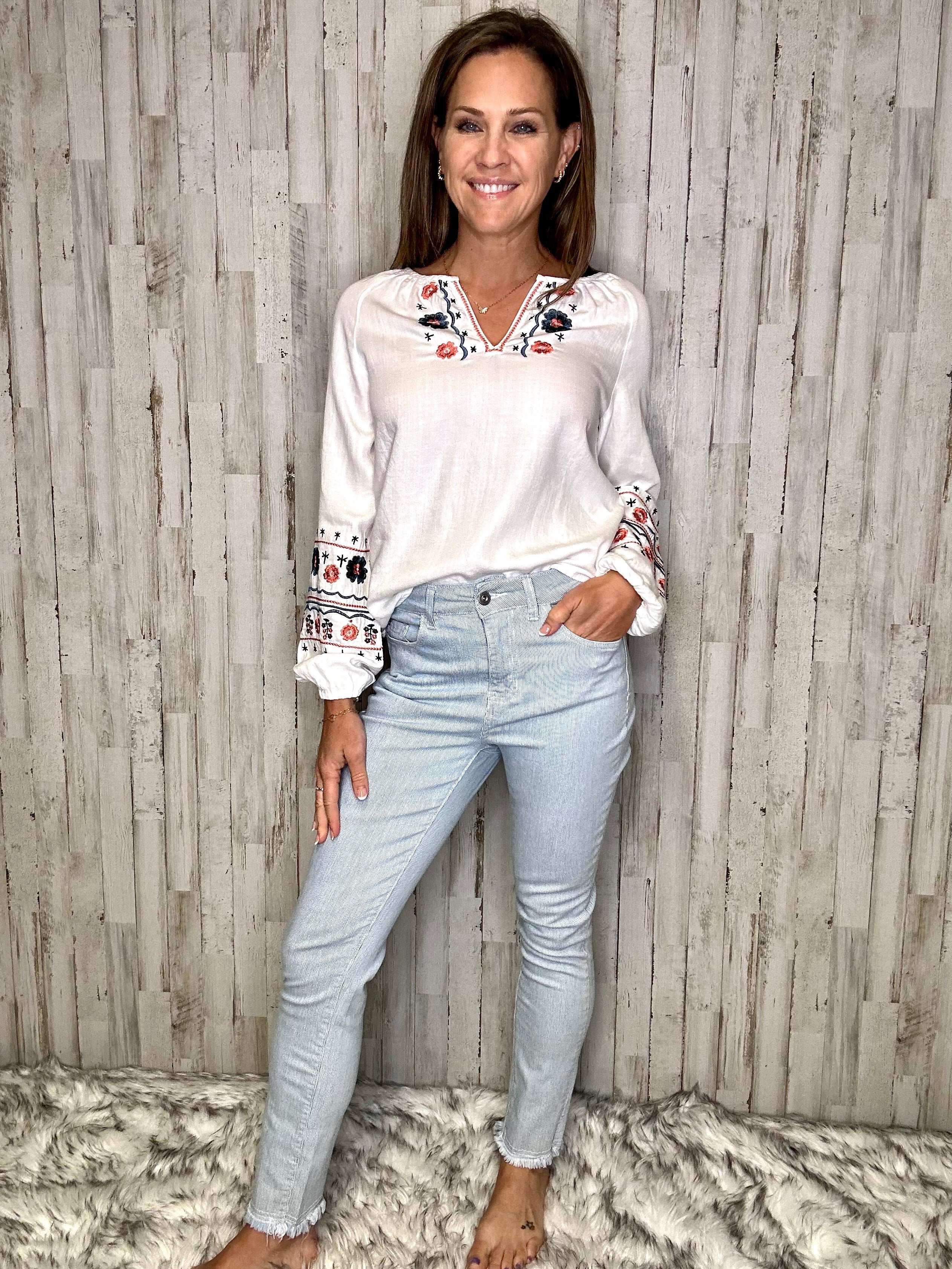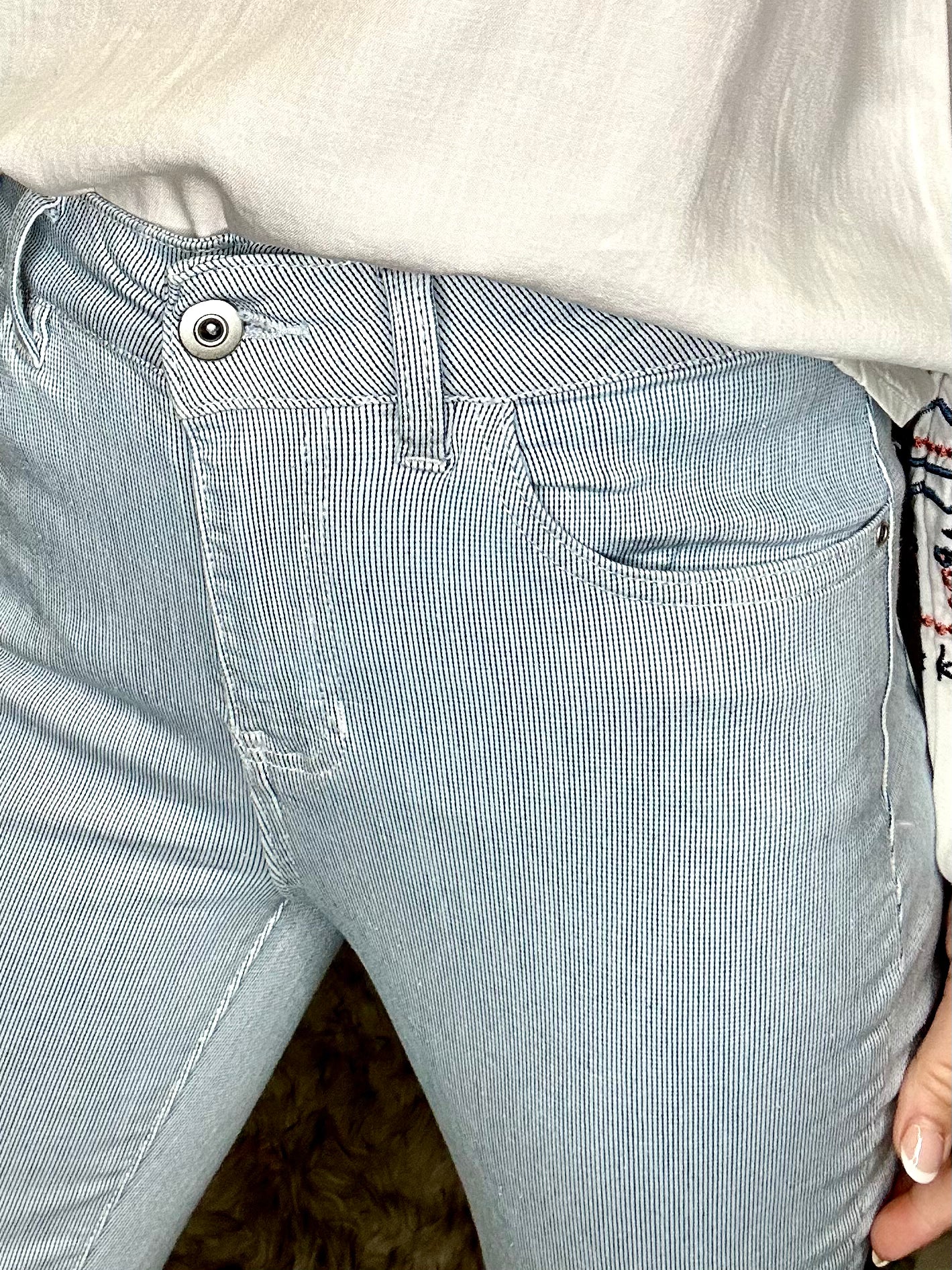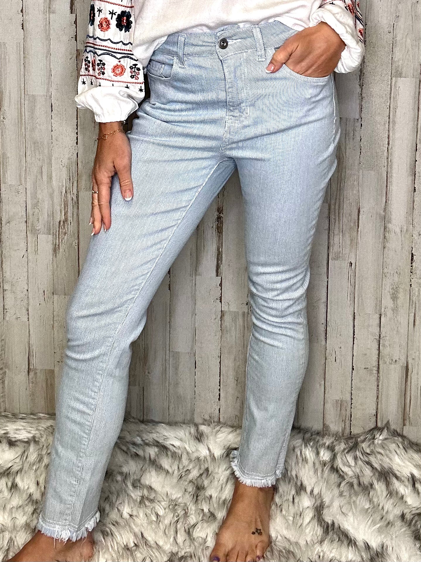 Put a swing in your step this spring with this Pin striped Laredo denim jean. Featuring side split hem details and five practical pockets, you can dress these skinny ankle pants up or down easily. Try them with a simple white T-shirt or a charming cotton blouse and love your look!