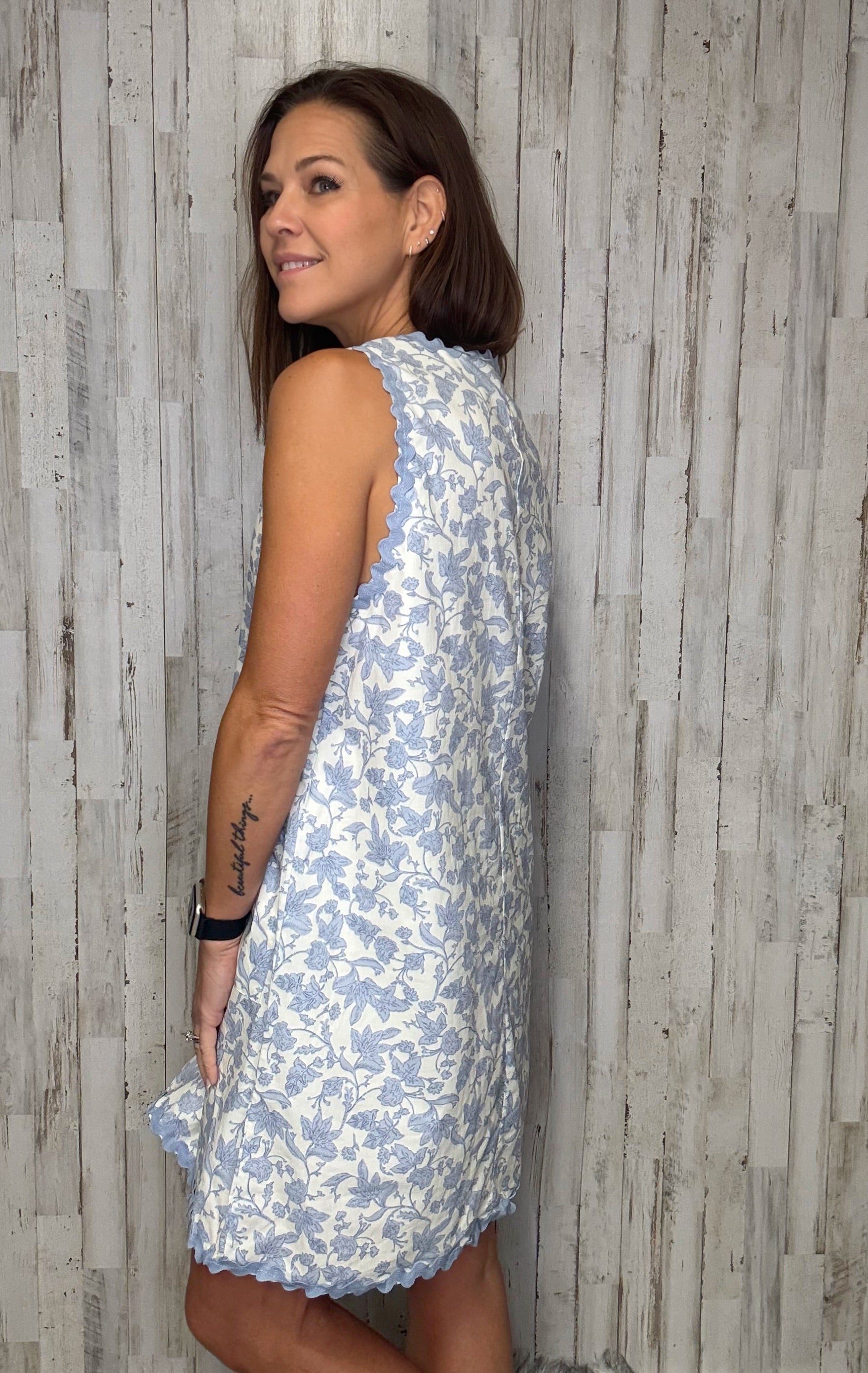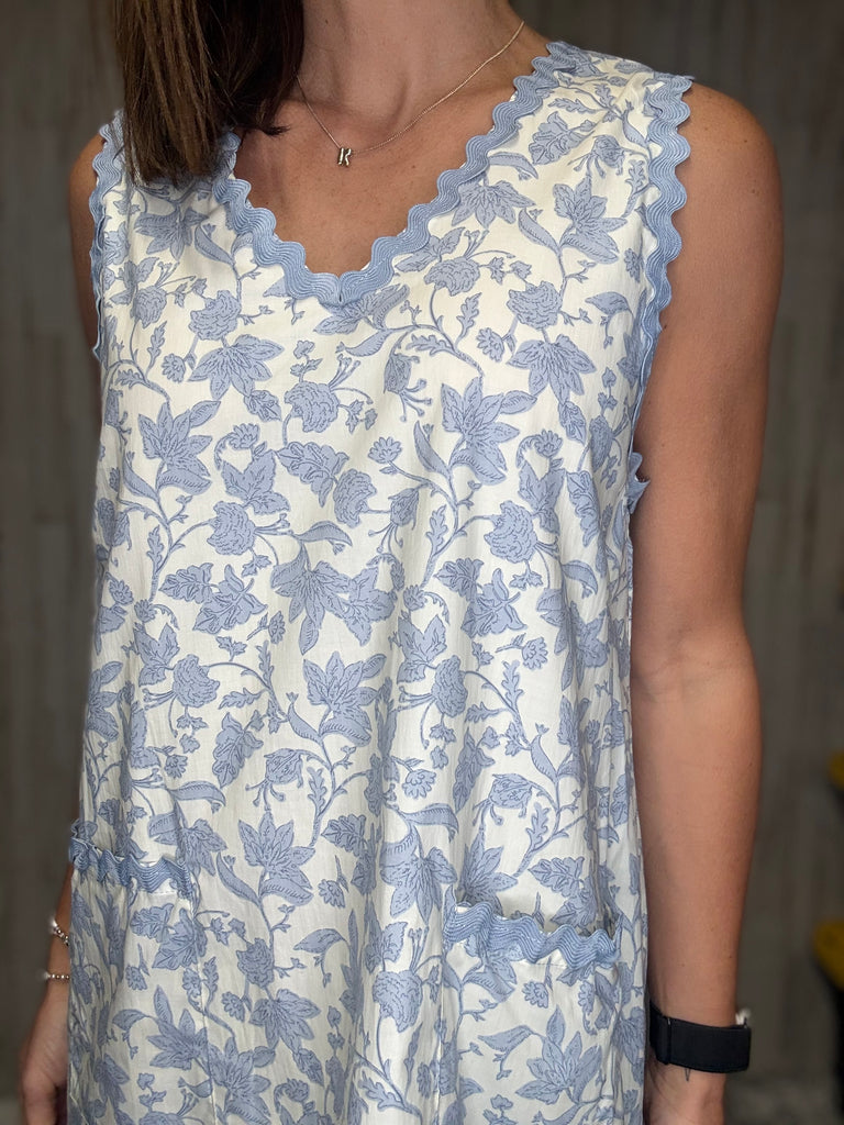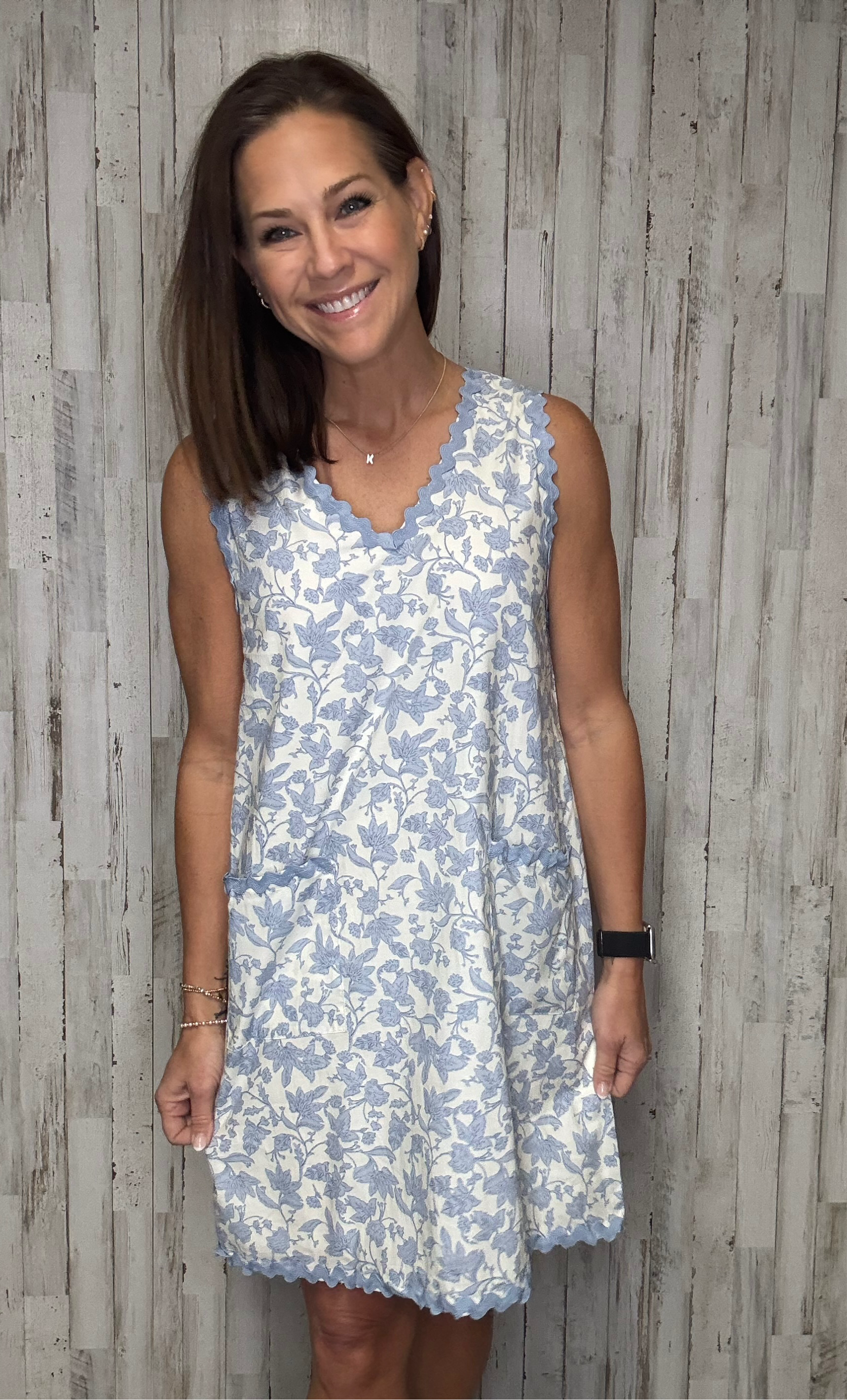 Indulge in luxury with our Faye Floral Print Dress. This exquisite, lined dress boasts a refreshing floral print and a flattering V-neck, perfect for showcasing your sophisticated style. The non-sheer, lightweight fabric and front pockets add effortless elegance, while the swirl solid trimming edge adds a touch of charm. Available in a stunning shade of blue.