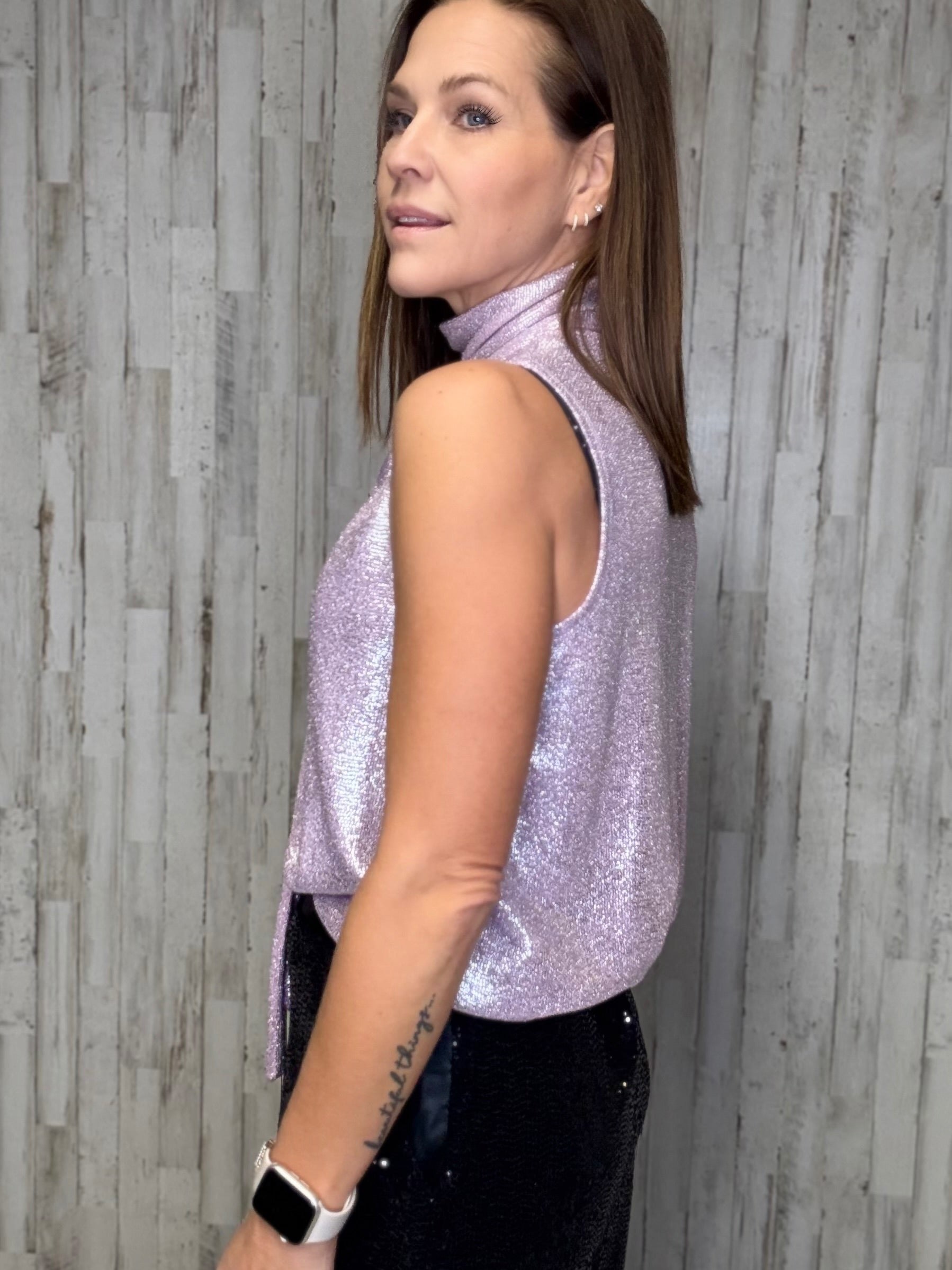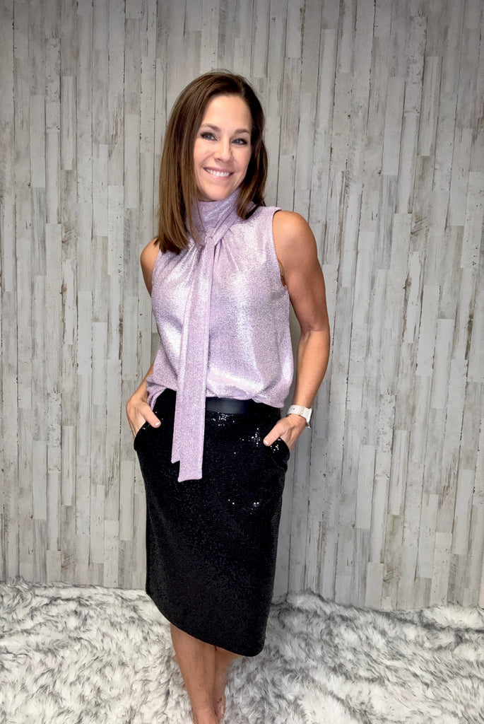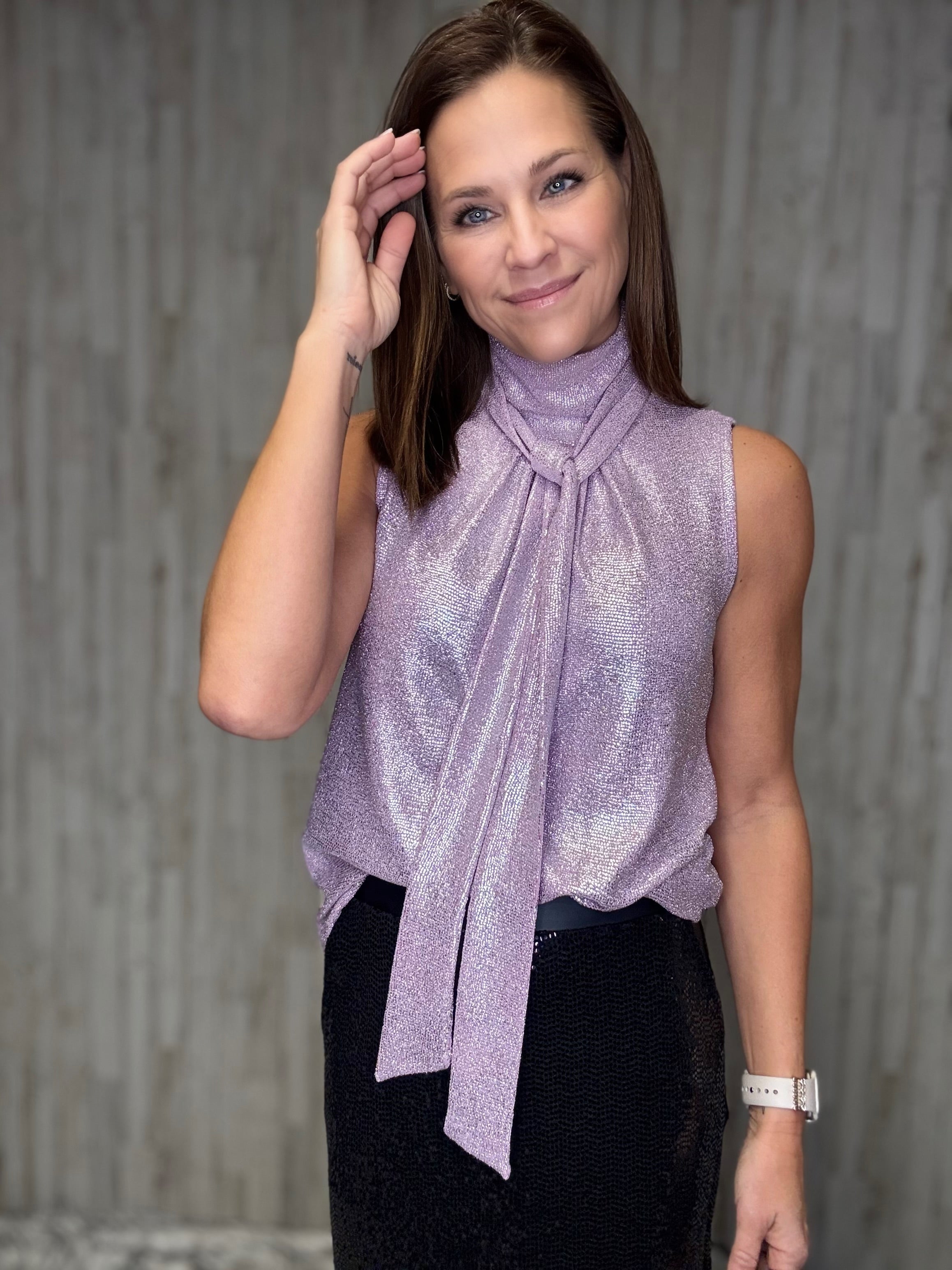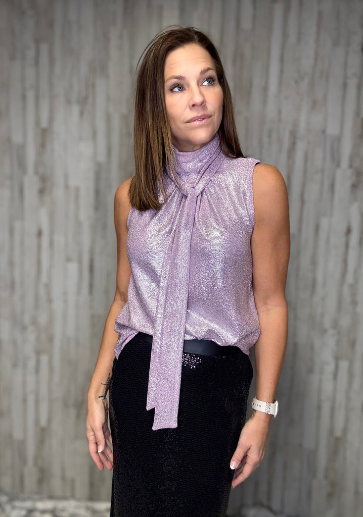 Get ready to shine bright in the Glitter and Glitz Top! This sleeveless top features a playful mock neck-tie detail that can be styled in multiple ways, while the micro-pleats and soft-draped body add a feminine touch. With a bra-friendly design and a scalloped hemline, this top is perfect for any occasion.