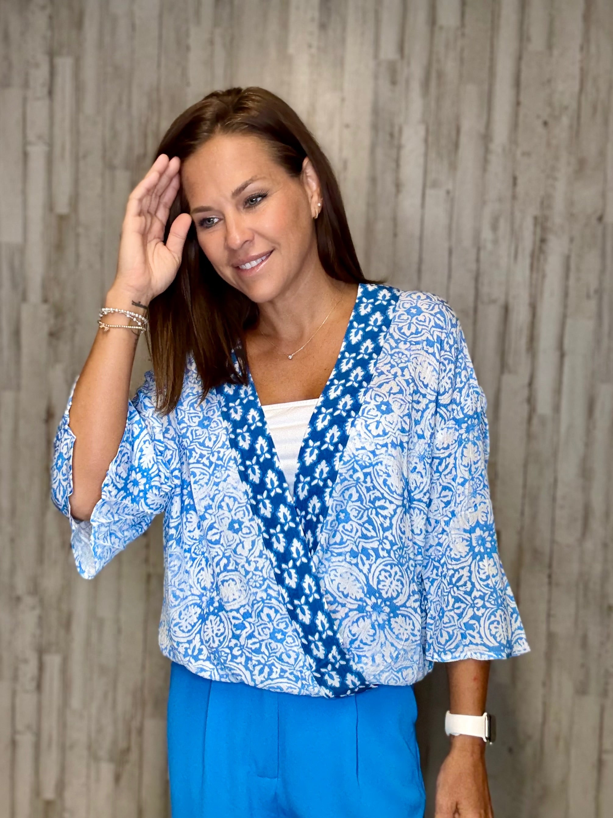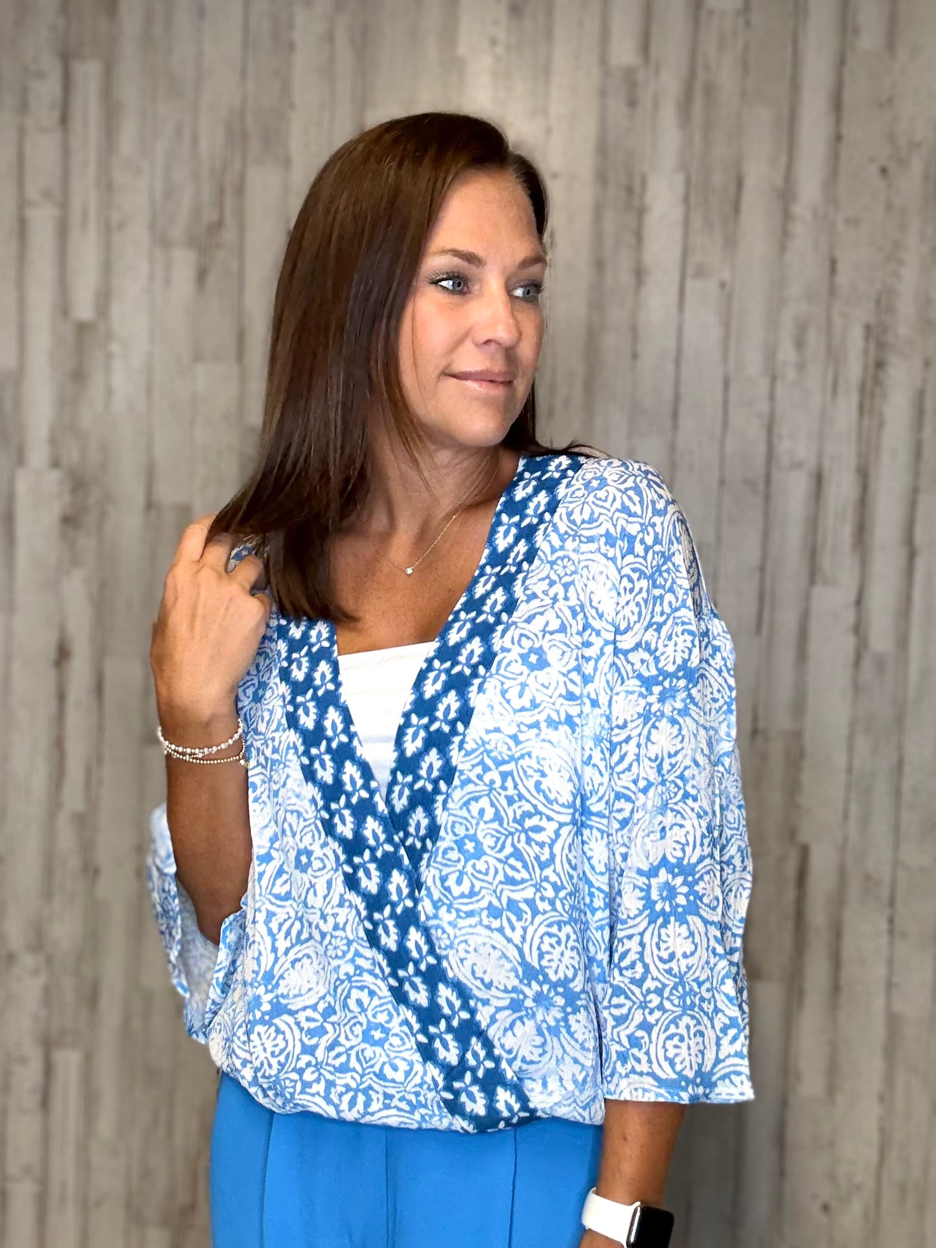 Experience the perfect blend of style and comfort with Stevie - our Printed Viscose Overlap Blouse. With 3/4 wide sleeves and an elastic waist, this blouse offers a flattering fit and easy movement. Made of high-quality viscose, it's perfect for any occasion. Elevate your wardrobe now.