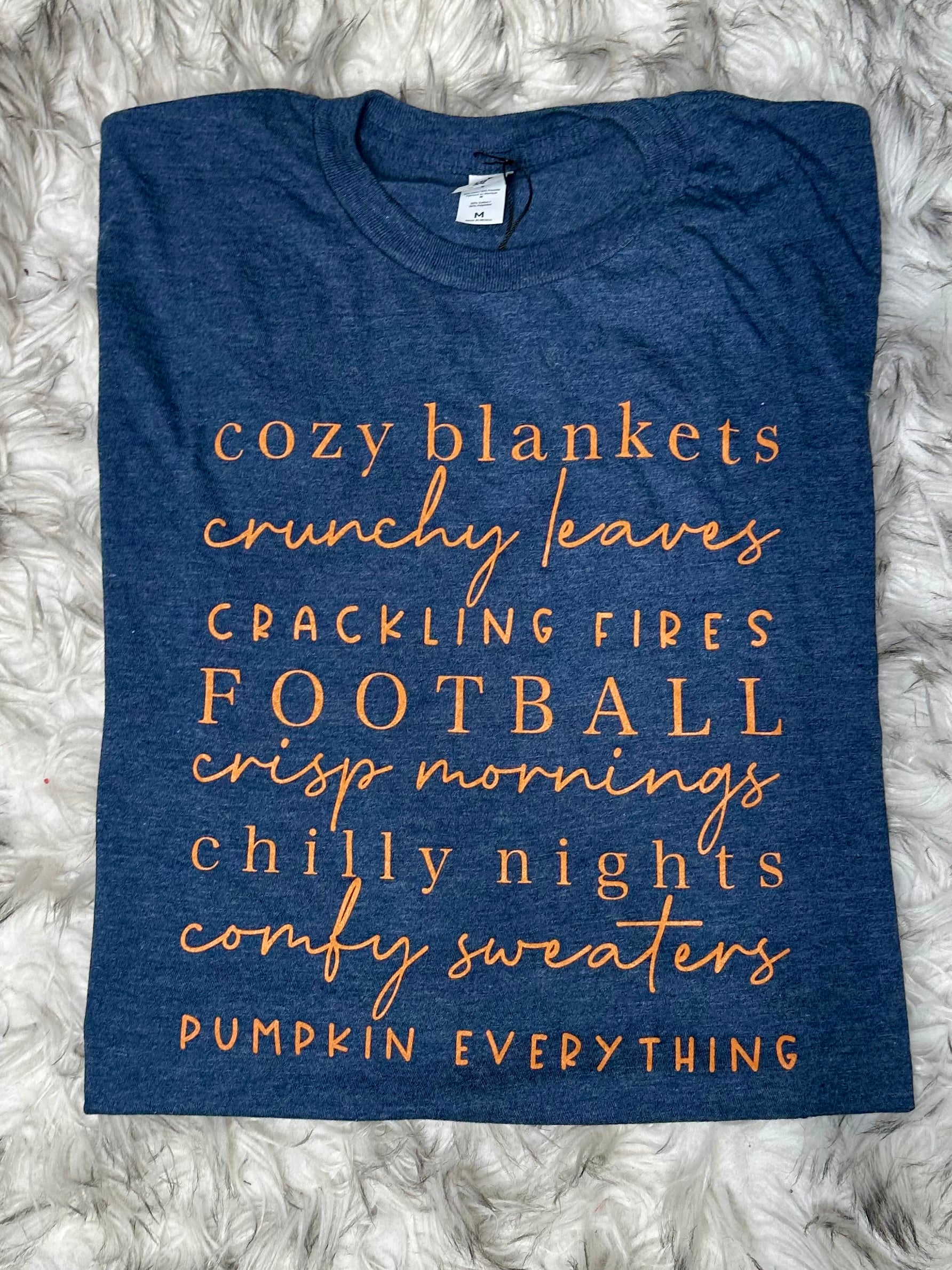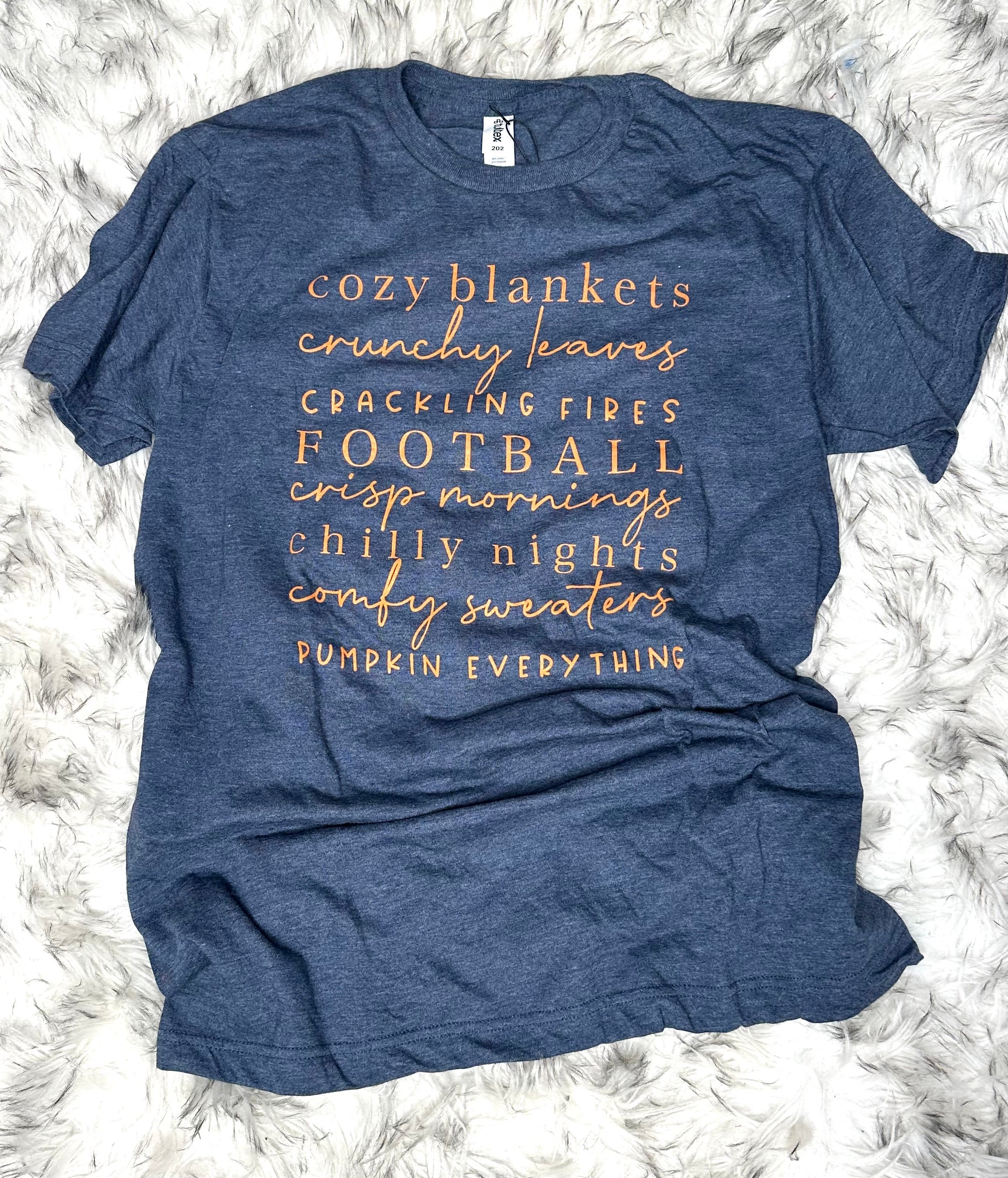 Do you feel the autumn vibes? Get ready to embrace the season with our All Things Fall Graphic Tee! Made from super soft material, this tee celebrates all things cozy including blankets, crunchy leaves, football, and crisp mornings. Perfect for anyone who loves fall and a little humor!