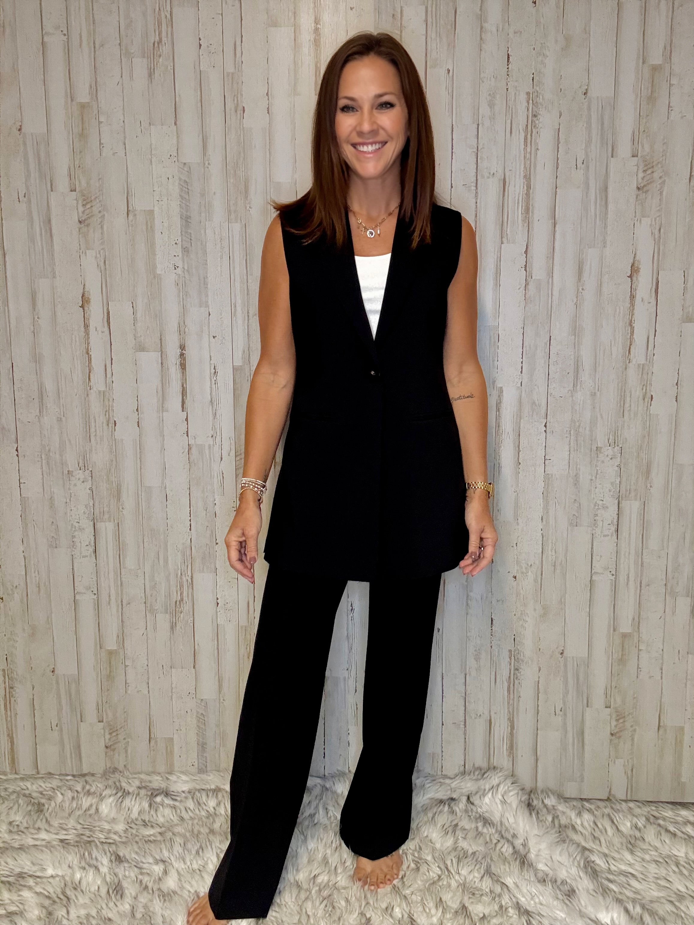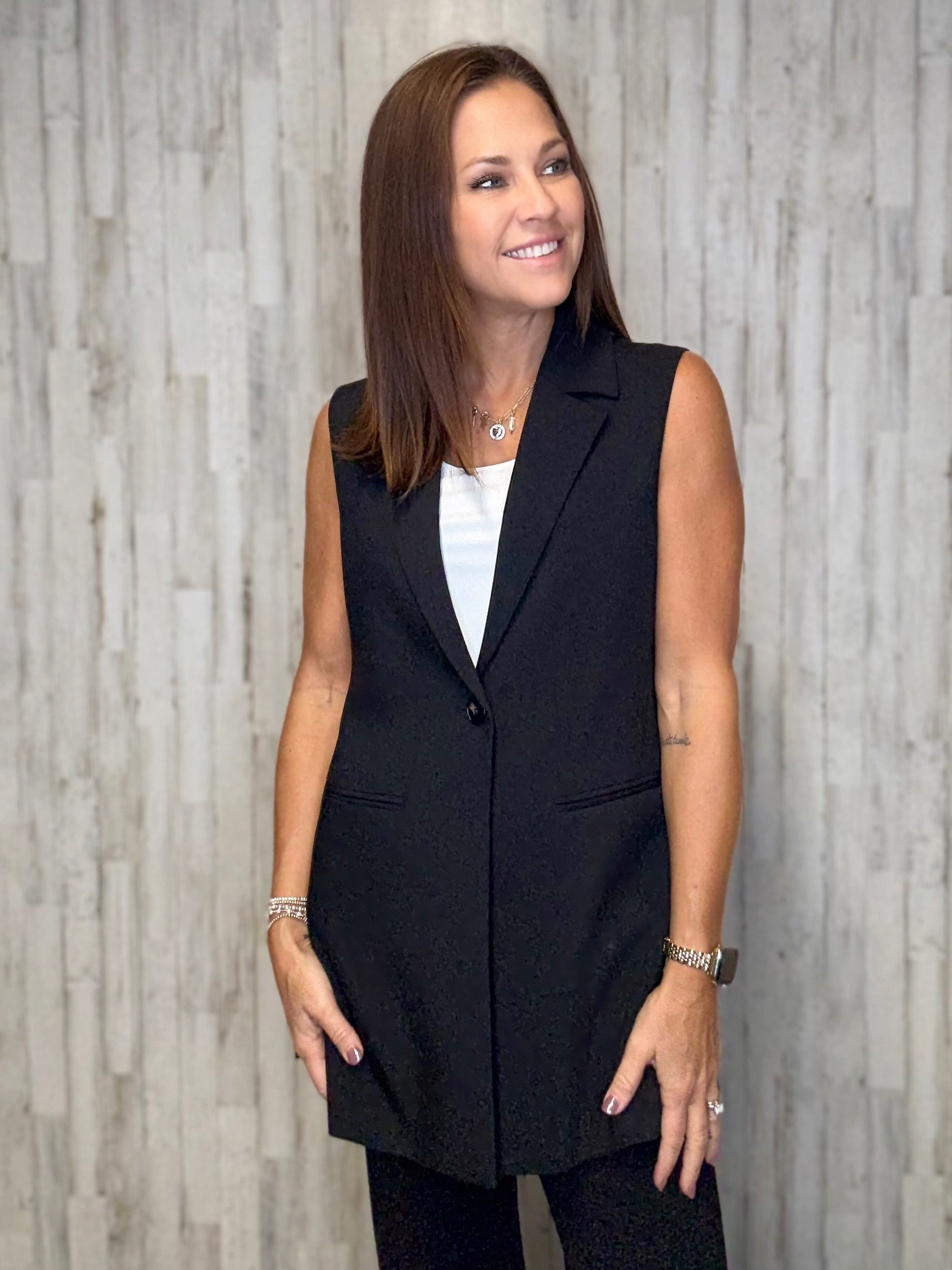 "Transform your outfit with the Bentwater Sleeveless Vest. This tailored and lined collared vest exudes luxury with its sleek single button front and two pockets, adding both style and functionality to your wardrobe. In a chic black, this vest is a must-have for any sophisticated wardrobe."