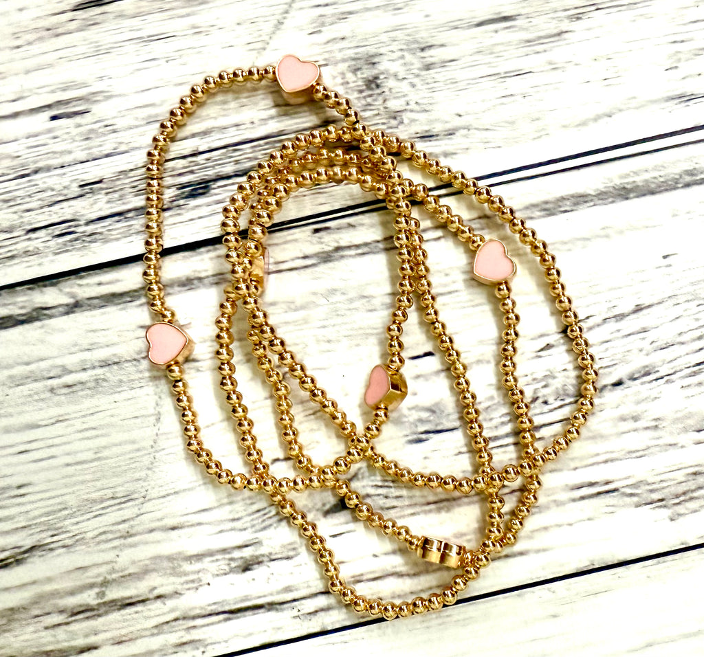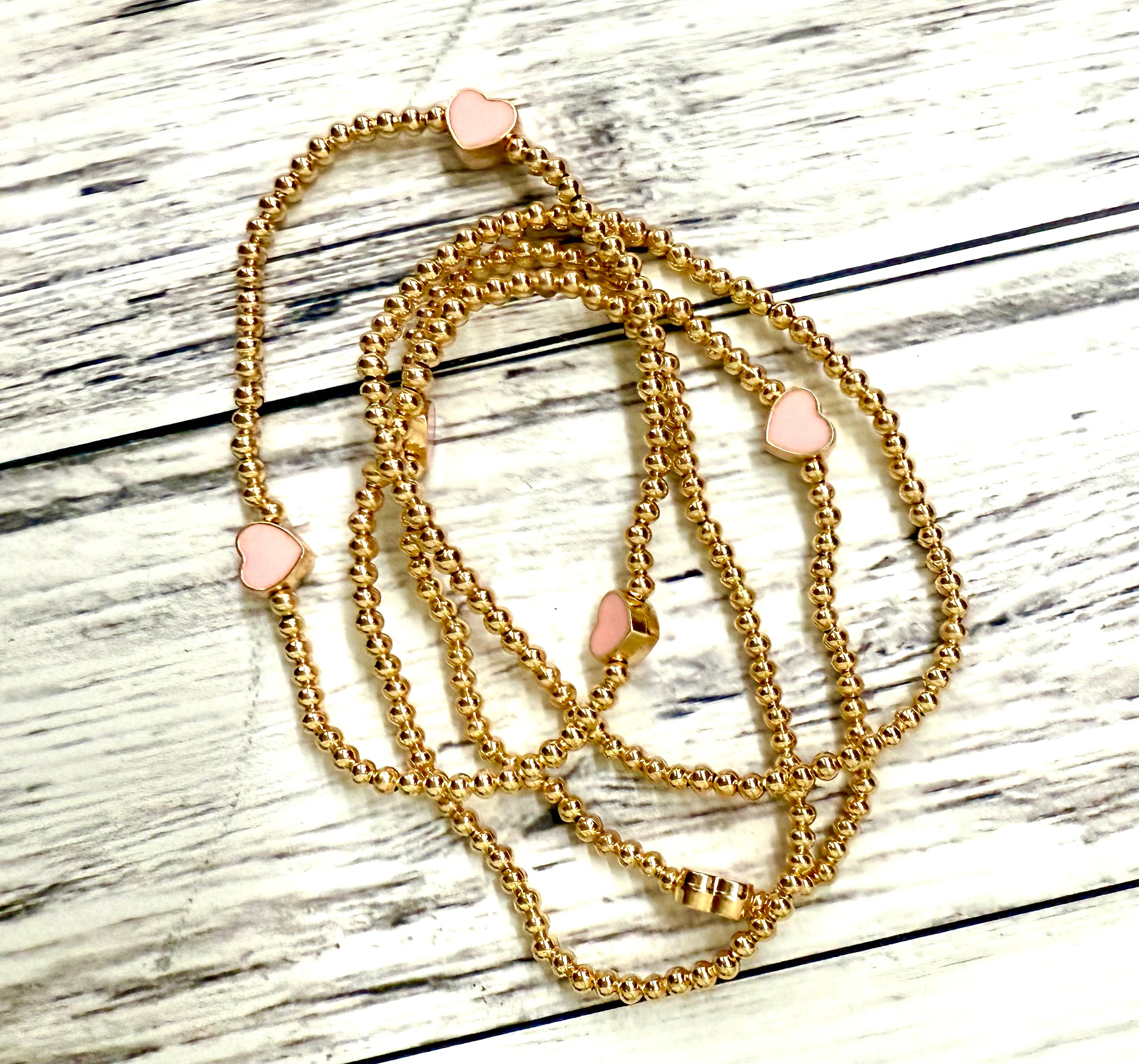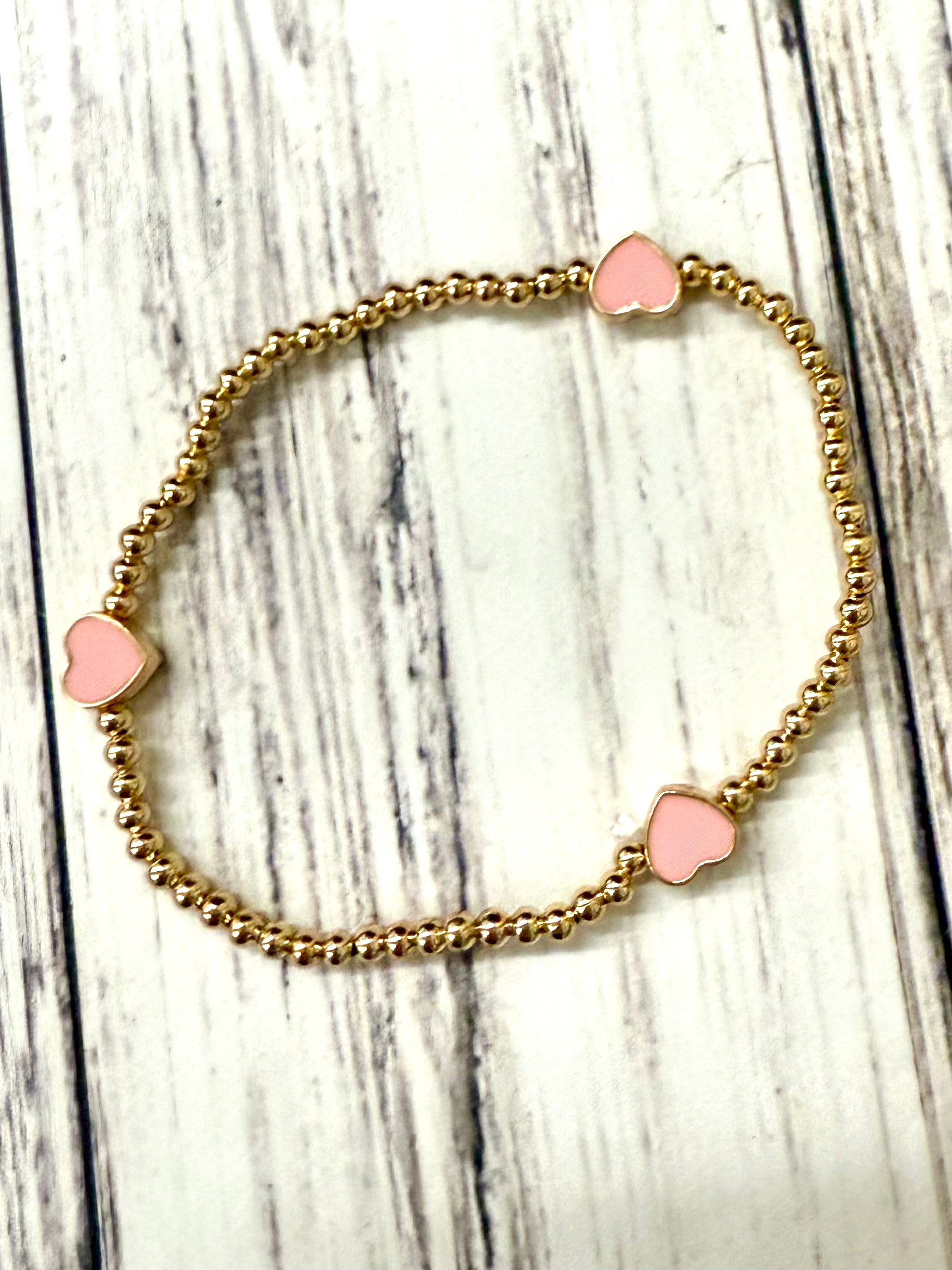 Show your love with the perfect gold beaded stretch bracelet. The pink hearts give it a touch of love!