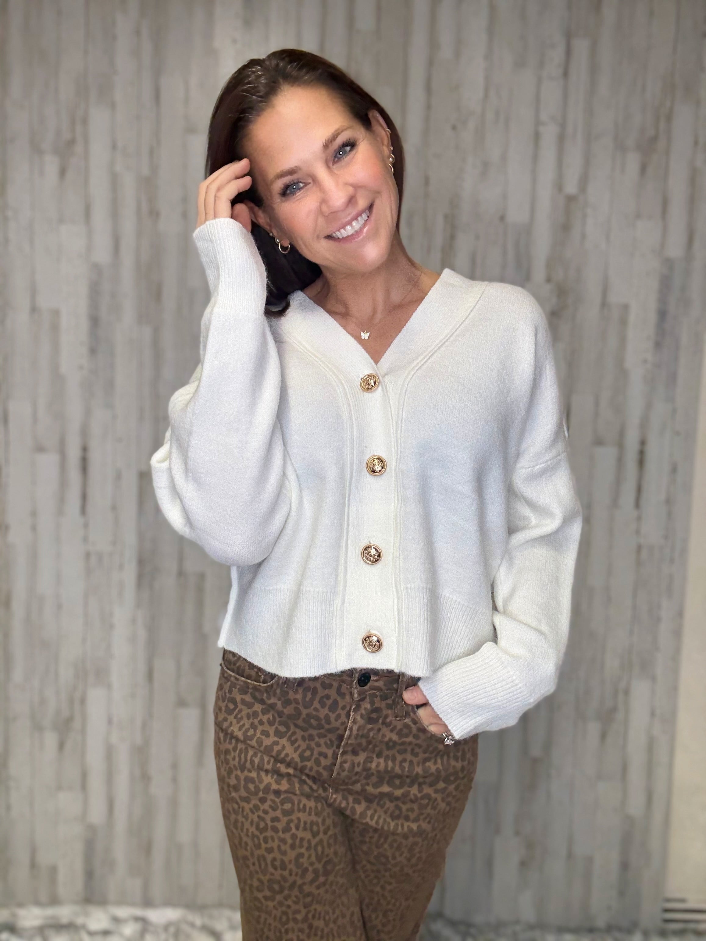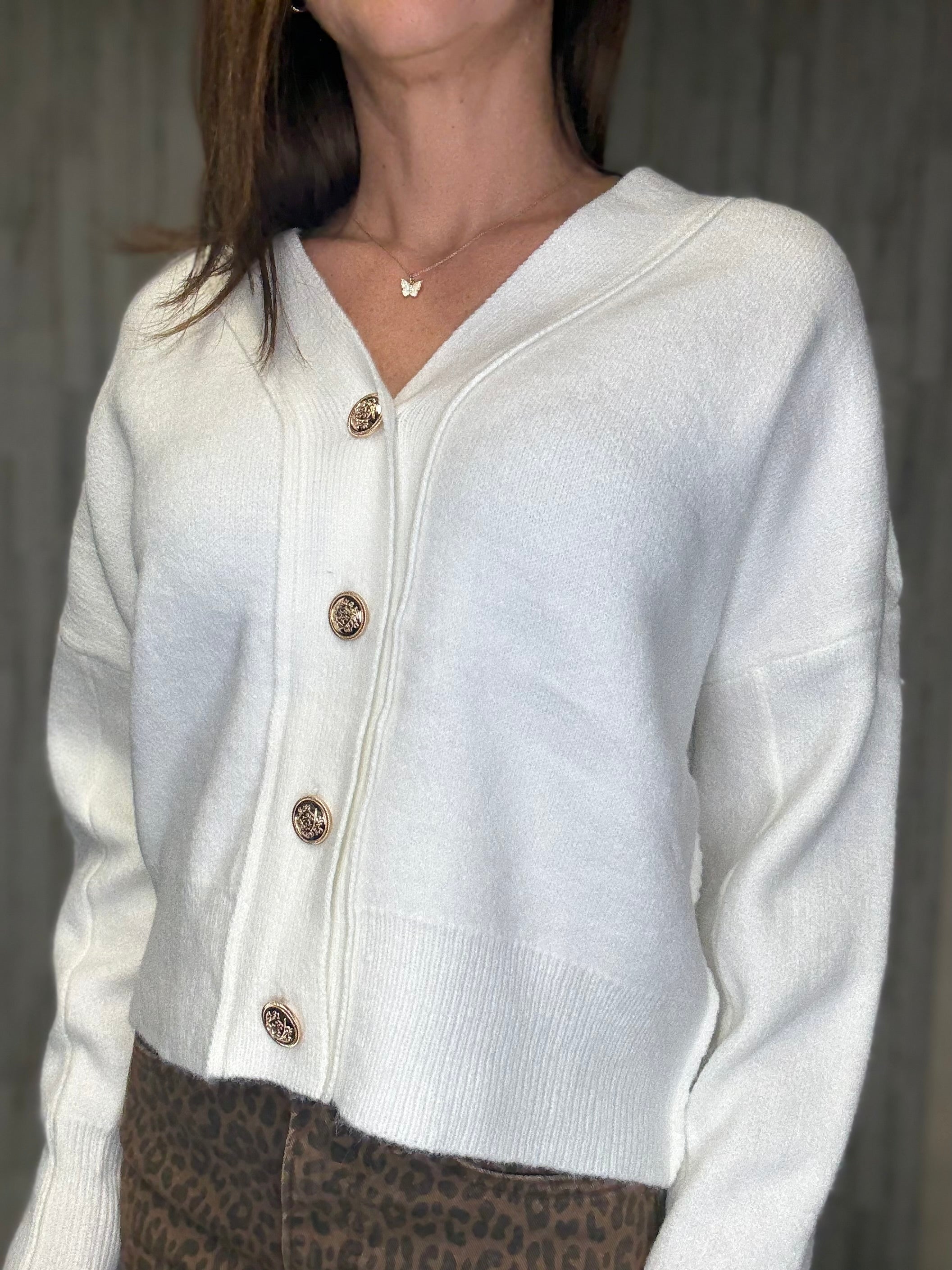 Cozy up in the cream-colored Polar Knit Cardigan, featuring a playful oversized fit that wraps you in comfort. The button-front and V-neck add charming detail, while ribbed hem and cuffs keep the look polished. Perfect for layering, this relaxed cardigan brings warmth and style to any casual outfit.