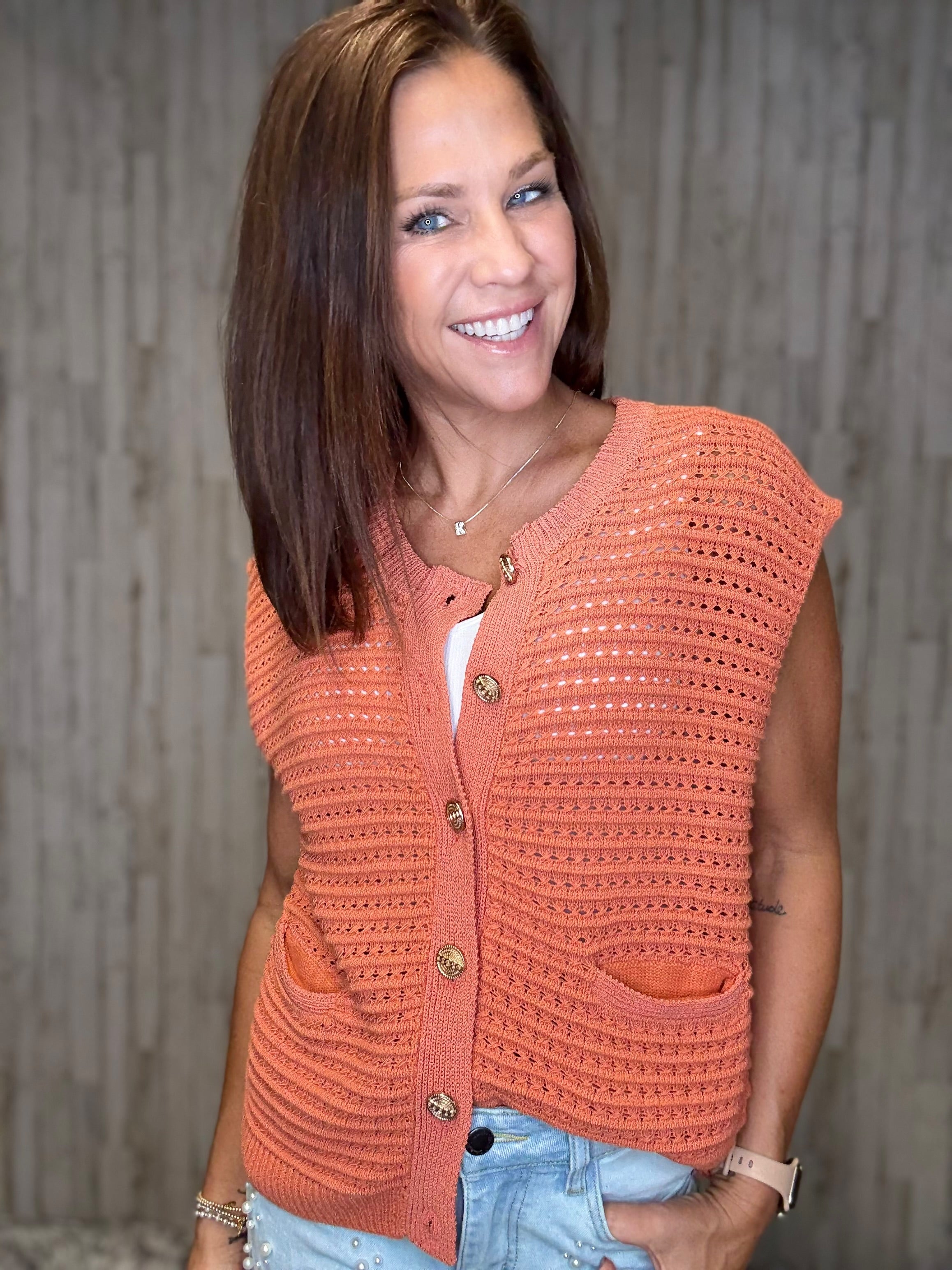 Embrace elegance and luxury with our Royal Crochet Vest. Hand-crafted with a U-neck and front buttoned closure, this tangerine vest exudes sophistication. Complete with pockets for convenience, its non-sheer and lightweight design adds a touch of grace to any outfit. Indulge in the beauty of crochet knit.