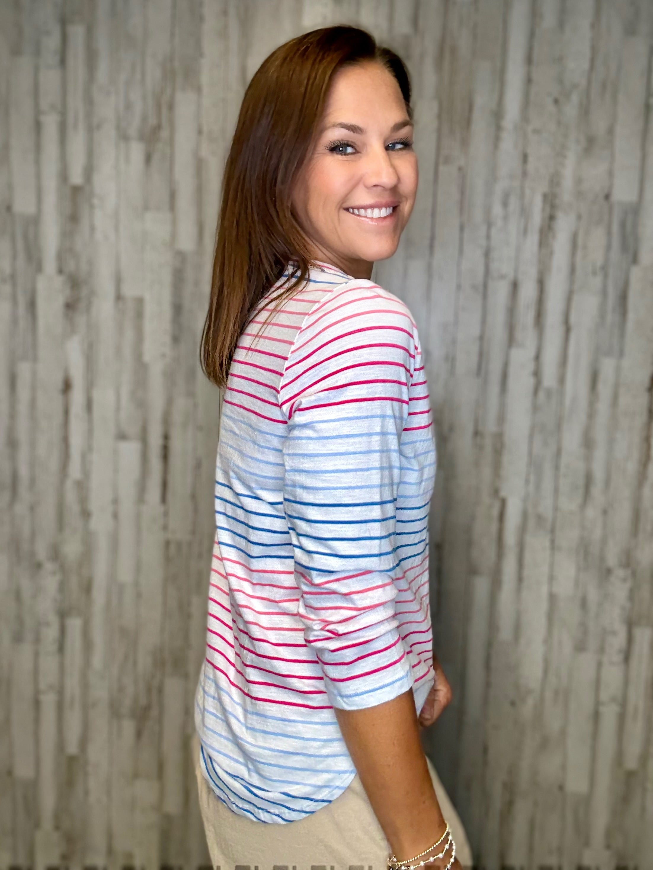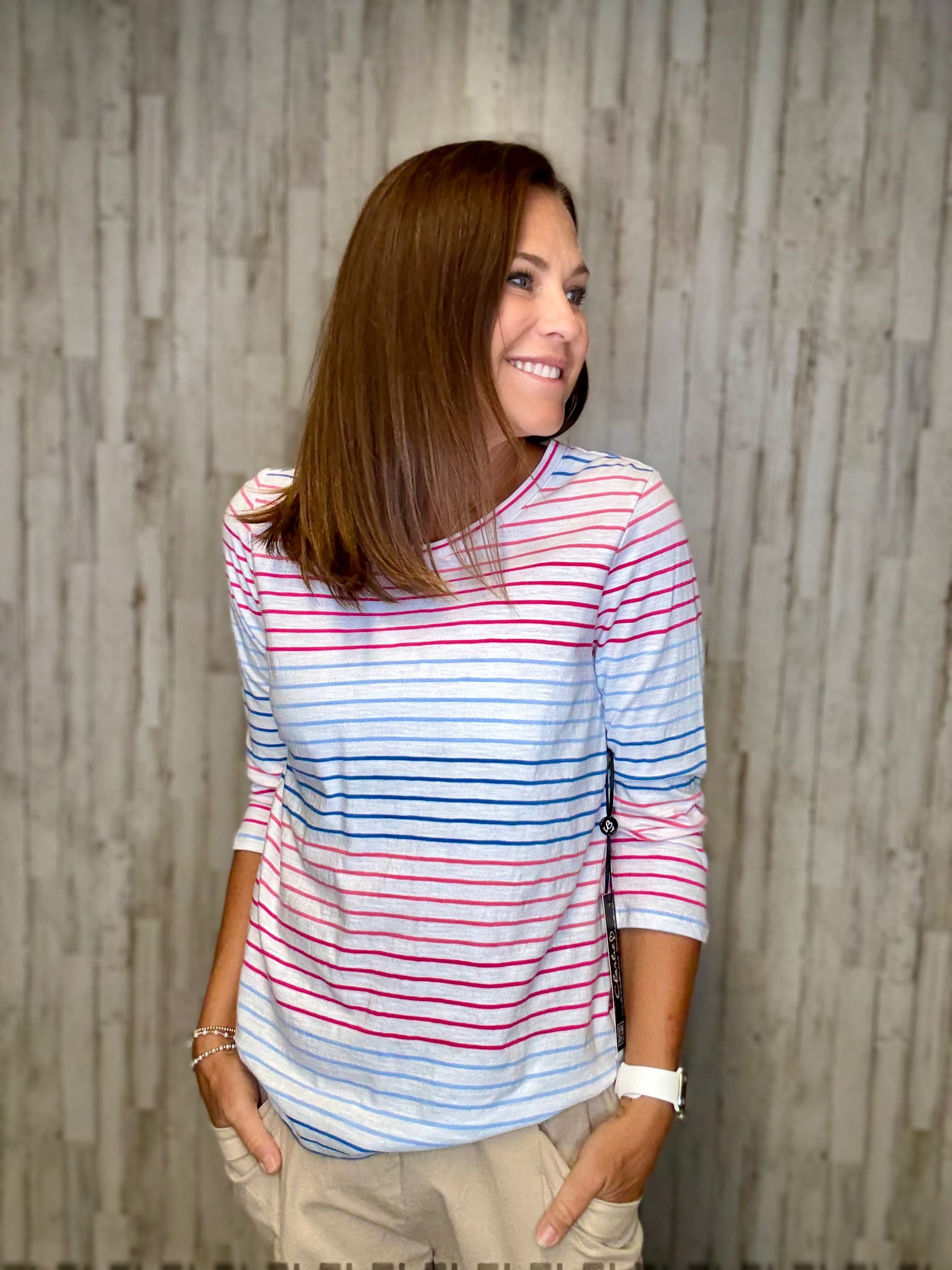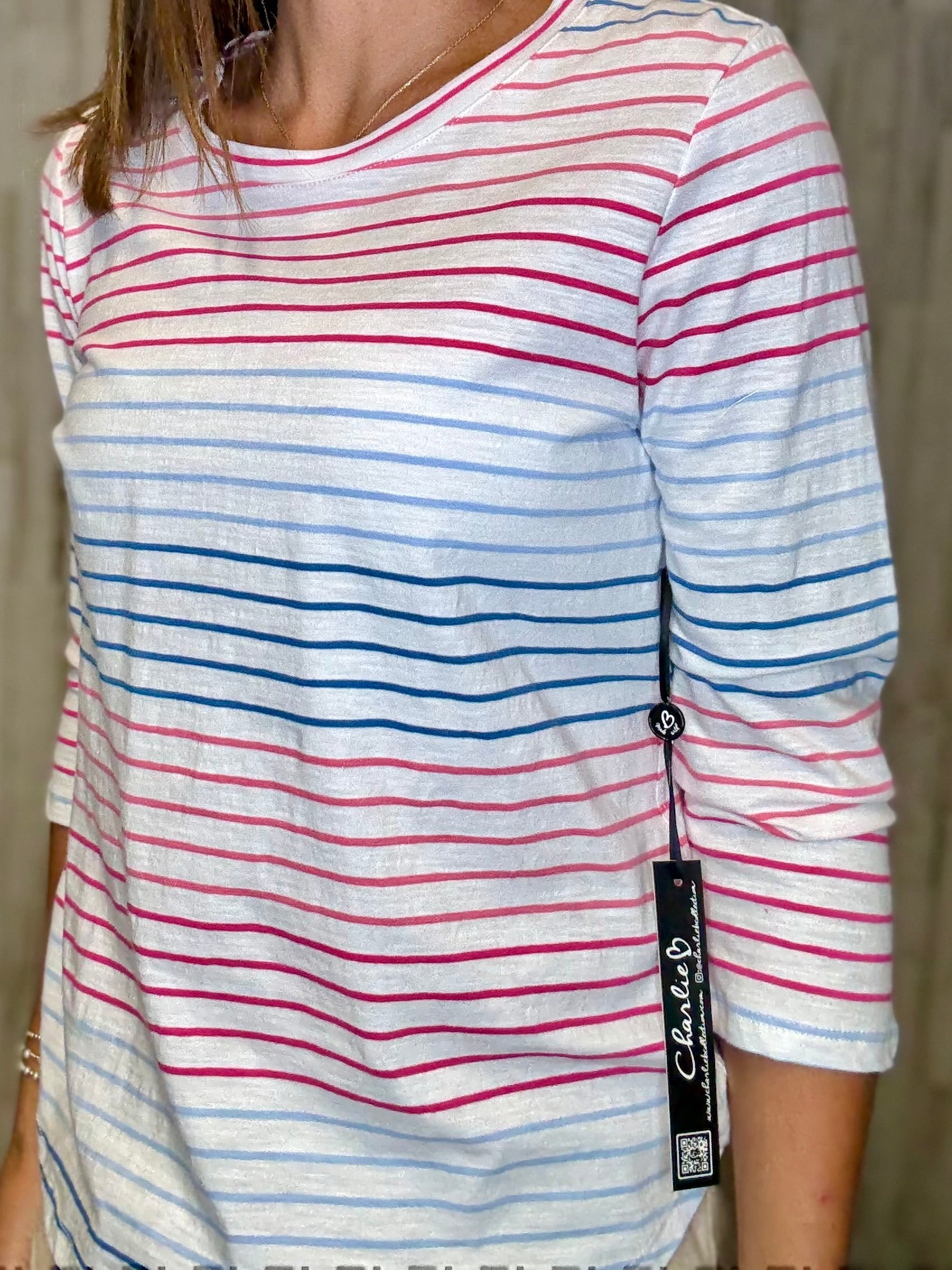 Experience comfort and style with Stripes are for Me - the 3/4 Sleeve Stripes Knit Top by Charlie B. This top features a trendy hi low hem and soft knit fabric, perfect for any occasion. Stay effortlessly chic with Stripes are for Me.